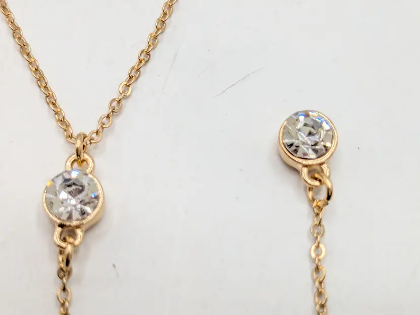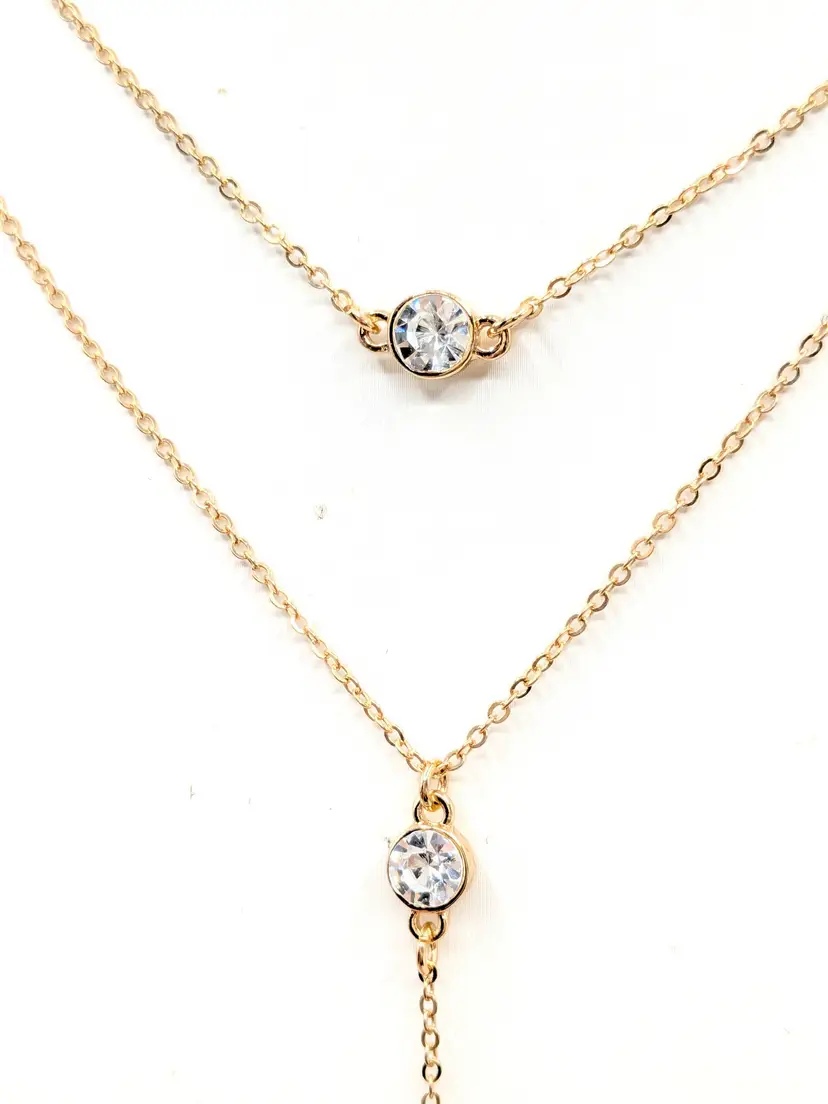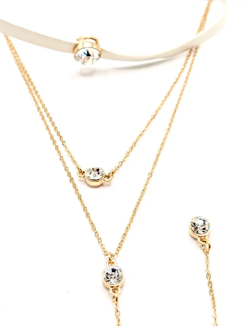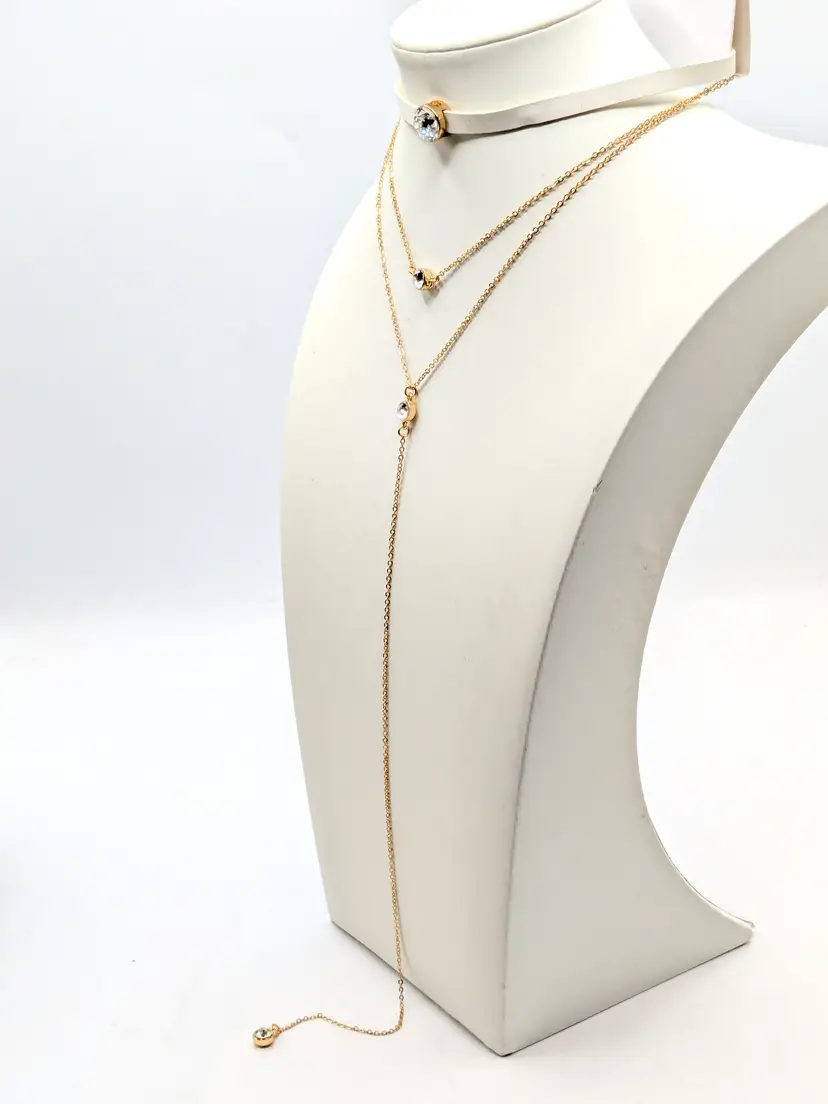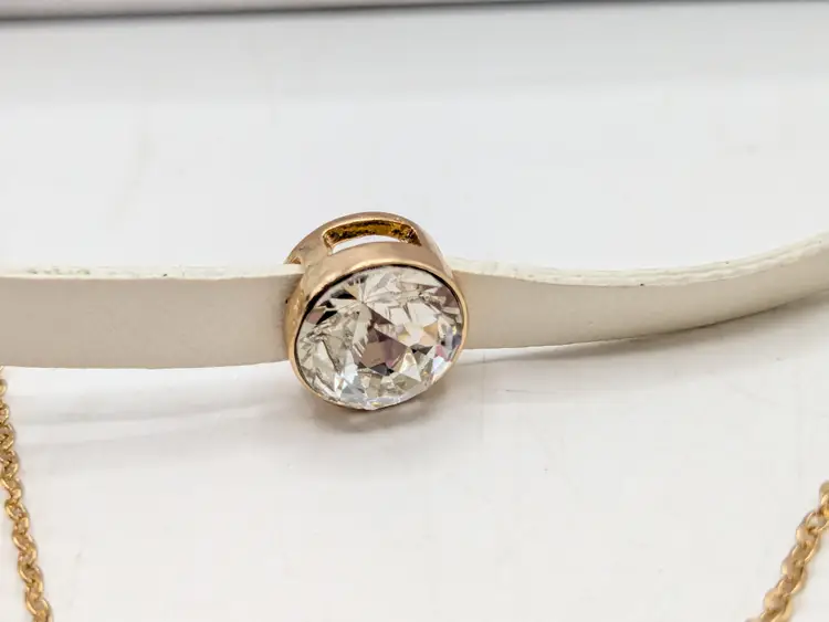 Good condition. New with tags. Features a chic layered design with striking faceted rhinestones. Set includes 2 separate necklaces. Faux leather white choker measures 13" with a 4" extender and a 1/4" wide. Chain necklace is 14"-16" with a 4" extender. Drop is 11". wen
