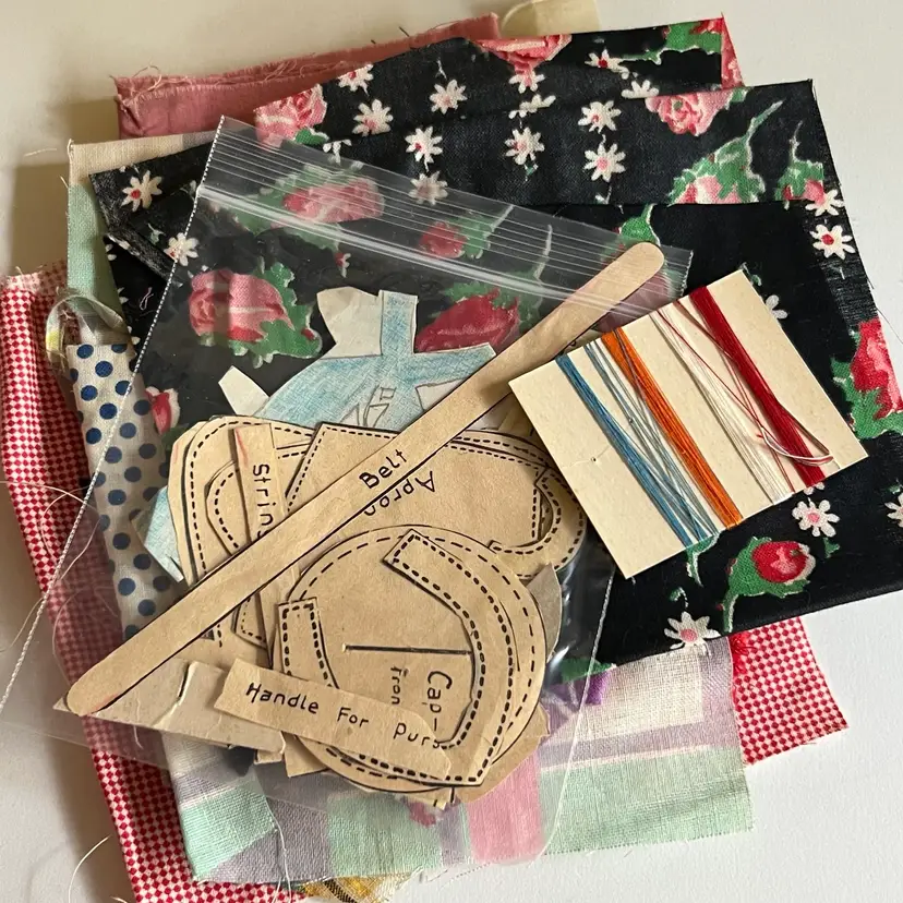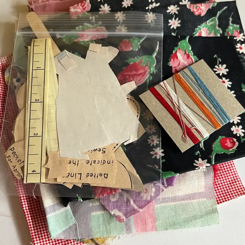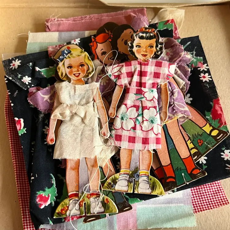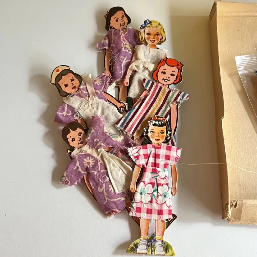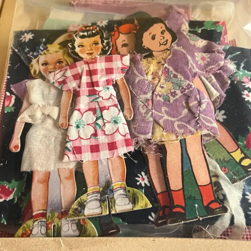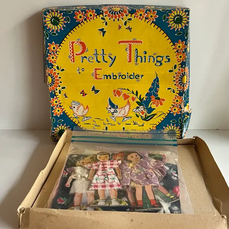 This is a very unique made in Canada paper doll set with a twist. It was intended that the little girls made clothing for them from bits of fabric. It comes with the pattern pieces and some of the fabric and the thread. I could see this being a really cool display! The box is definitely seen better days. Likely from the 40s. 9 1/2“ x 9 1/2“. Ships from Canada.