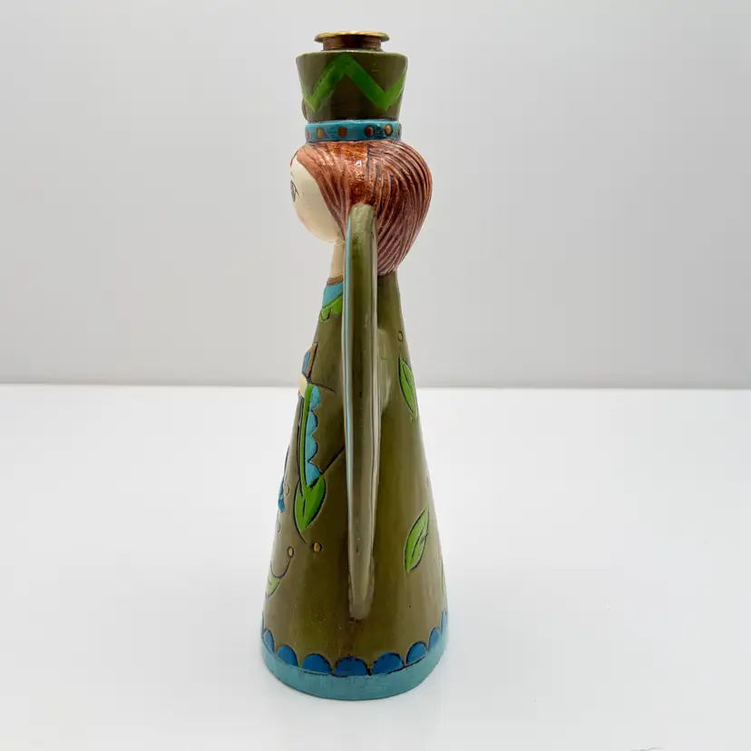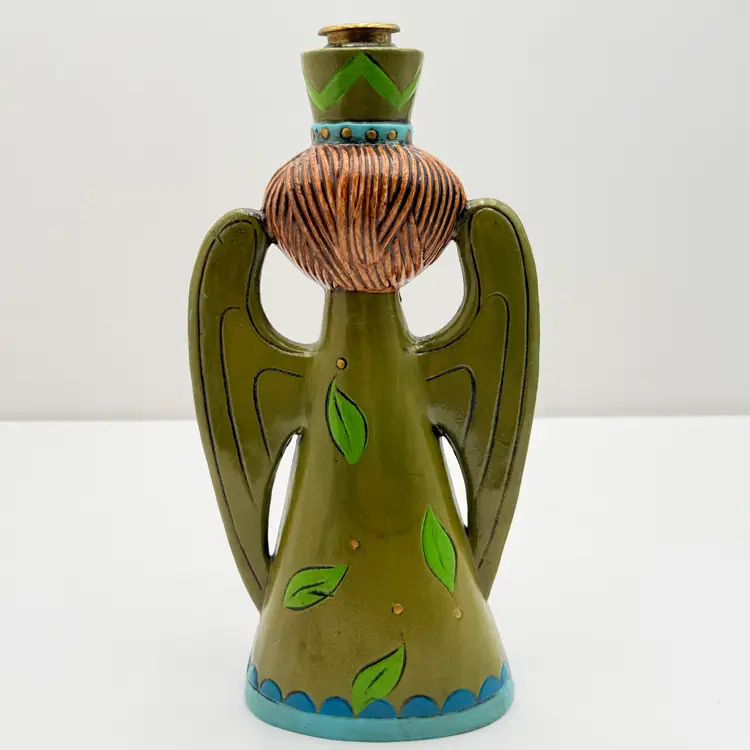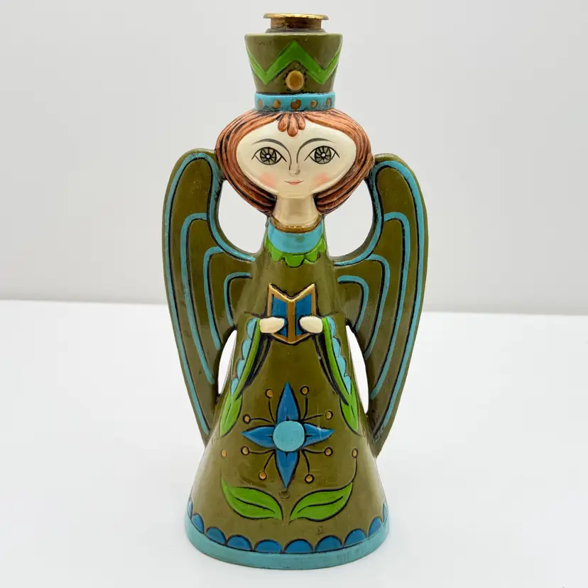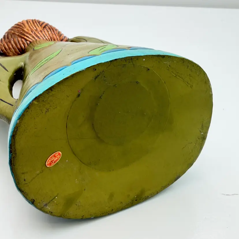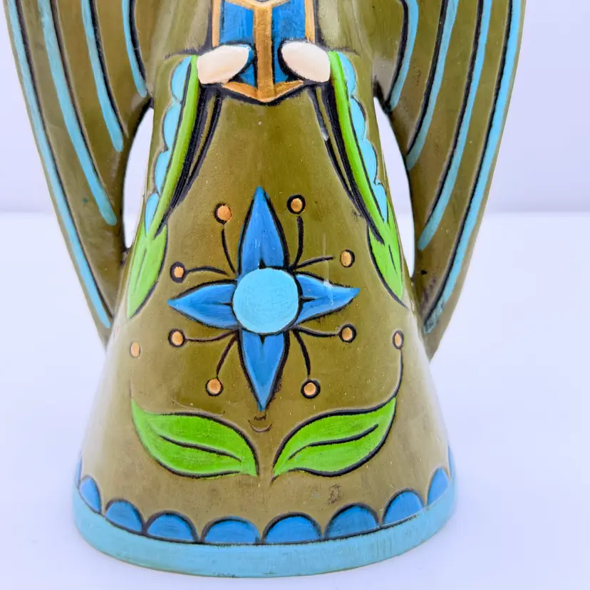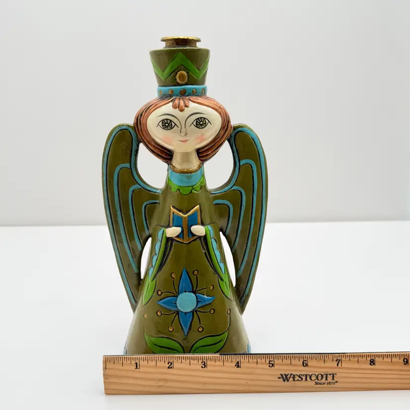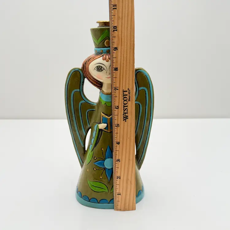 She may be perfect for the holidays or if you are a lover of angels she is perfect to keep out all year long. This mid century designed angel is a large paper mache candle holder in a pretty green and blue floral design dress. She stands just over 10 inches tall and approximately 5 inches. Her condition is very good with no cracks or missing paint. The metal candle piece does extend over the top of the angel.