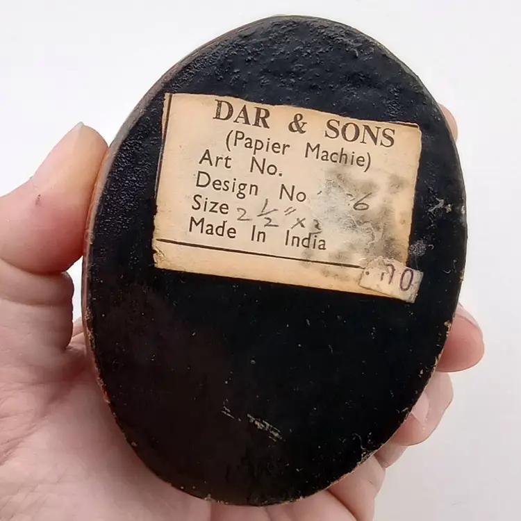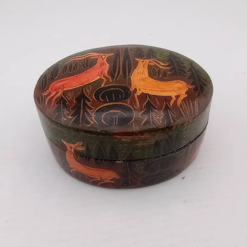 This is a pretty little paper mache trinket box from Inda. The deer decoration is in beautiful fall colors. It's in excellent vintage condition with no noted damage.