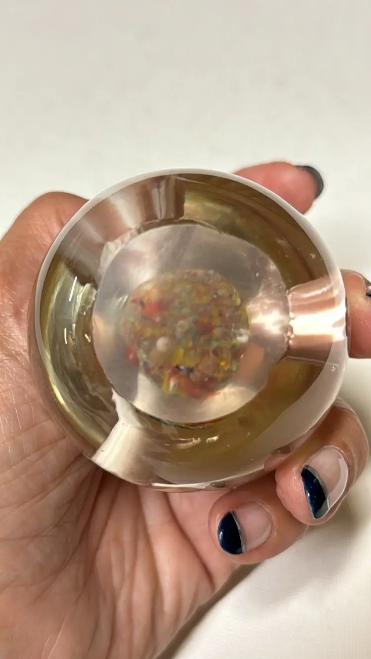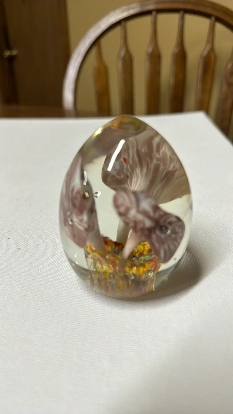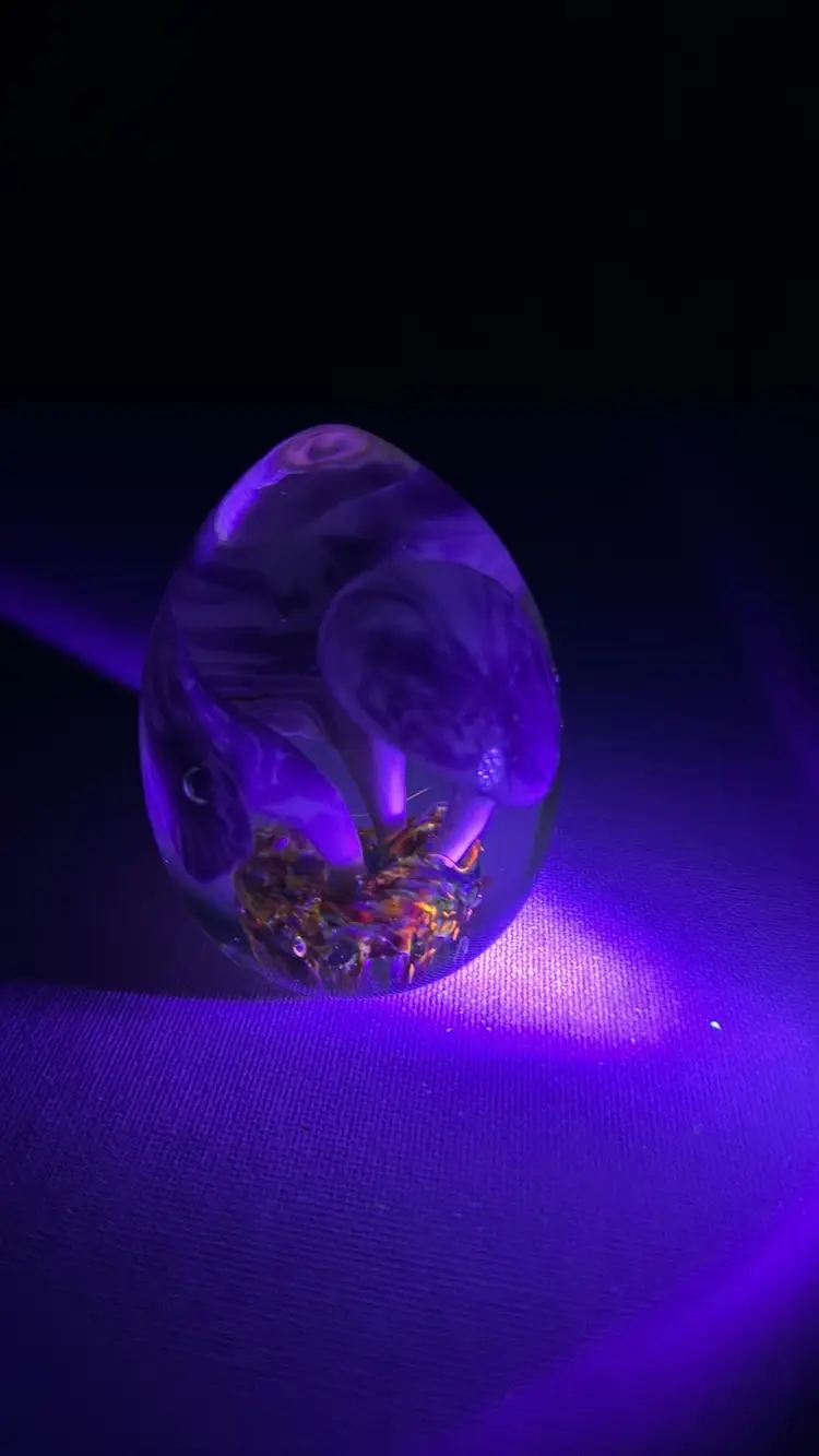 Paperweight art glass egg shape the colorful speckles on the bottom glow under black light White and beige flowers or mushrooms 3.5” tall Nice condition with no breaks or chips (710182411)