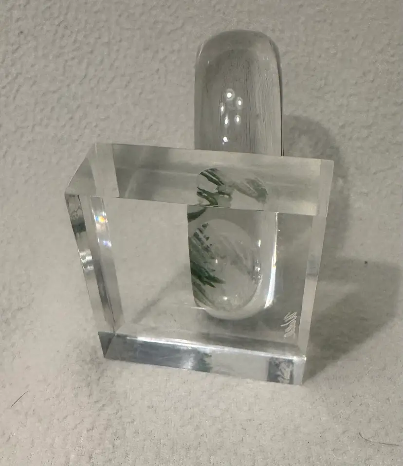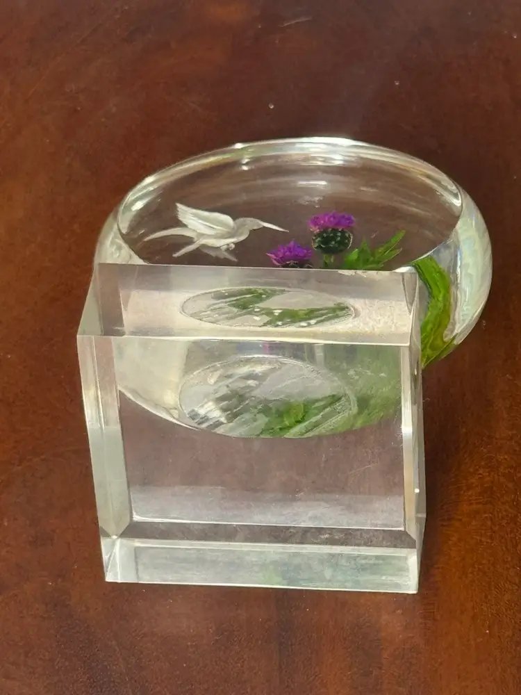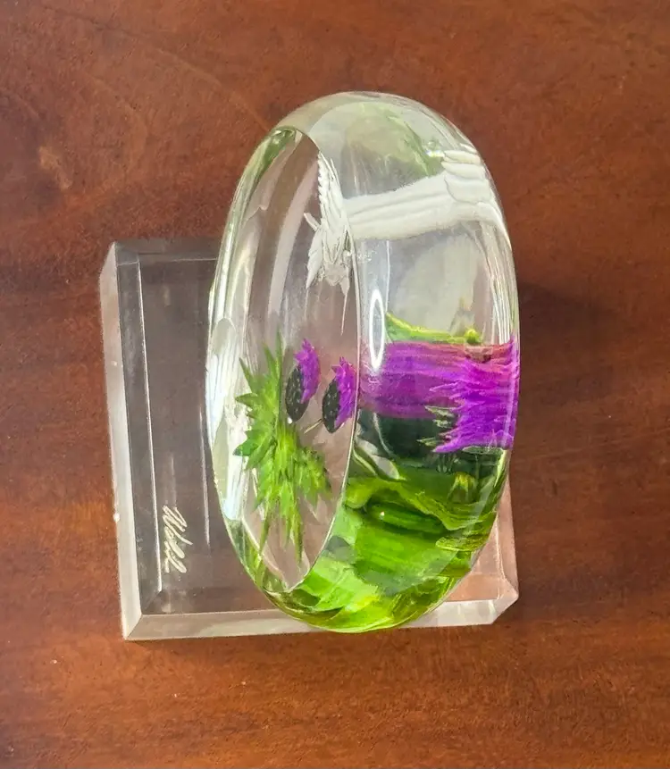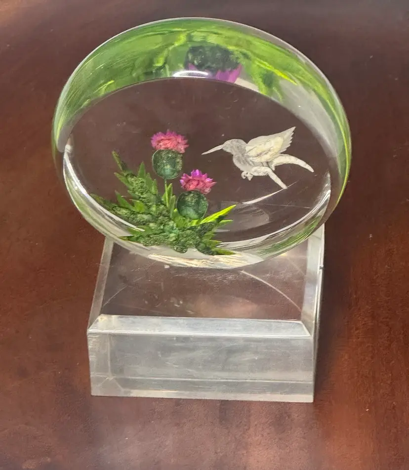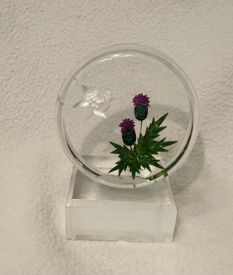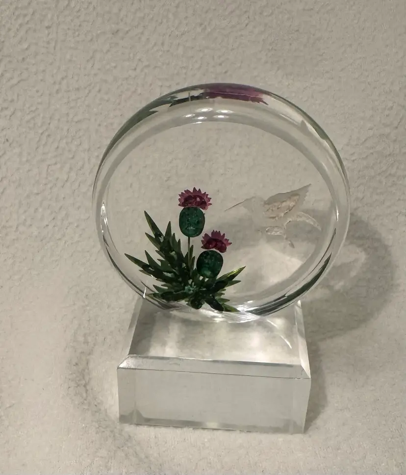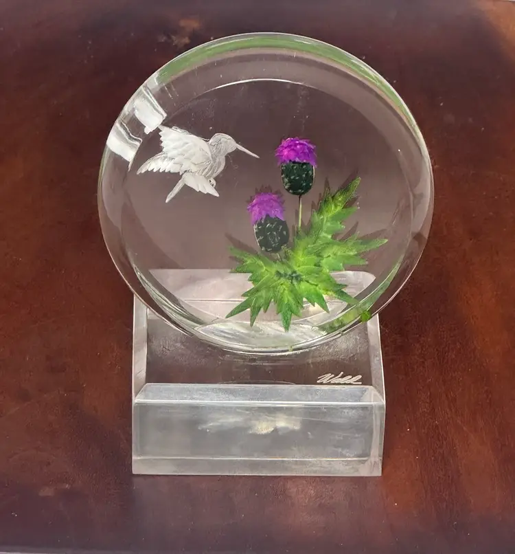 Acrylic lucite hummingbird and thistle paperweight/sculpture signed Wald. Pre-owned in excellent condition. A lovely addition to your collection. 3 X 4 in.