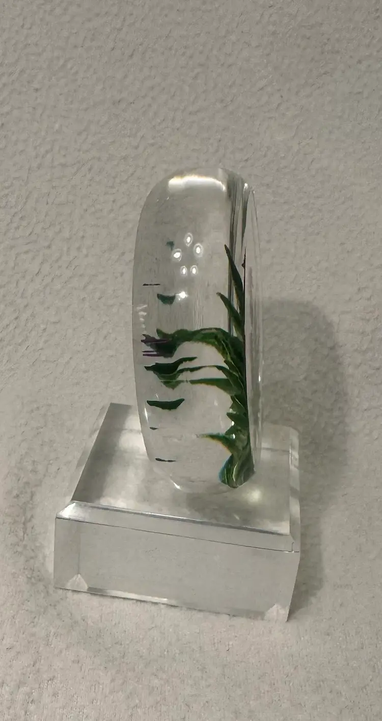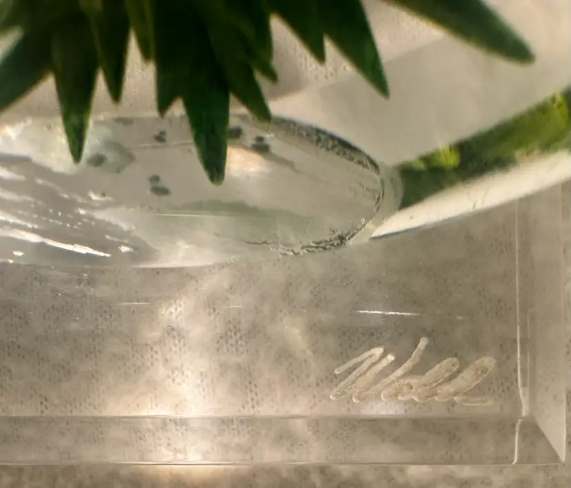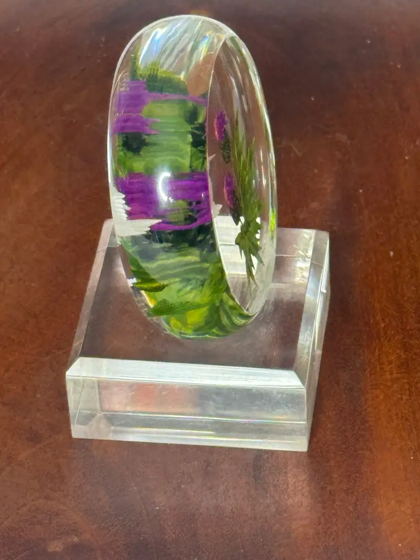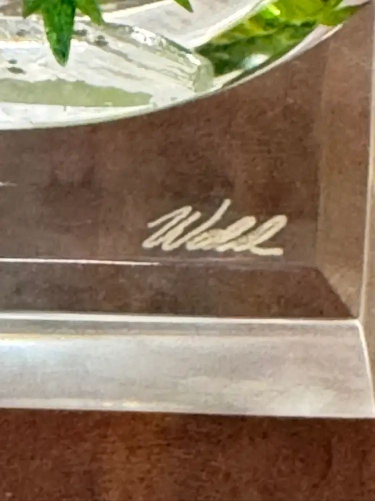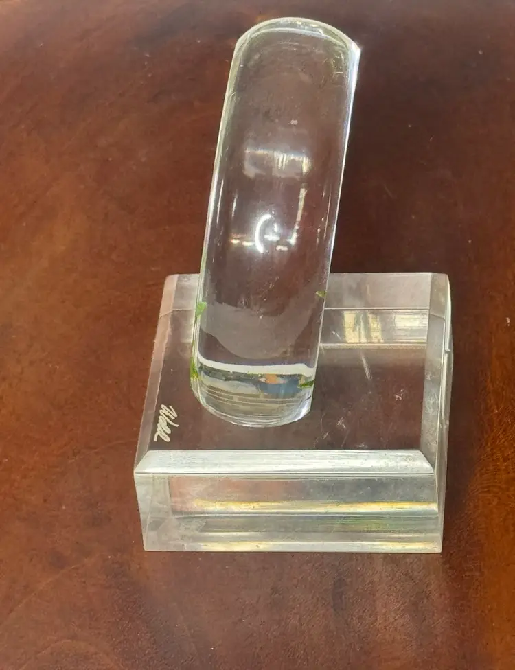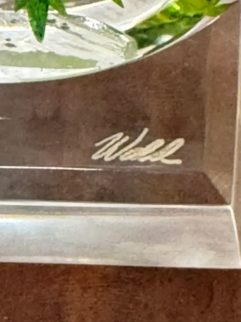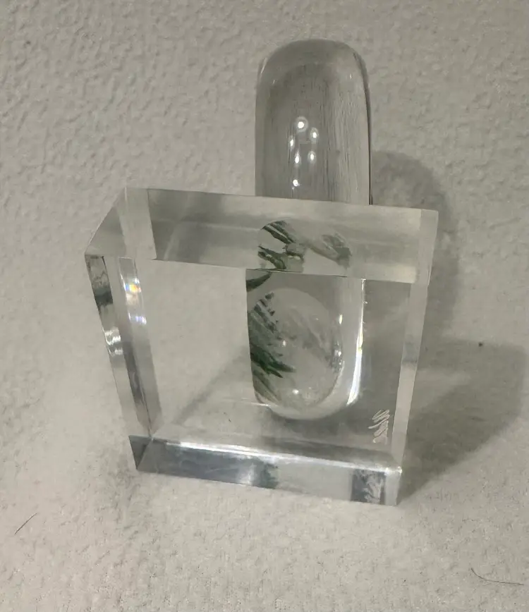 Acrylic lucite hummingbird and thistle paperweight/sculpture signed Wald. Pre-owned in excellent condition. A lovely addition to your collection. 3 X 4 in.