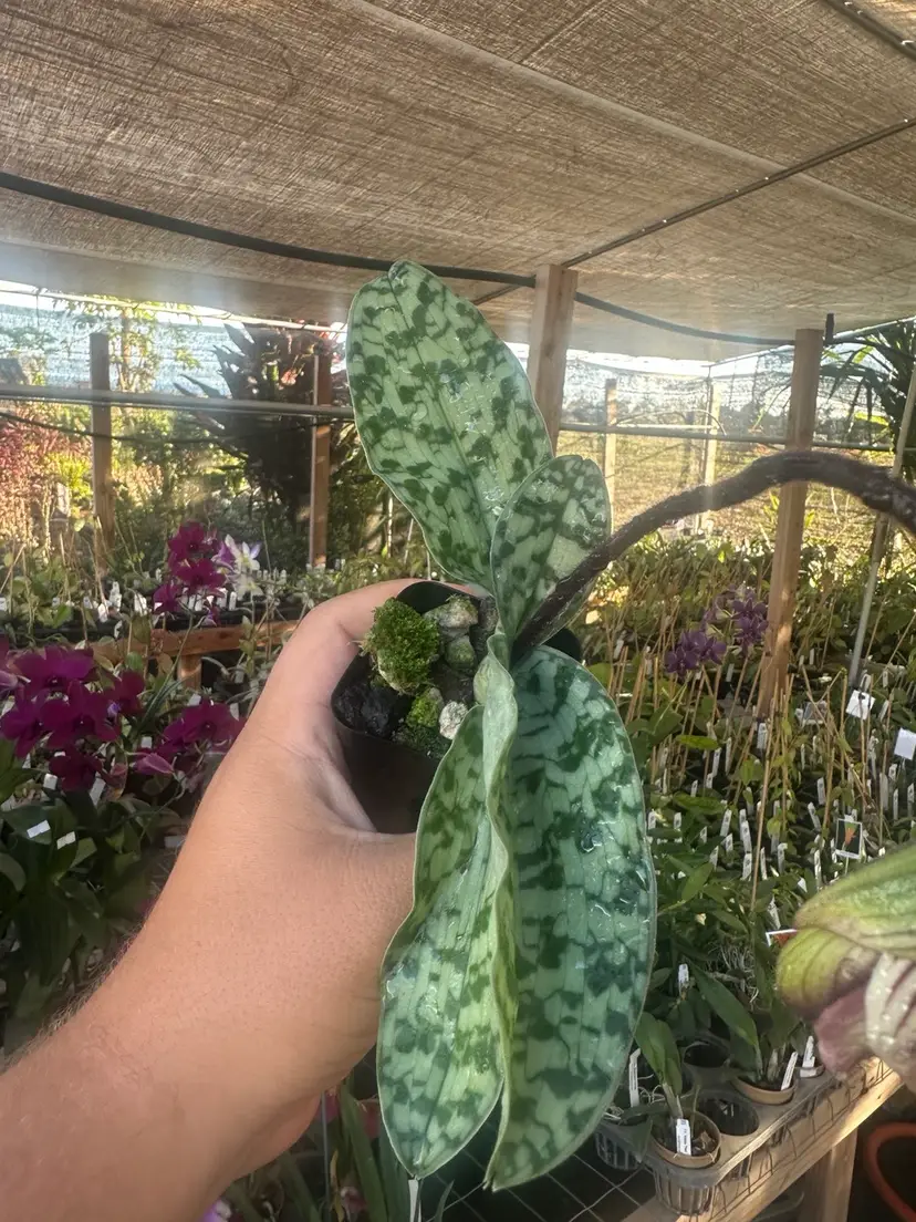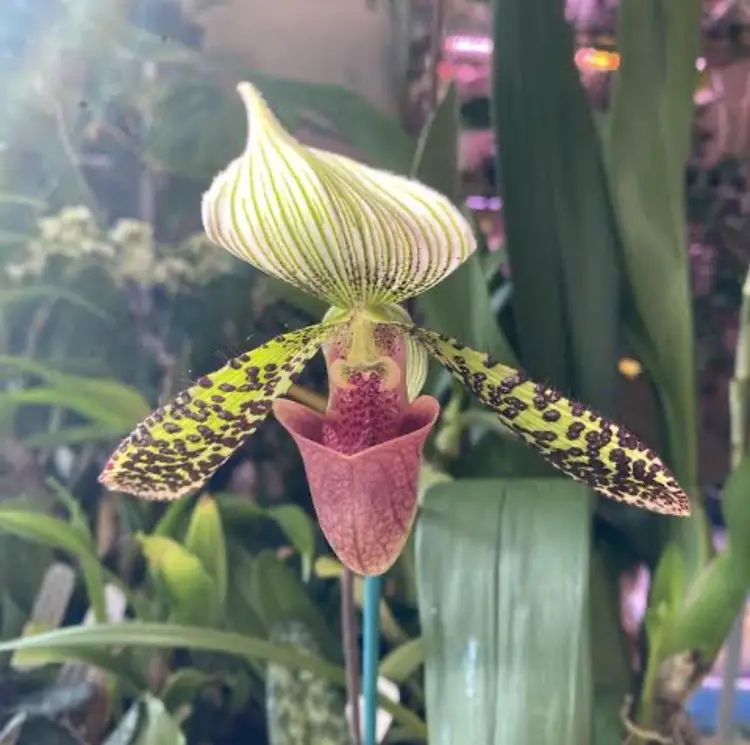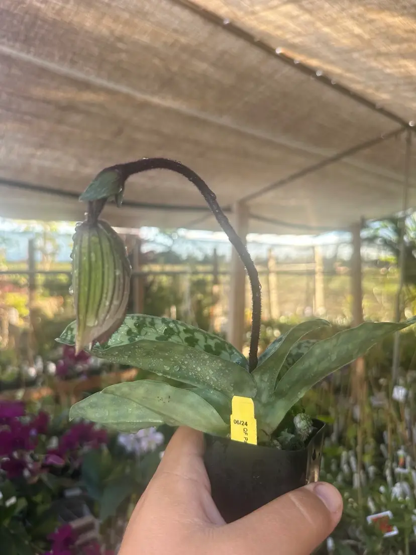 This is a hybrid of Paph. sukhakulii and argus. Plant is actively growing in orchid bark/perlite mix in a 2” pot. Some plants currently are in spike and are close to blooming.