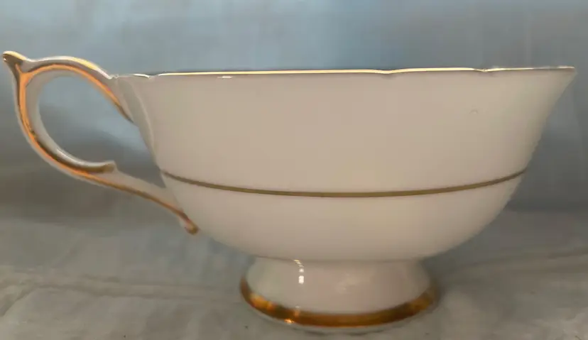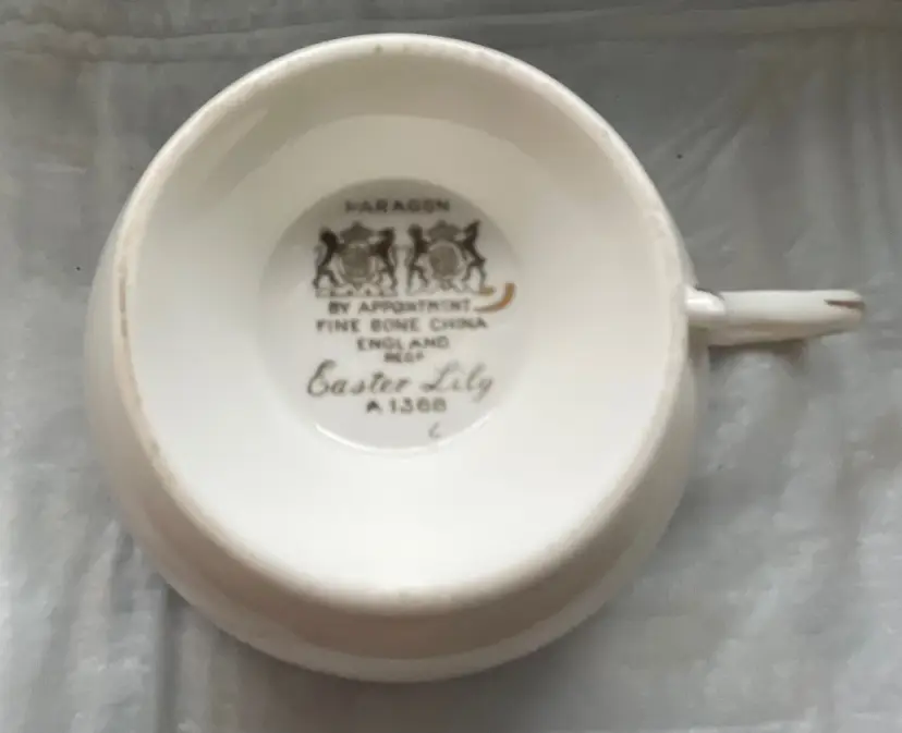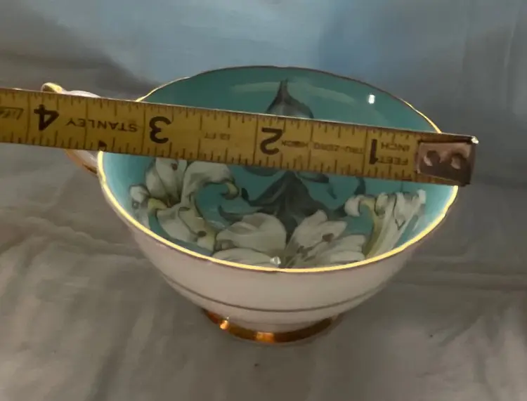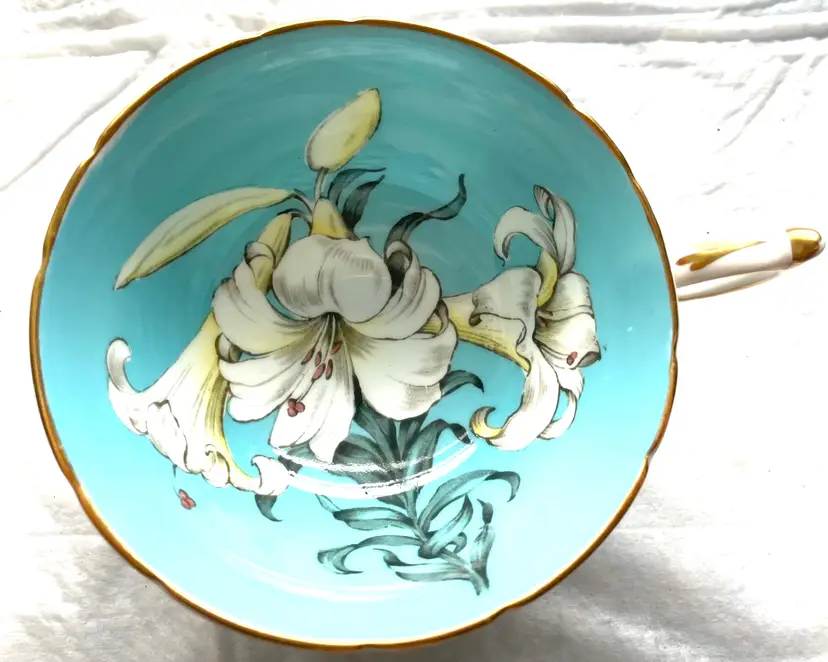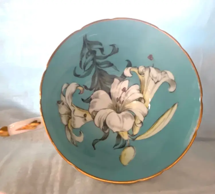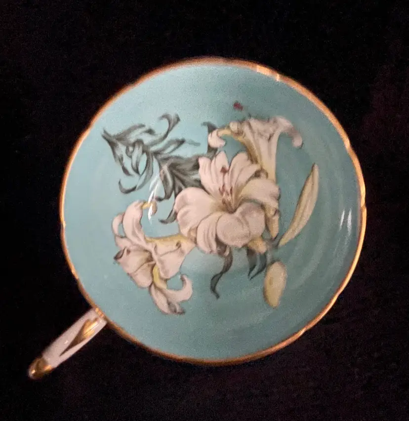 Paragon “Easter Lily” replacement Tea Cup. Turquoise blue with white flowers. This tea cup is in beautiful condition with no wear on gold trim and No chips or cracks. . Please view all pictures zoomed in so you can see the great condition of the gold trim. The grooves you see on the brim are not chips they are part of the beautiful design of this stunning tea cup!!!Vintage-1940’s
