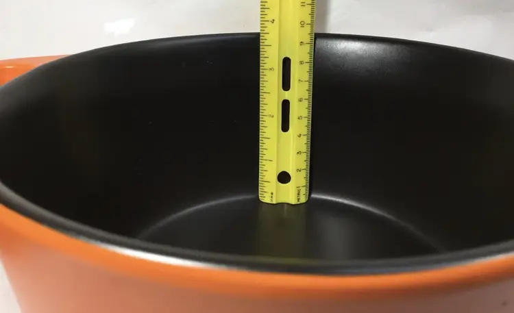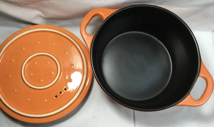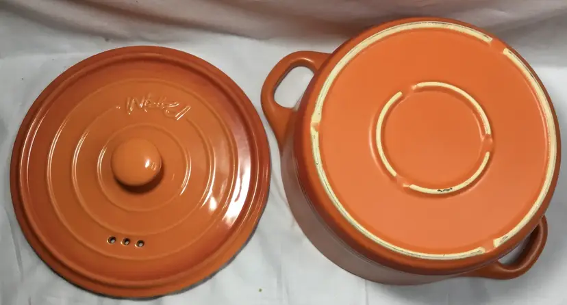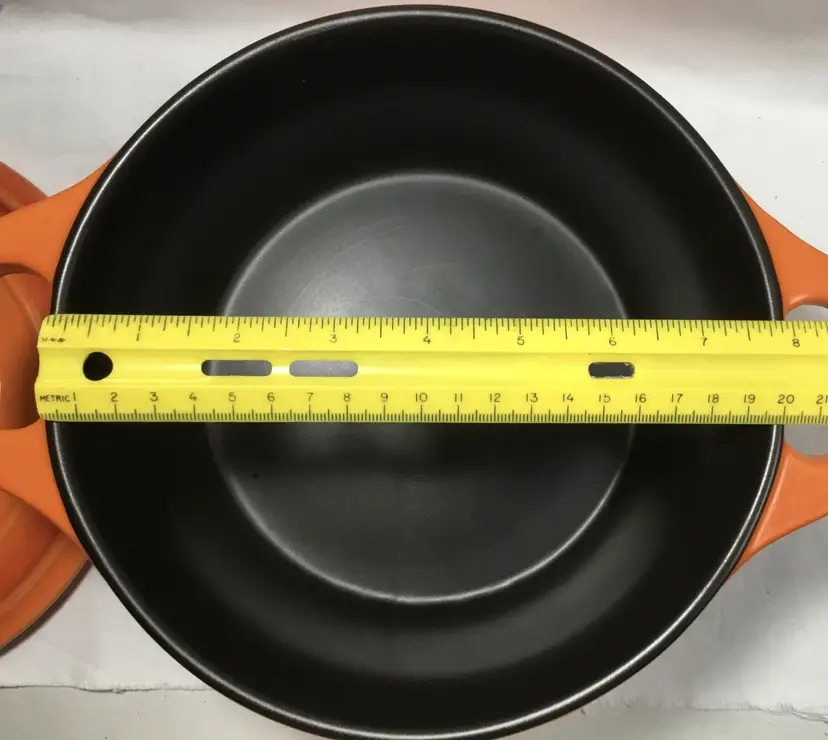 8 inches in diameter, round ceramic casserole or Dutch oven with lid. Appros. 4 inches deep. Orange glaze on exterior, round knob on lid. Lid has 3 steam escape holes. Black, non-stick interior. Parini brand.