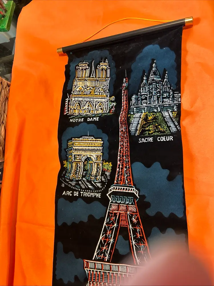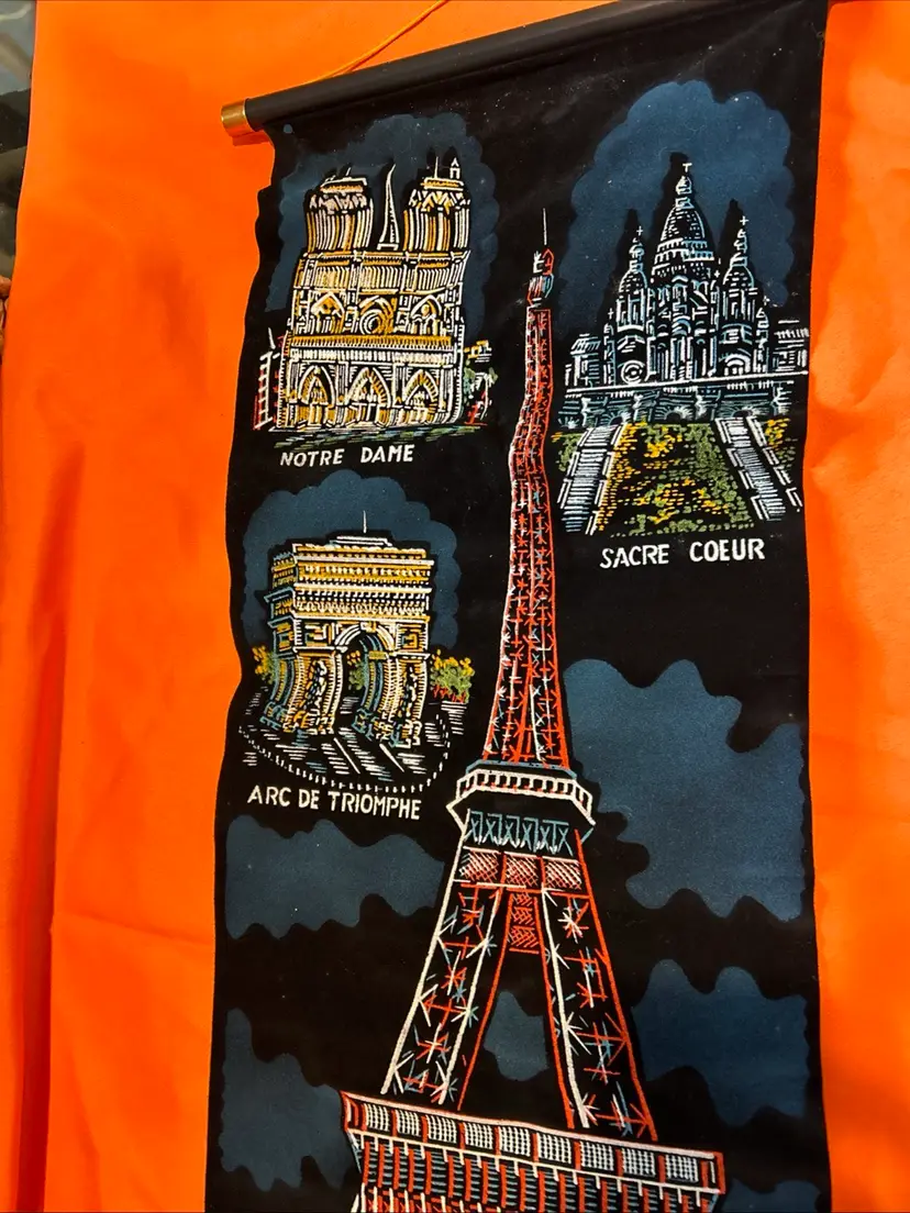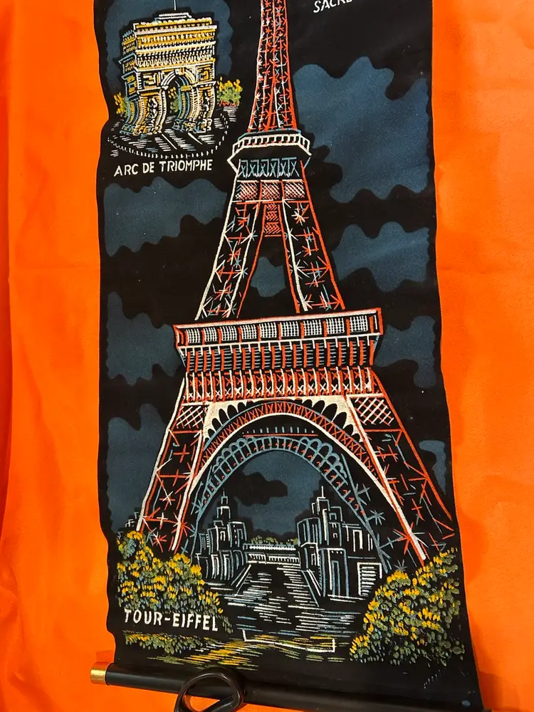 The Paris Package vintage 1980 decoration banner is a collectible souvenir featuring four top tourism marvels of France: the Eiffel Tower, the Sacré Cœur, the Arc de Triomphe, and Notre Dame. This item serves as a unique memorabilia piece for those who have visited or want to reminisce about their trip to Paris. With its vintage design and French origin, this souvenir banner captures the essence of Paris's iconic landmarks and makes it a special addition to any collection of travel memorabilia.