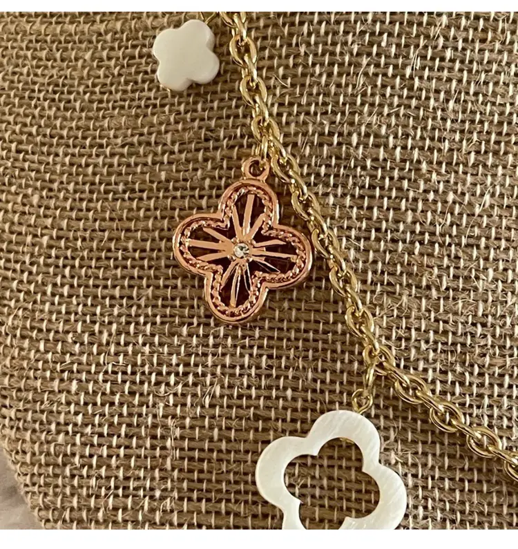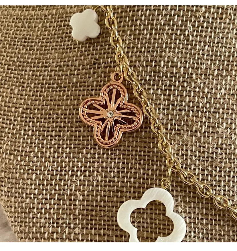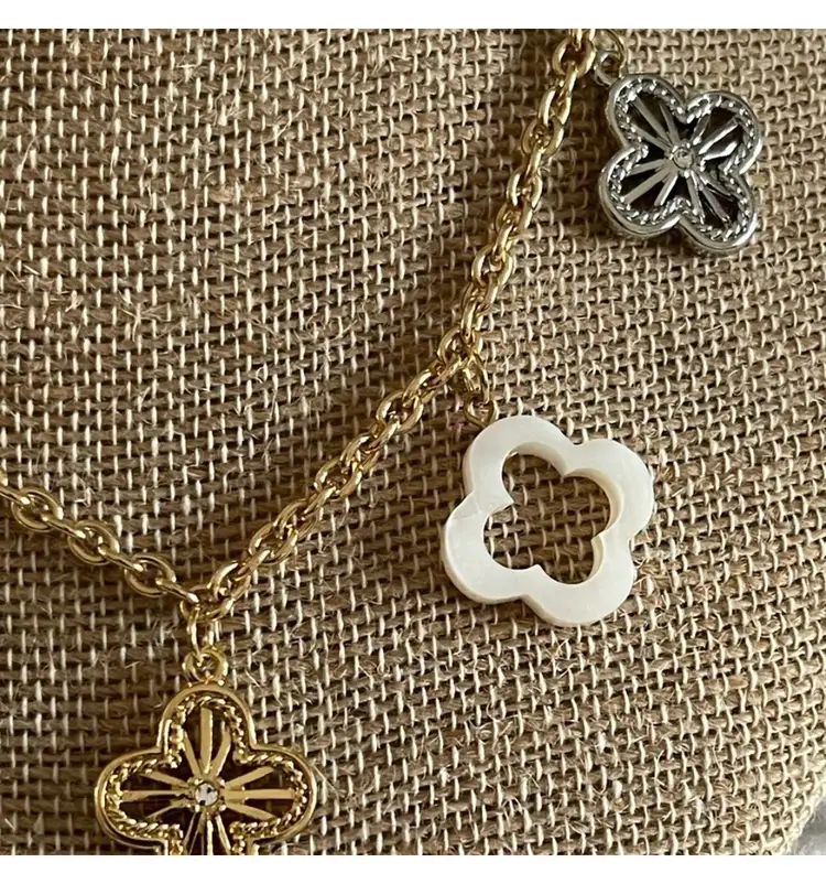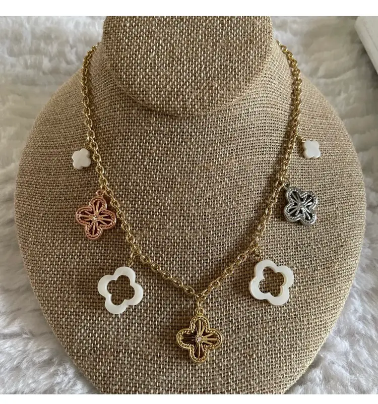 Necklace by Jewels of Park Lane. Clover-shaped charms in mother-of-pearl, silver, gold and rose gold are suspended from a golden chain in this tri-color necklace. Each clover is accented in the center with a sparkling Austrian crystal. Necklace measures 16" with a 3" extension and closes with a lobster claw clasp