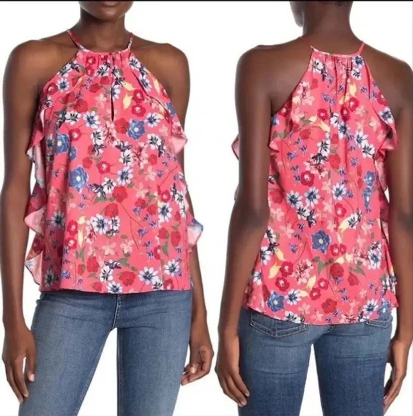 Bright coral dressy tank with layered ruffles on the sides Halter neckline-snap in front with keyhole detail Flirty and fun floral top. Feminine and beautiful
