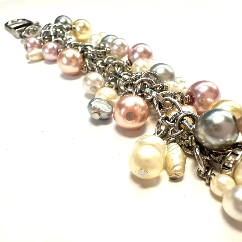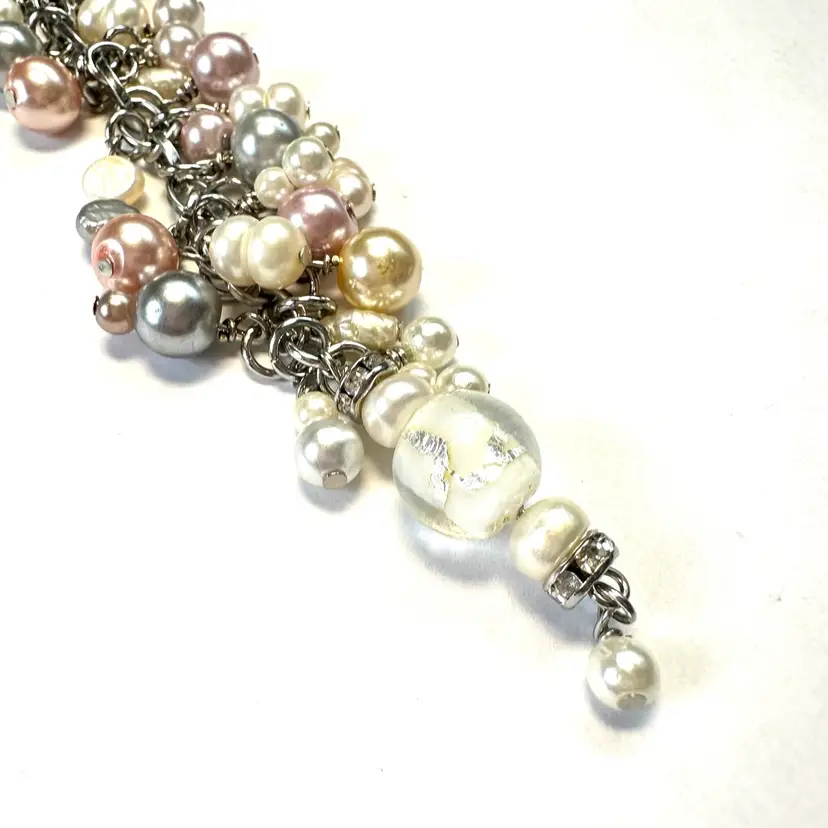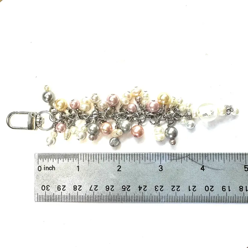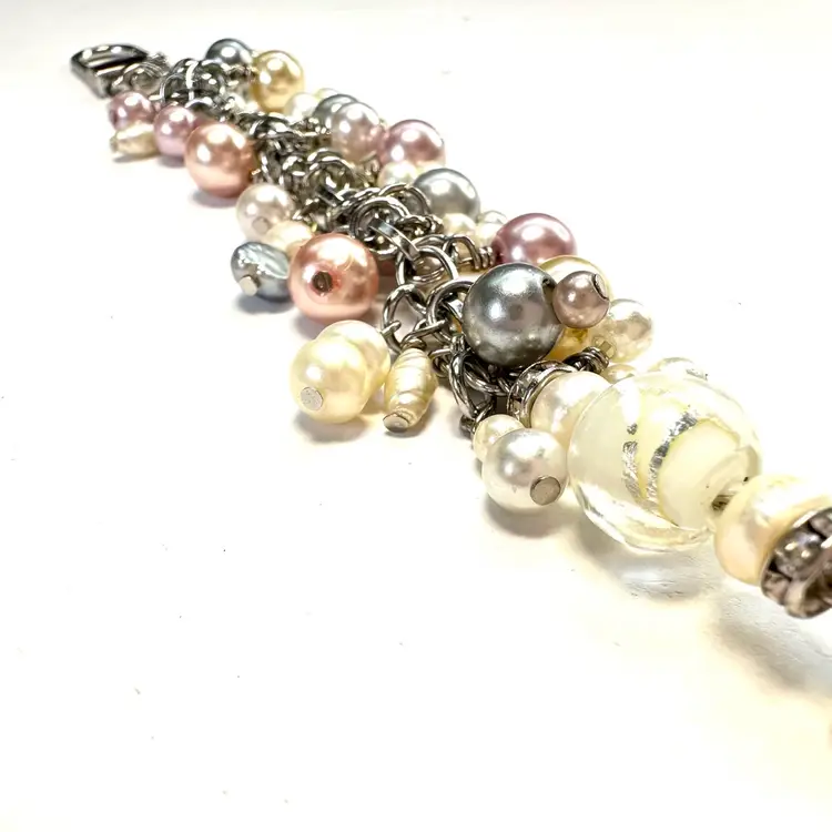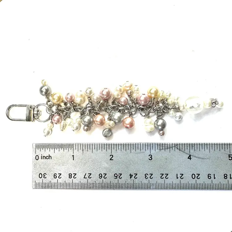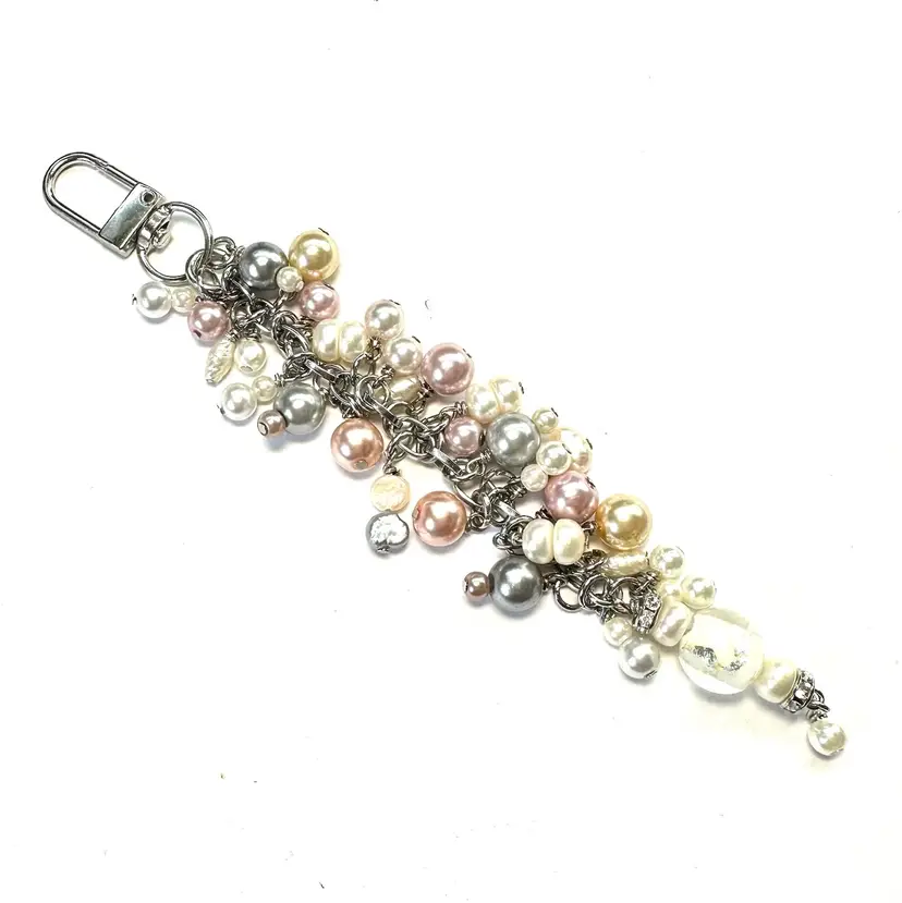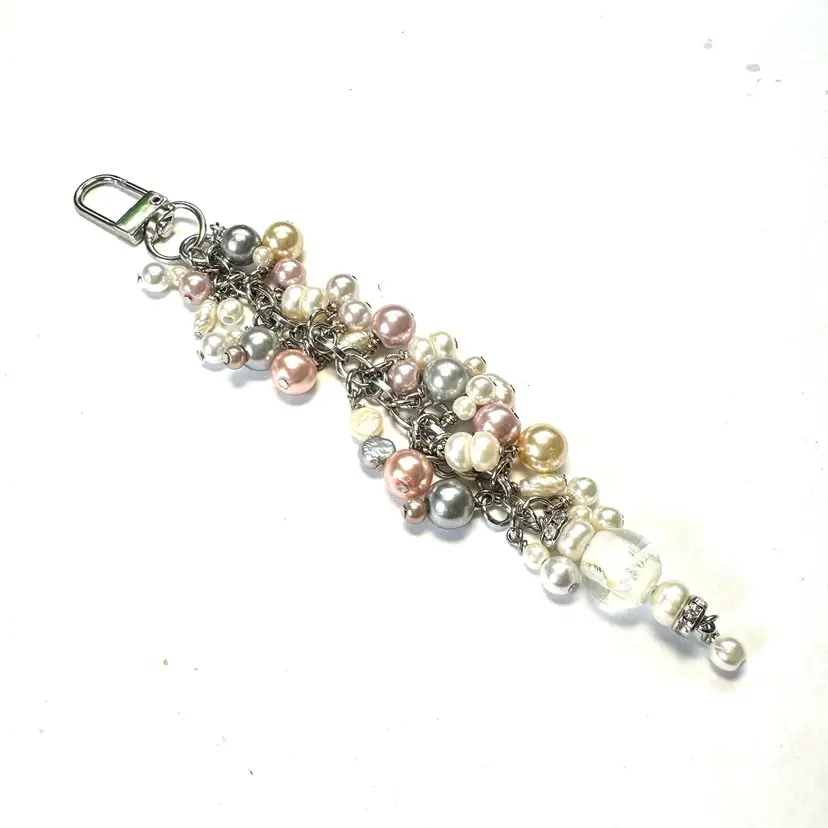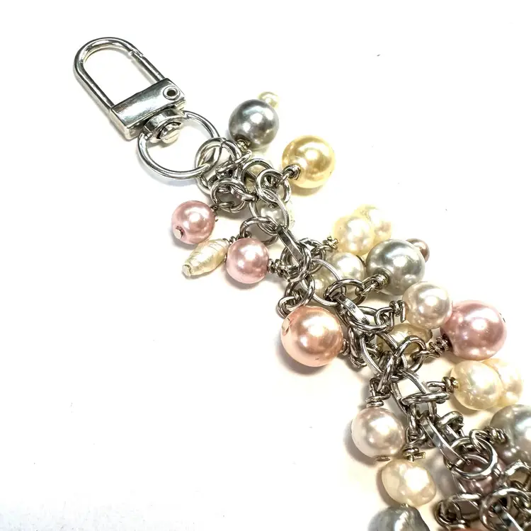 Features an art glass bead with silver foil and a variety of faux and freshwater pearl beads in various colors Silver tone findings Swivel hook for use as a purse charm Smaller lobster clasp allows for quick and easy removal if needed Made by me with repurposed jewelry pieces