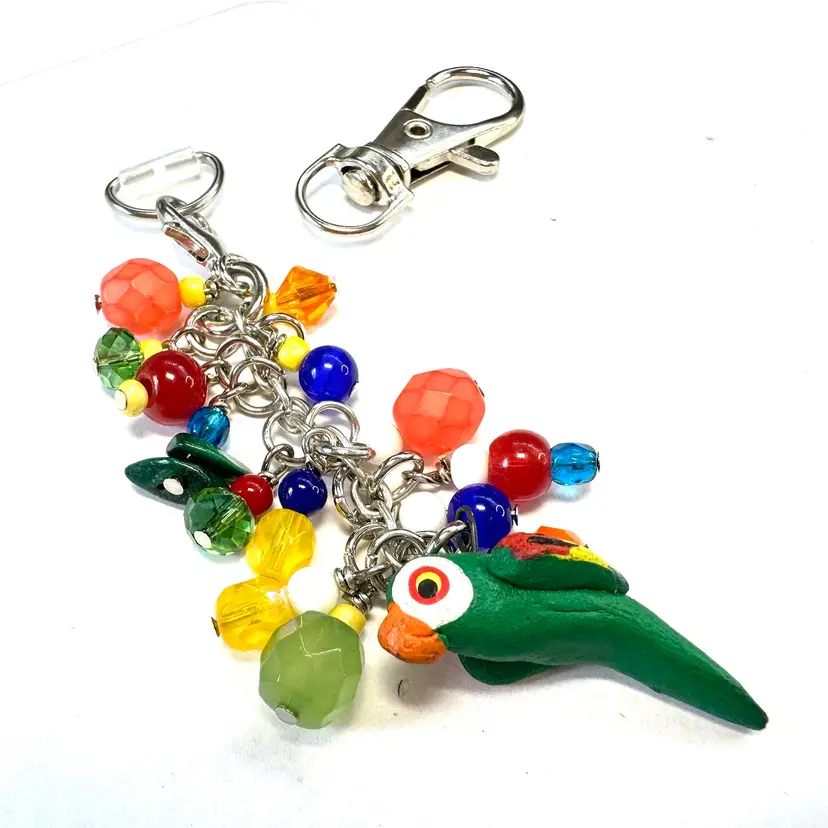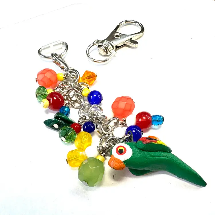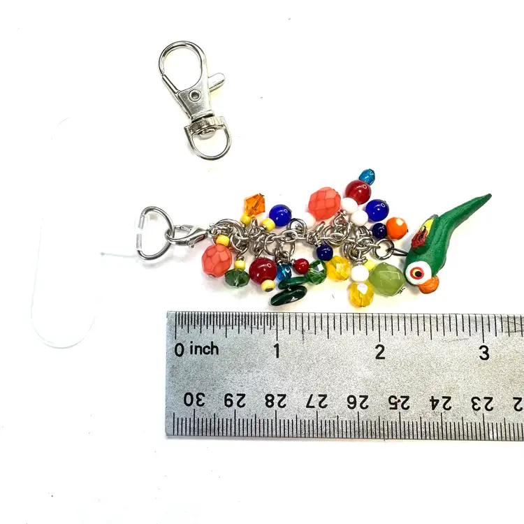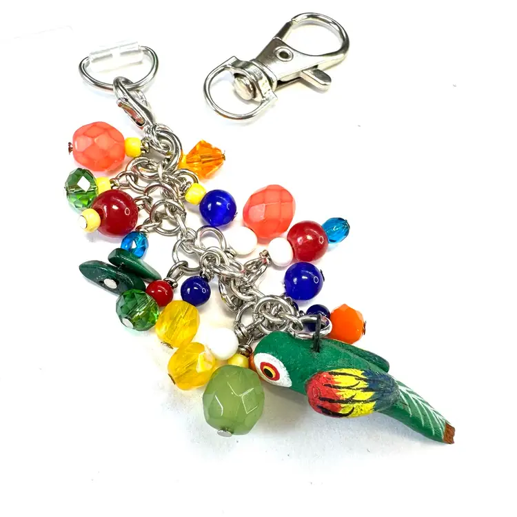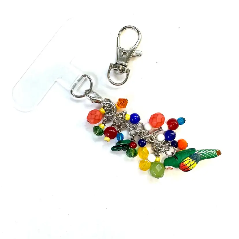 Features a parrot charm and a variety of beads in bright colors Silver tone findings Cell phone charm holder which fits between the phone and the case included Also includes a swivel hook for optional use as a purse charm Lobster clasp allows for quick and easy removal when needed without removing case Made by me with repurposed jewelry pieces