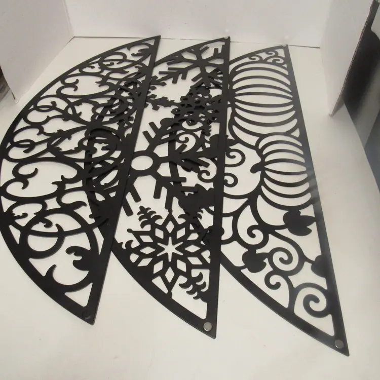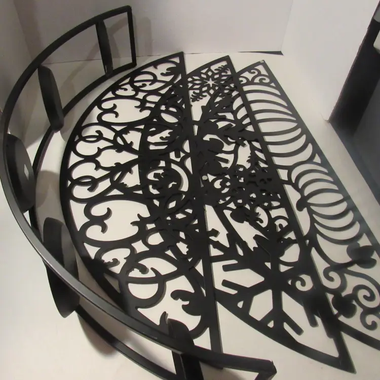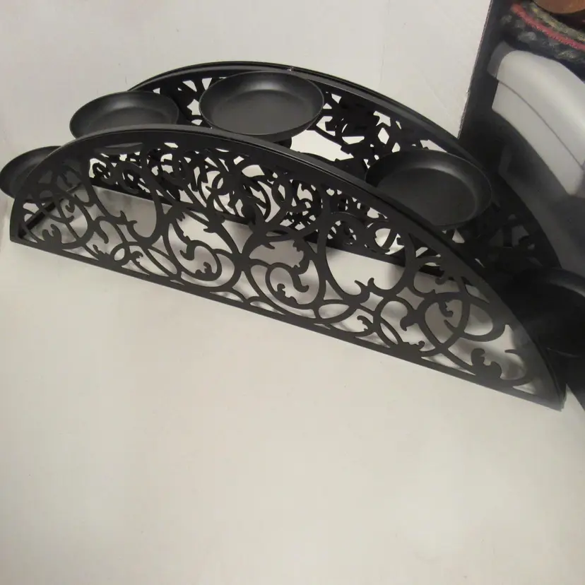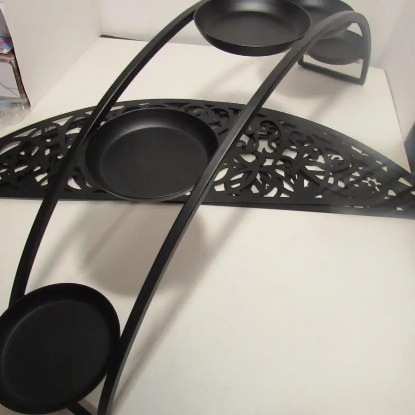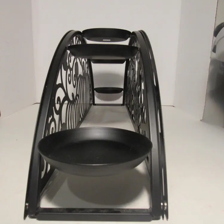 *Pre-owned *Three Interchangeable magnetic panels: Pumpkins/Fall, Snowflakes/Winter, and Scrolls/Year Round. *Candle Holder can be used without magnetic panels. Holds 5 Candle Pillars *Material: Wrought Iron *It can be used as a centerpiece and without the side panels. *Measurements: L 23.5" x W 4.5" x H 8". The candle holder has normal wear, scratches and discoloration on the bottom of one holder. (See last picture). Consists of Candle Holder and three magnetic panels. See all pictures for further clarification and description.