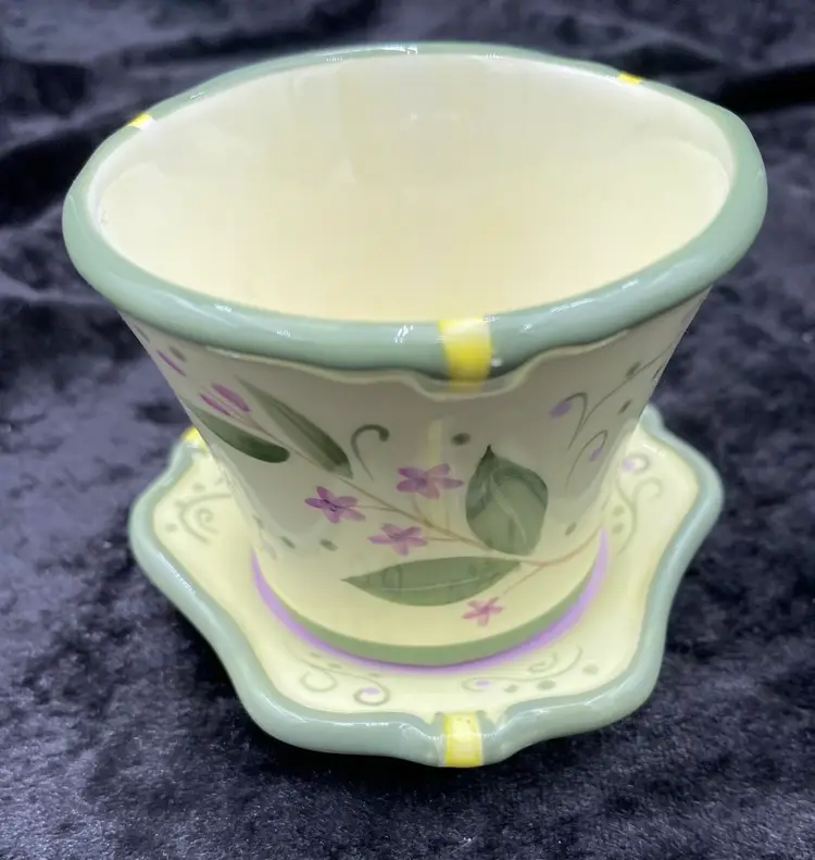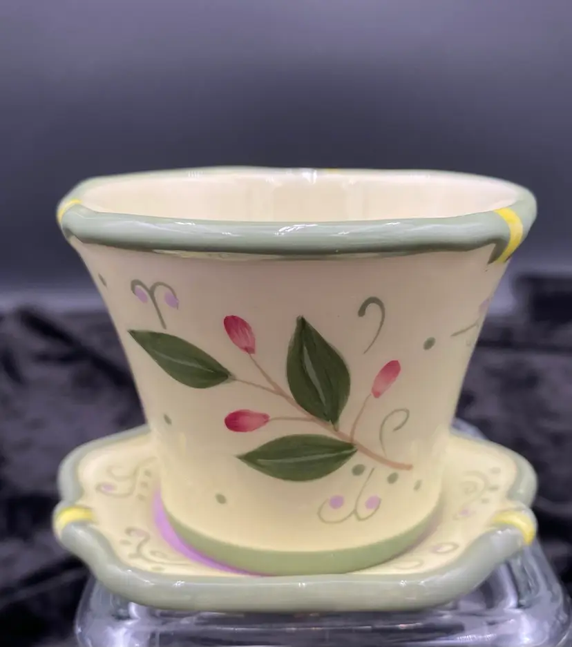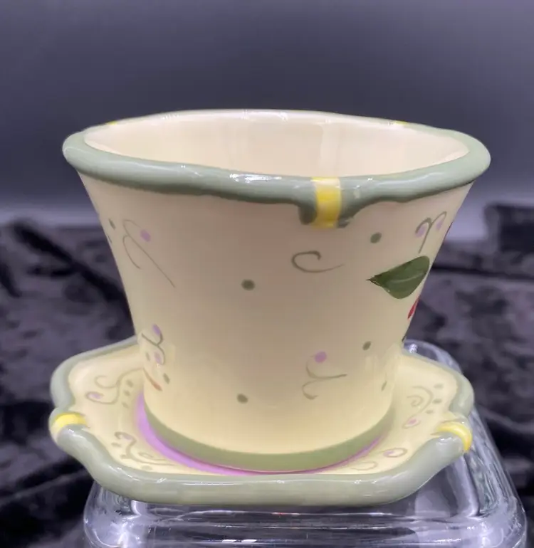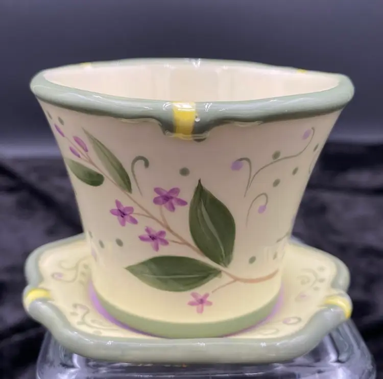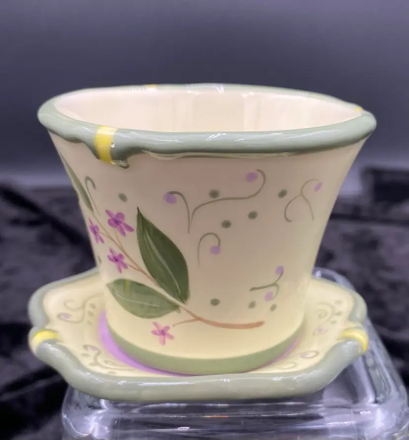 The PartyLite Garden Lites votive candle holder is a ceramic piece that exudes a quaint country charm, perfect for any occasion. Its Flower Pot style, soft pastel yellow base color and 3-cornered underplate - all adorned with colorful pink and purple florals - create an inviting and warm ambiance. Measuring 2.5 inches in height and 3 inches in width, it's a delicate and elegant addition to your decor. This multicolored candle holder features a glossy finish that highlights its lovely details. The item's weight of 4.6 ounces confirms its lightweight and easy-to-display nature.