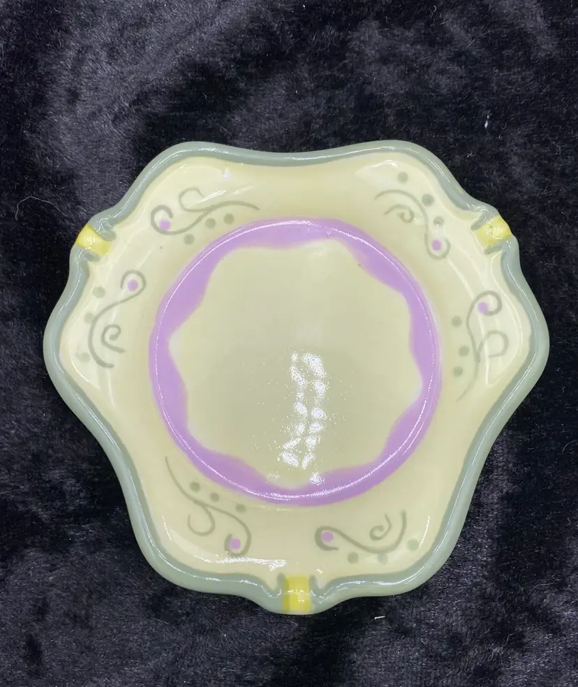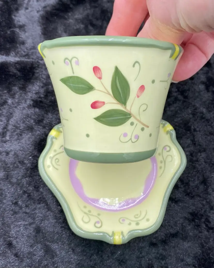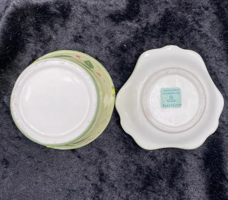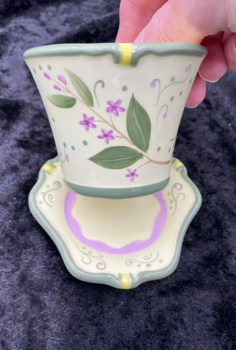 The PartyLite Garden Lites votive candle holder is a ceramic piece that exudes a quaint country charm, perfect for any occasion. Its Flower Pot style, soft pastel yellow base color and 3-cornered underplate - all adorned with colorful pink and purple florals - create an inviting and warm ambiance. Measuring 2.5 inches in height and 3 inches in width, it's a delicate and elegant addition to your decor. This multicolored candle holder features a glossy finish that highlights its lovely details. The item's weight of 4.6 ounces confirms its lightweight and easy-to-display nature.