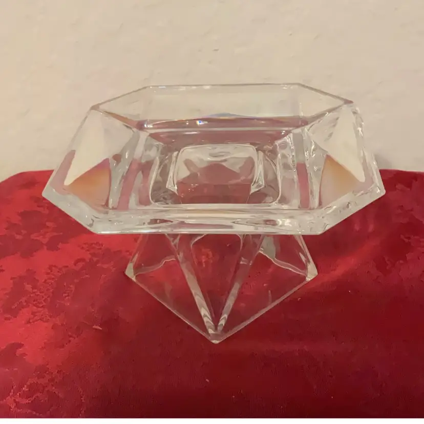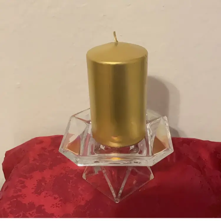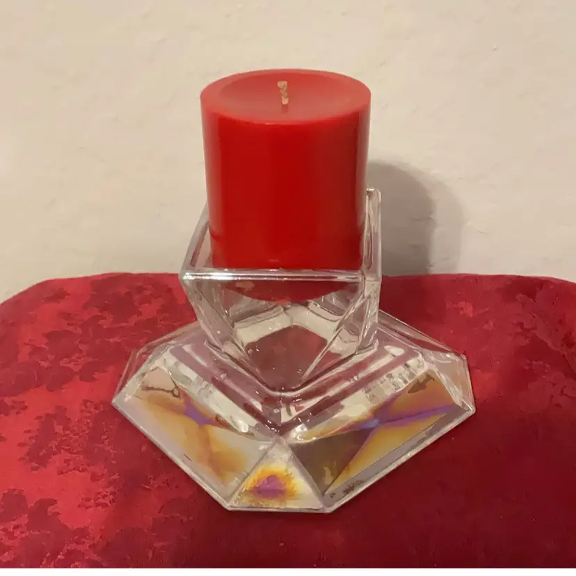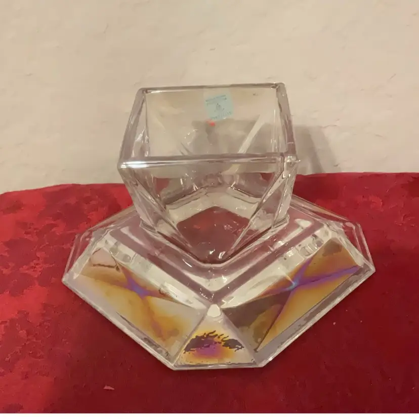 This candle holder features a beautiful iridescent finish that will add a touch of elegance to any space. Unique geometric pattern. Purchase includes candle of your choice pictured.