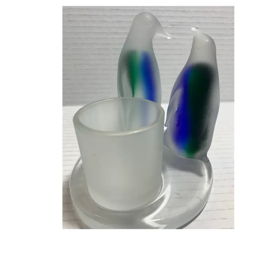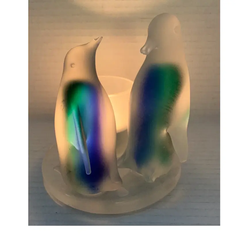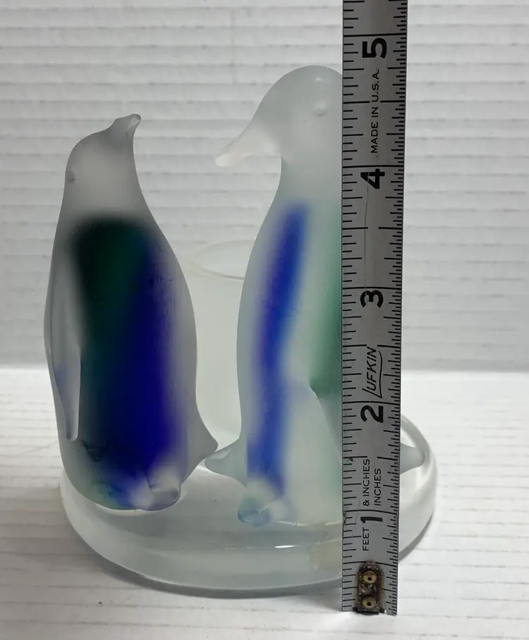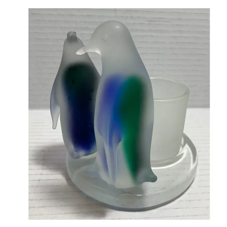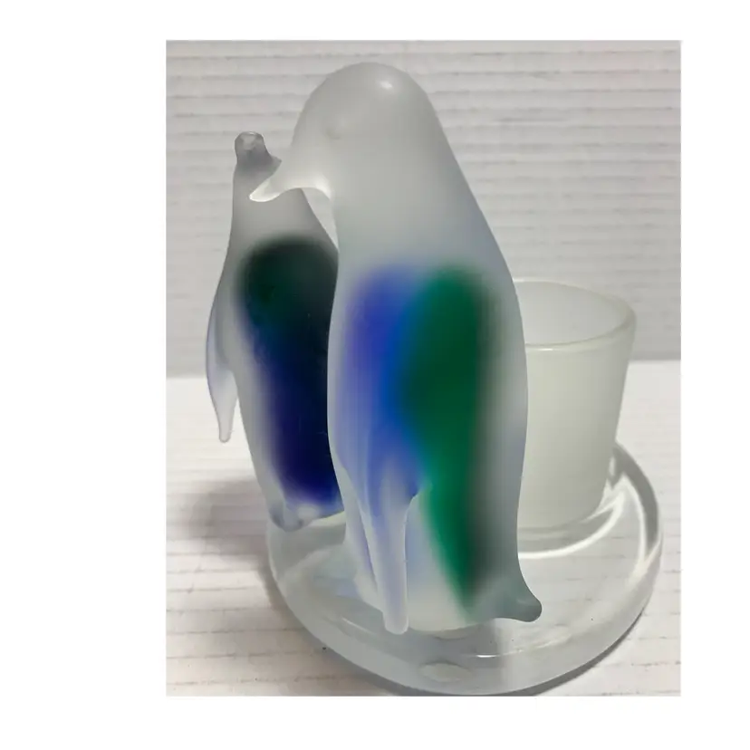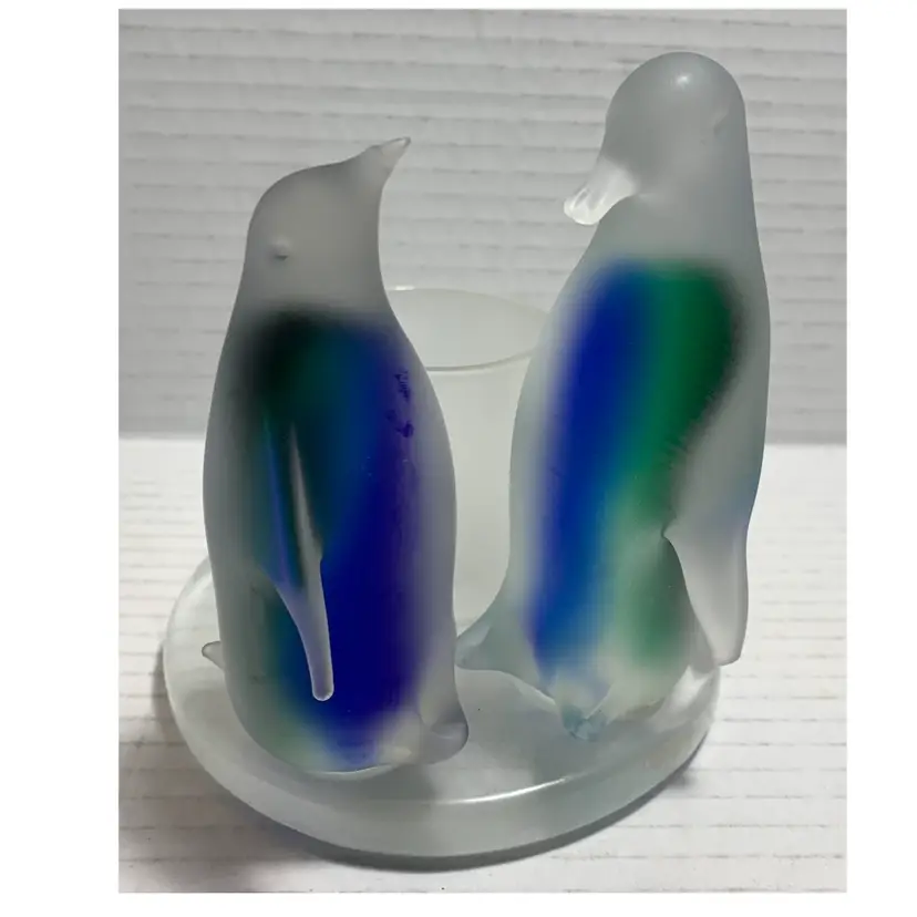 Beautiful glass penguins with blue and green. Glows really pretty with candle. No chips, cracks or repairs. There are a few little rub marks on the bottom. I do not have the box. Please see all photos for condition. Details and measurements. Thanks for checking out my listings.