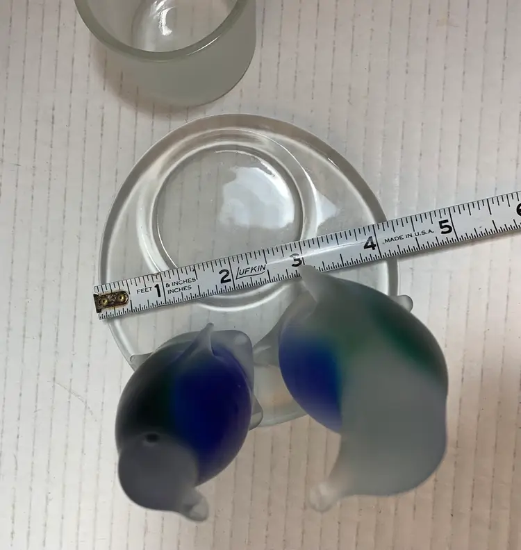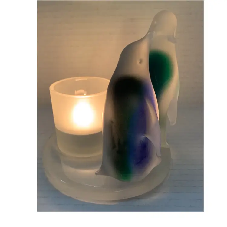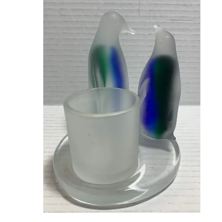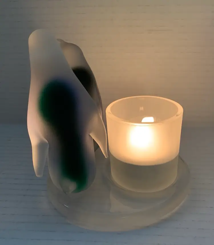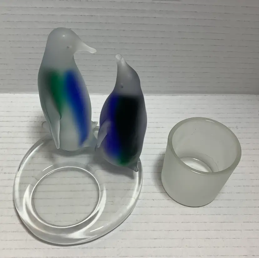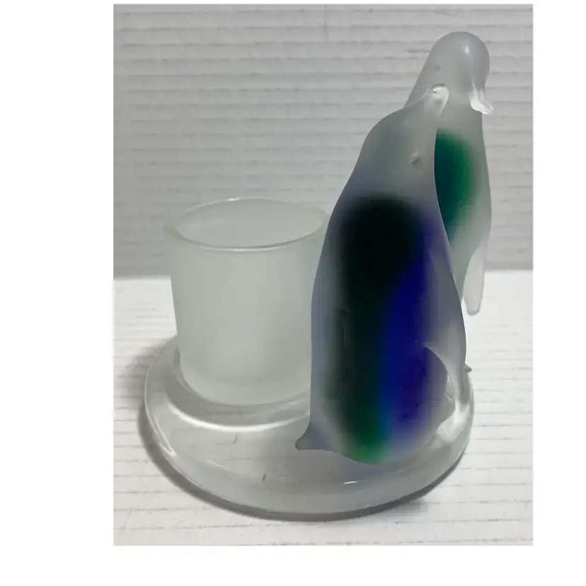 Beautiful glass penguins with blue and green. Glows really pretty with candle. No chips, cracks or repairs. There are a few little rub marks on the bottom. I do not have the box. Please see all photos for condition. Details and measurements. Thanks for checking out my listings.