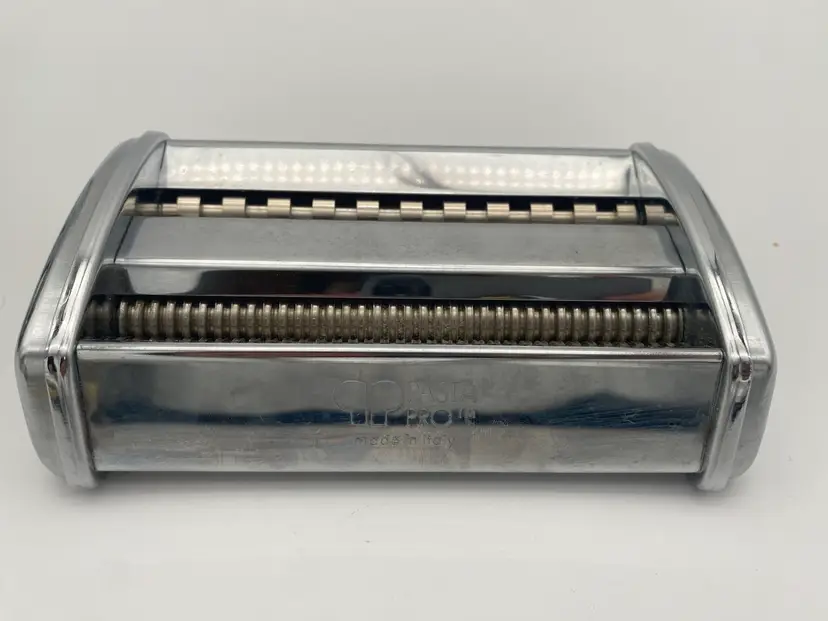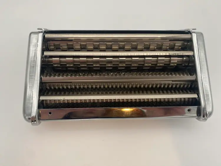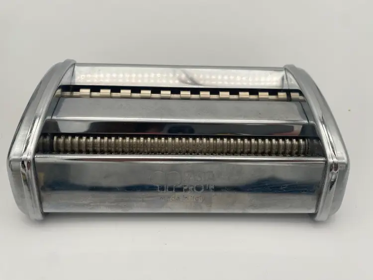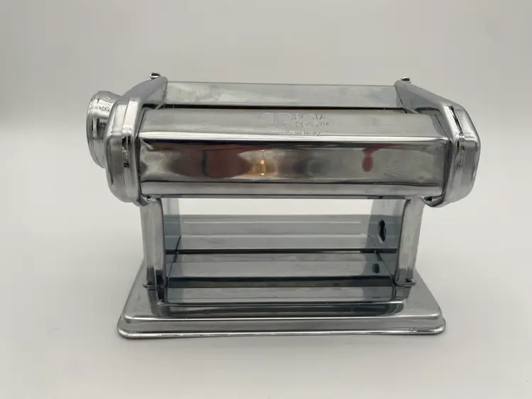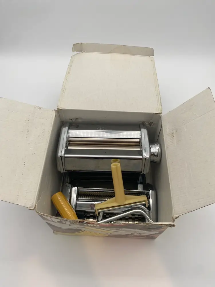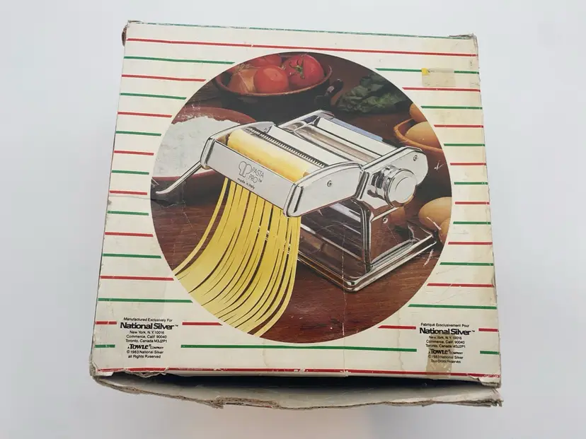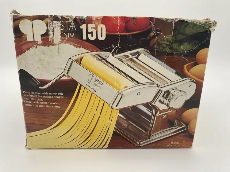 You are purchasing one Pasta Pro 150 Pasta Making Machine by National Silver from 1983. This Pasta Maker is complete with original Box and Paperwork, as well as removable Spaghetti & Fettucine Attachment. No cracks or breaks in any of the Pieces.