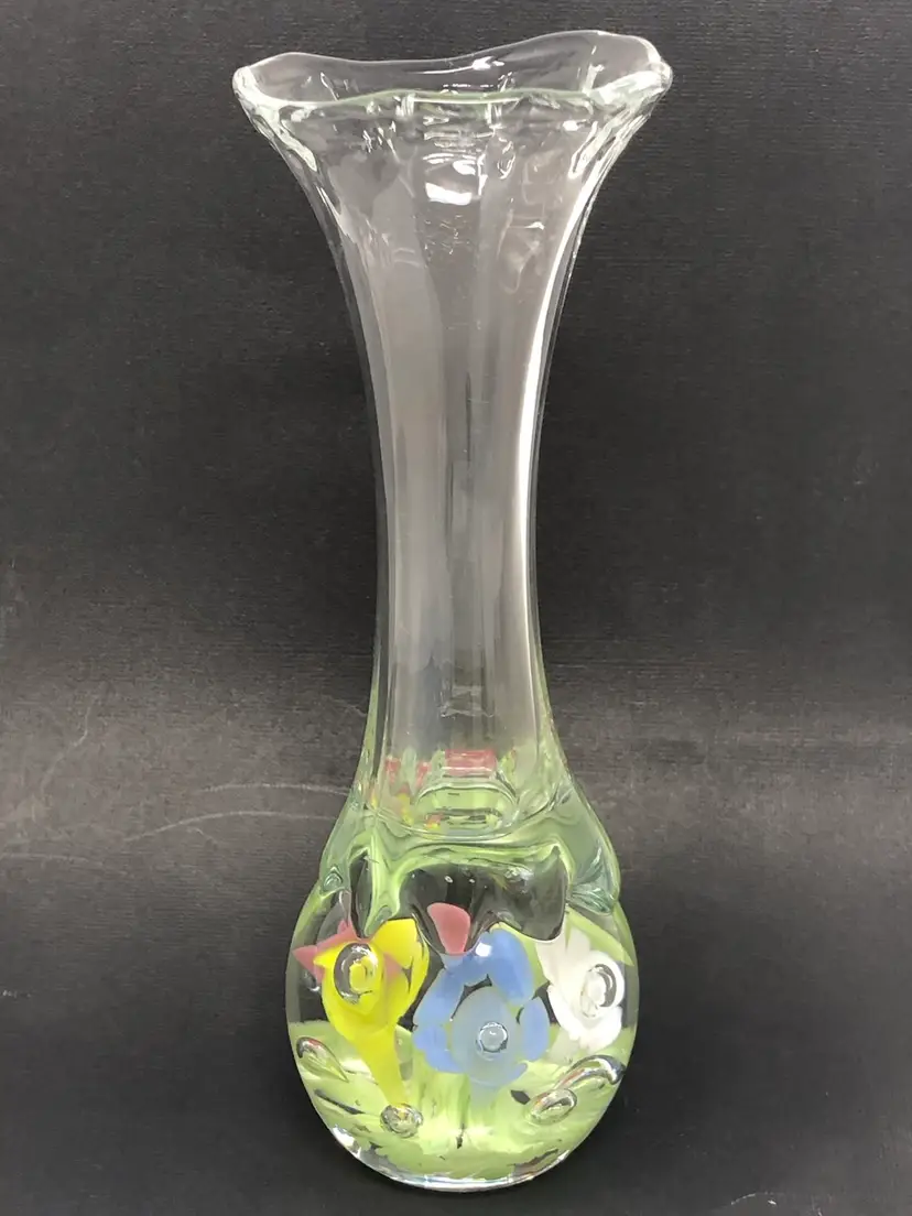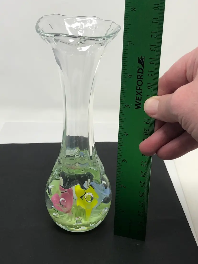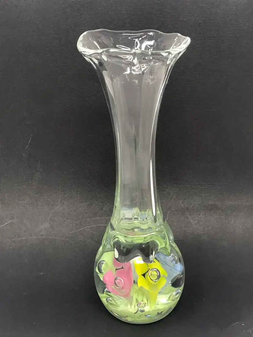 7 1/2" clear glass vase with paperweight base featuring 5 pastel-colored flowers with bubble centers on a green ground. Smooth unpolished bottom with no markings or signatures. No chips or cracks.