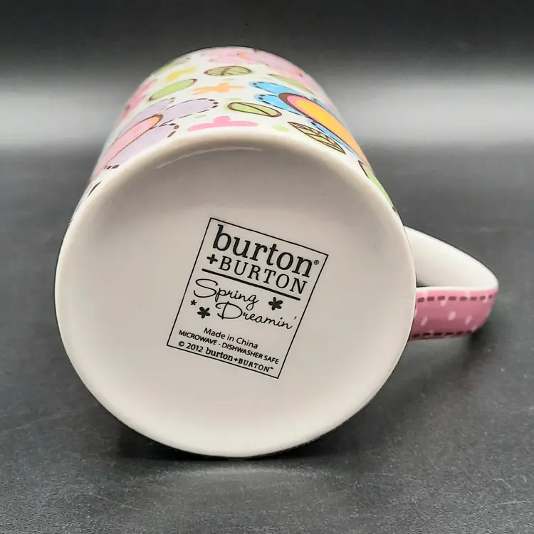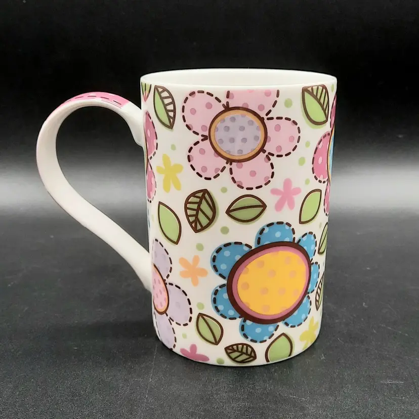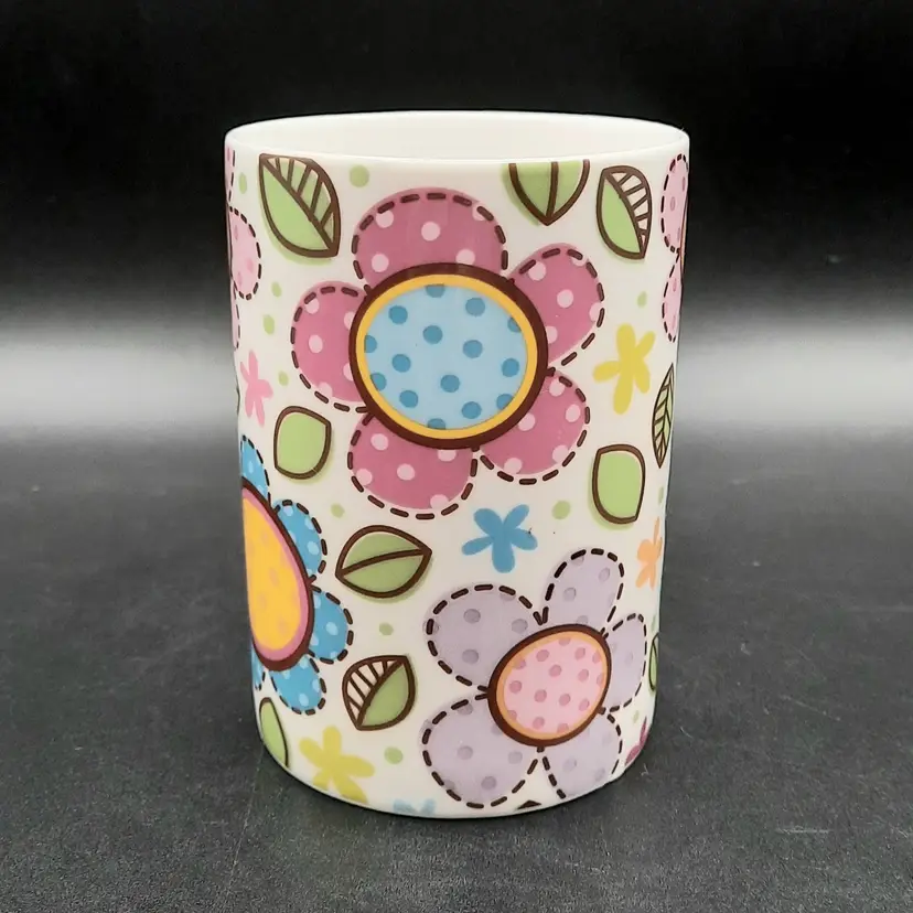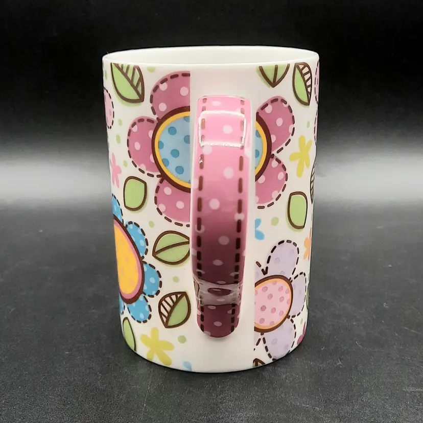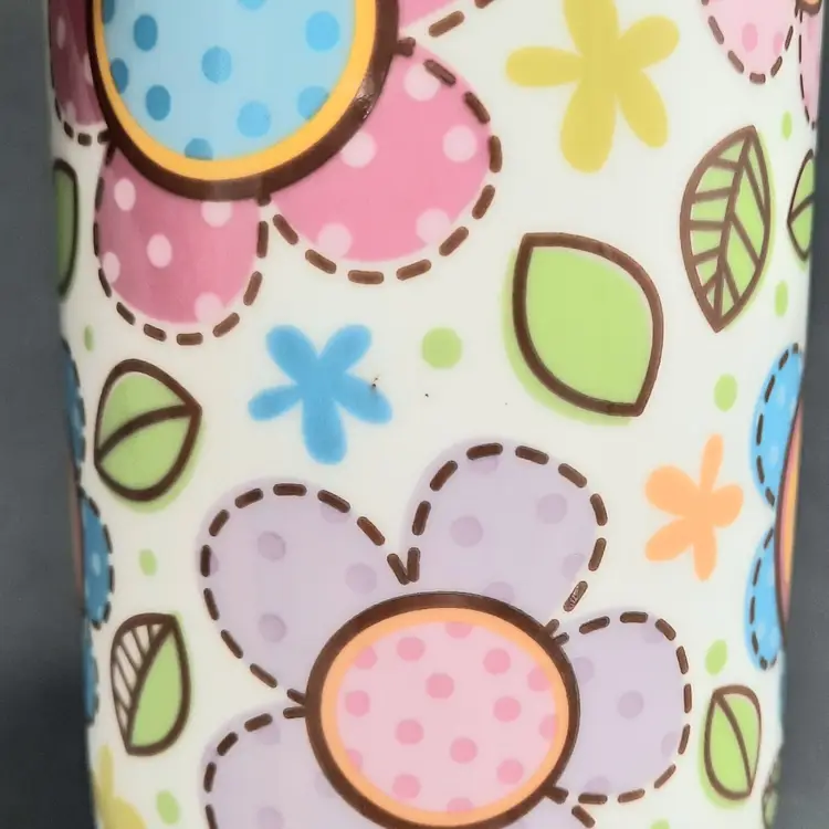 Darling spring flower mug is 4 1/4"H x 3"W at rim, great condition with a few dark specks in glaze