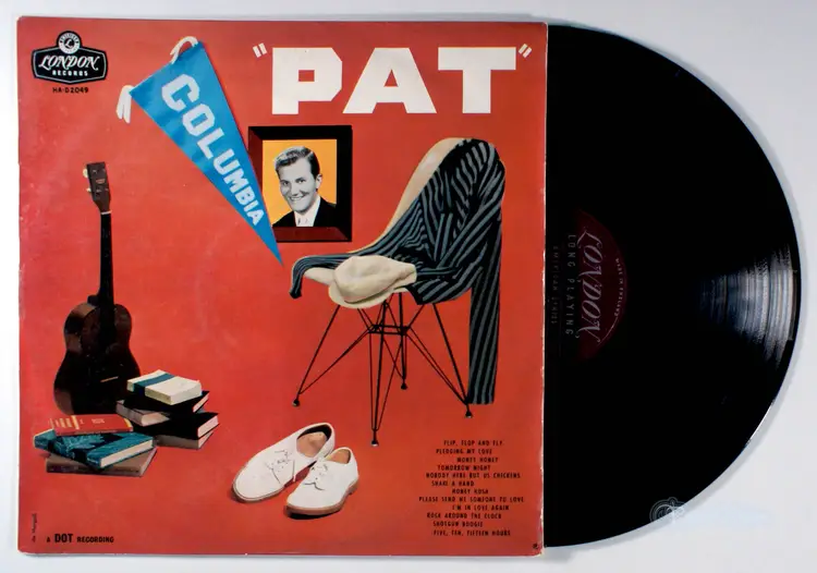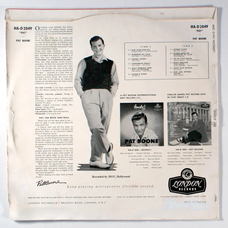Pat, by Pat Boone, released in 1957 on Dot Records, is a significant early work in his career, showcasing his smooth pop and rock style that appealed to a broad audience during the 1950s. It features a mix of original songs and covers, reflecting Boone’s knack for adapting rhythm and blues hits for mainstream listeners. Historically, the album is notable for its role in establishing Boone as a major pop star, second only to Elvis Presley in chart success at the time. Key hit singles include Ain’t That a Shame, a No. 1 cover of Fats Domino’s R&B classic, and I’ll Be Home, which reached No. 1 in the UK. The album’s success contributed to Boone’s record of 220 consecutive weeks on the Billboard charts, a feat he still holds.
