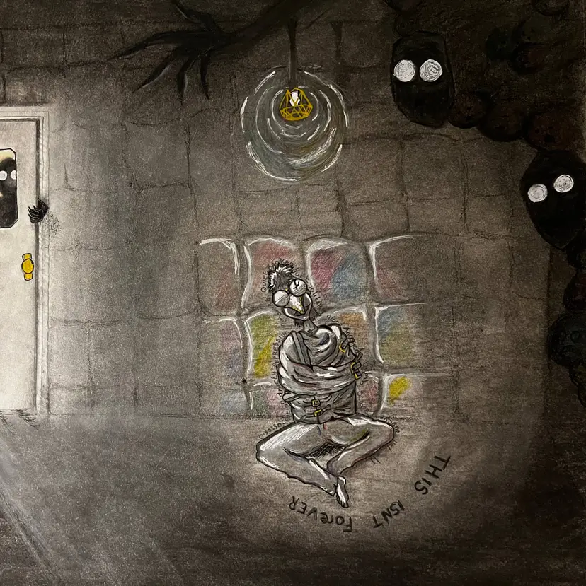 A lone figure, bound in a straitjacket, sits slumped and barefoot on the floor of a padded cell. Their expression is distorted with confusion, exhaustion, or perhaps denial. Beneath them, the phrase “THIS ISN’T FOREVER” curves along the floor—equal parts reassurance and haunting reminder.