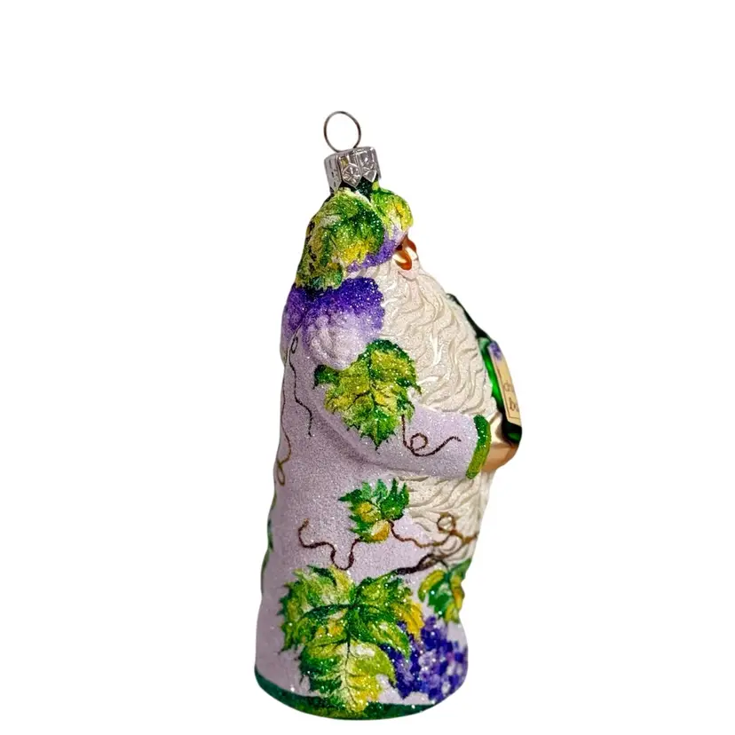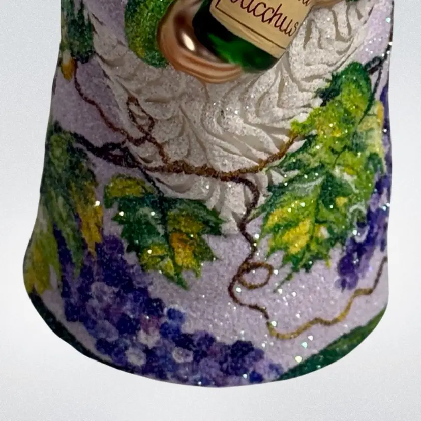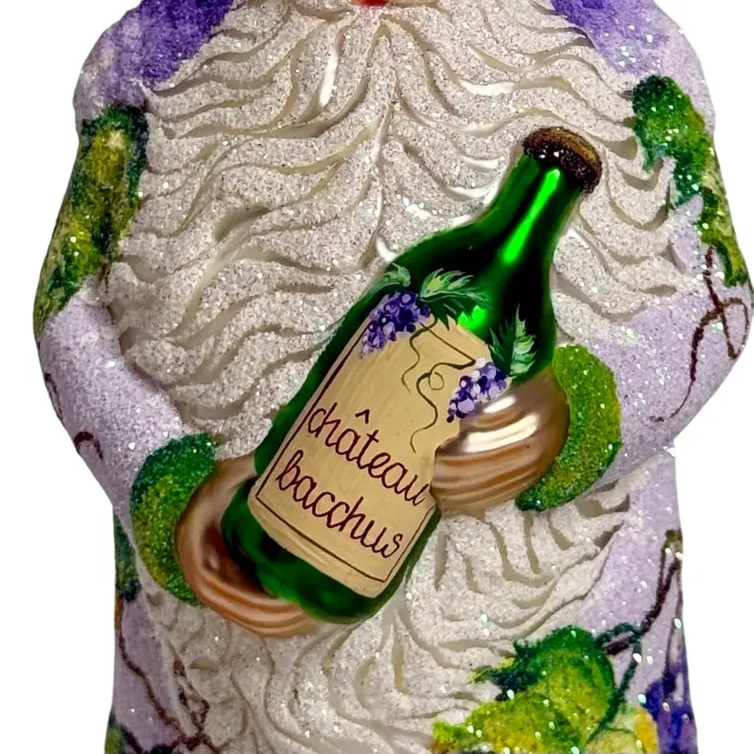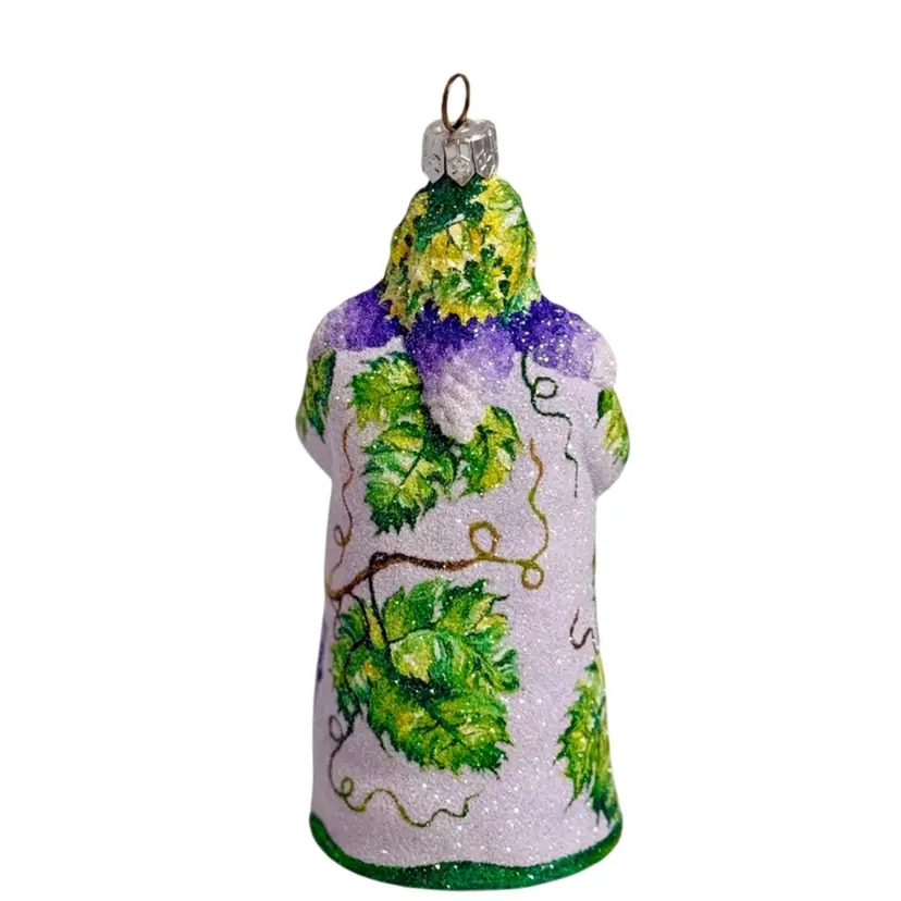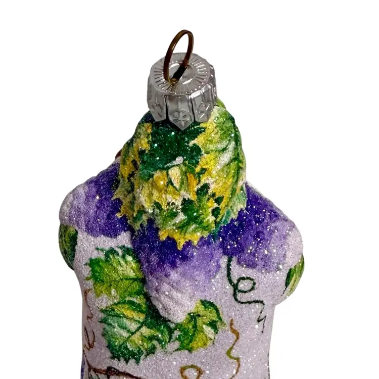 Stunning Patricia Breen Chateau Bacchus blown glass Christmas ornament. Decorated in white glitter with purple, green and brown grape vine design throughout. Measures approx. 5 1/2" from the hanger to the bottom.