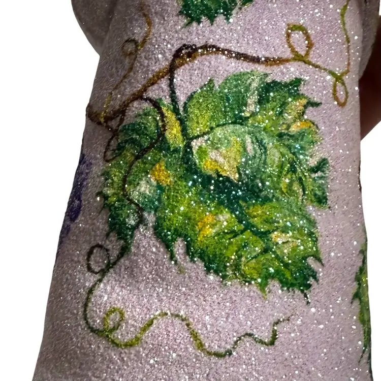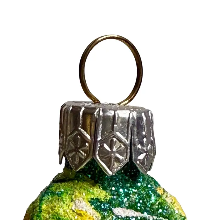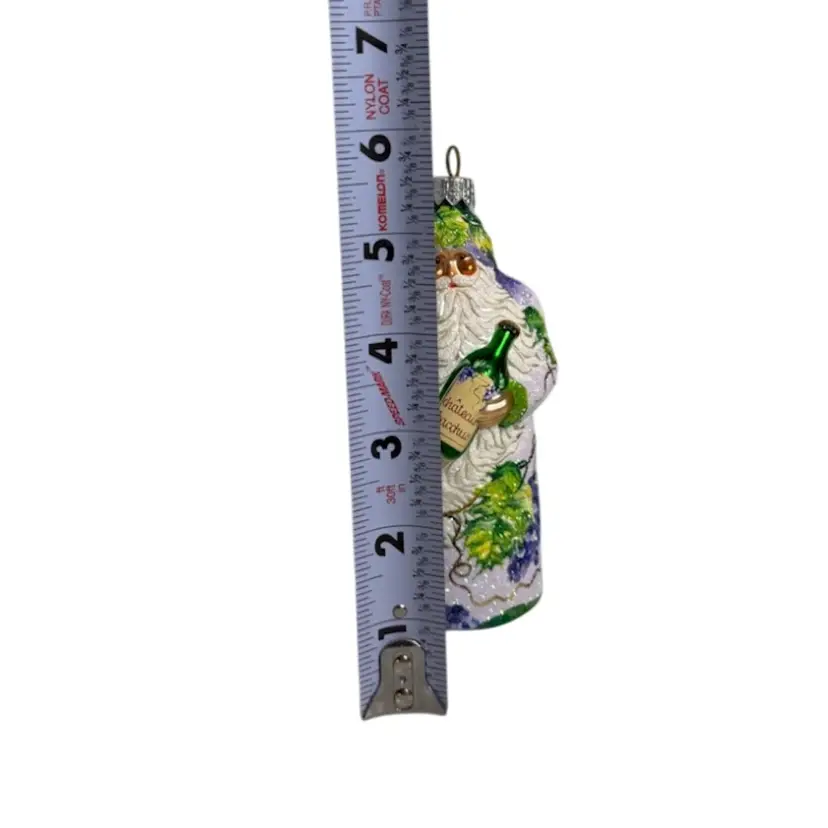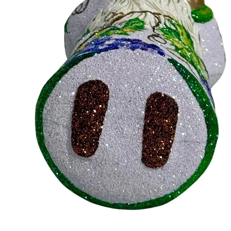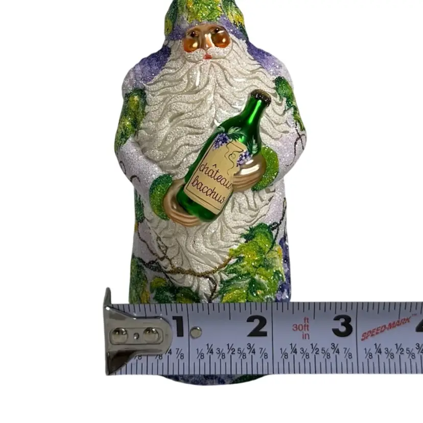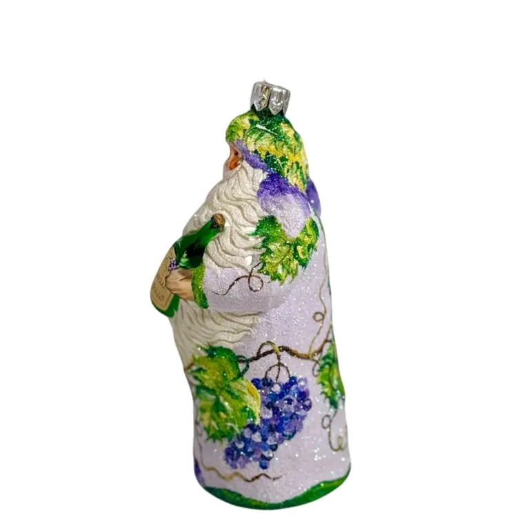 Stunning Patricia Breen Chateau Bacchus blown glass Christmas ornament. Decorated in white glitter with purple, green and brown grape vine design throughout. Measures approx. 5 1/2" from the hanger to the bottom.