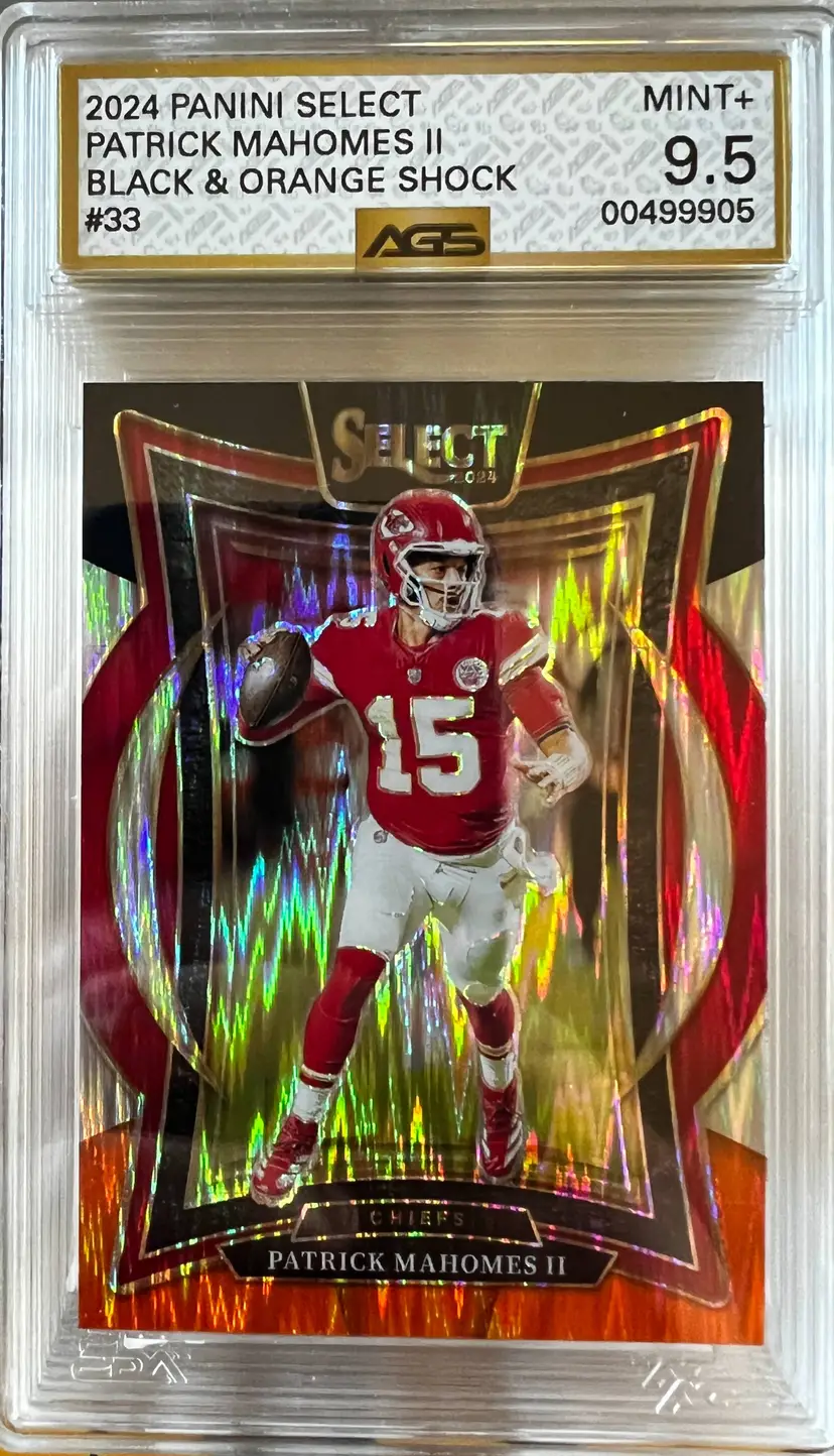 Snag this Patrick Mahomes II Black & Orange Shock card from the 2024 Panini Select series. A must-have for any Chiefs fan or card collector.