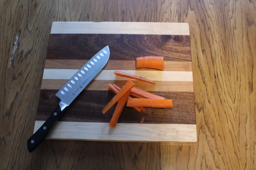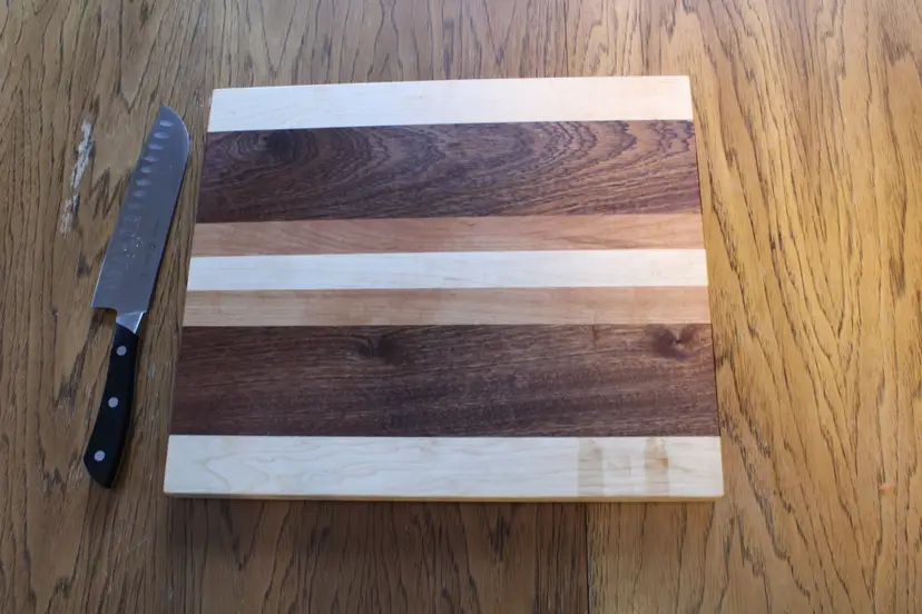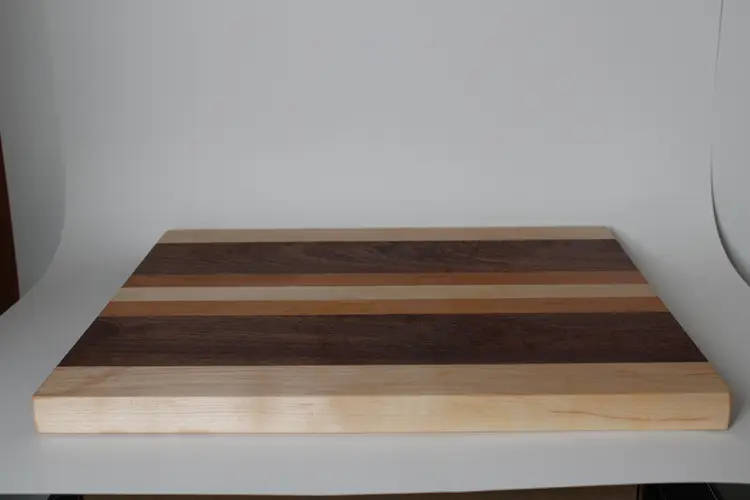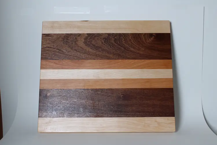 Each board is laminated with food safe glue, sanded through 220 grit for a smooth finish, soaked in mineral oil to protect the wood, and covered with a homemade beeswax board butter for a smooth and bacteria resistant top surface. The edges and corners of each board are hand sanded to maintain a sleek look without risk of the boards edges cutting you back.