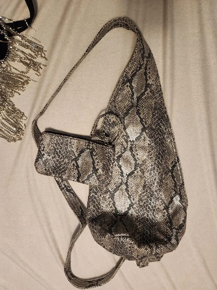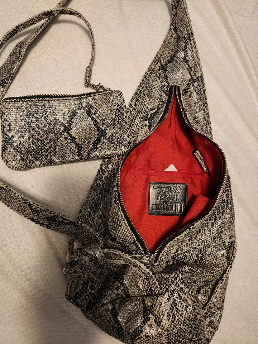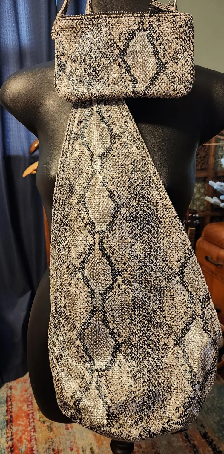 Excellent/never used condition Snakeskin Print crossbody bag with matching wristlet Crossbody pouch is 22" L , 10" w, strap that wraps around body is 42" (from top to bottom of bag), lining is clean, one inside zip pocket Wristlet 7x4, clean inside