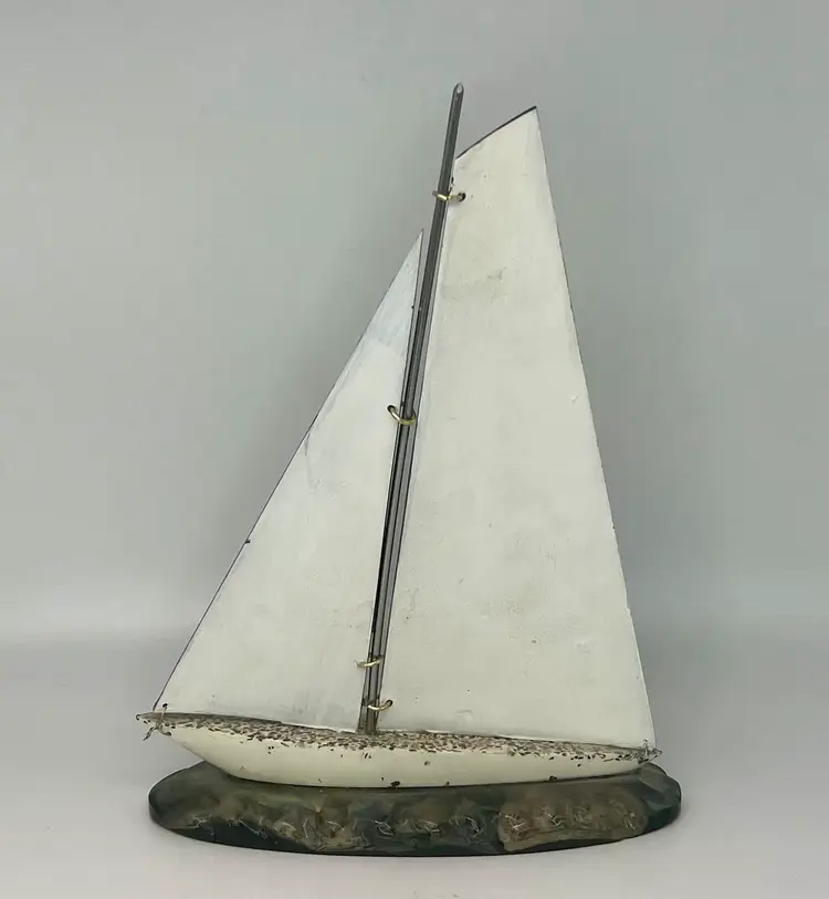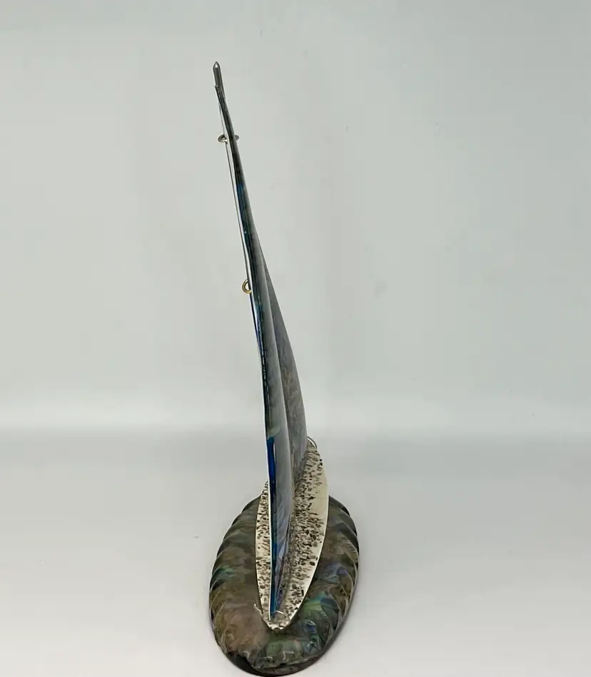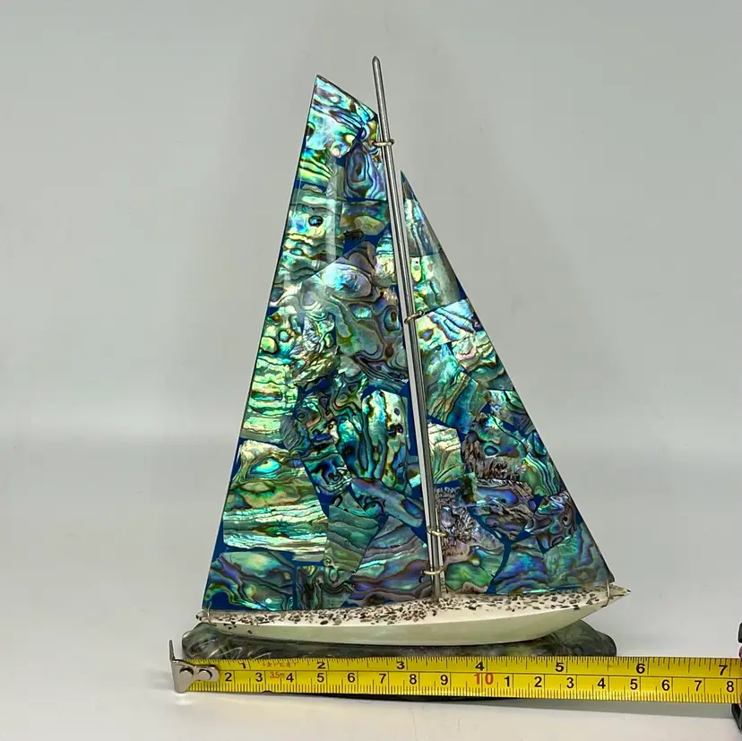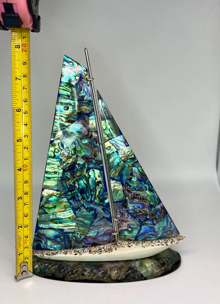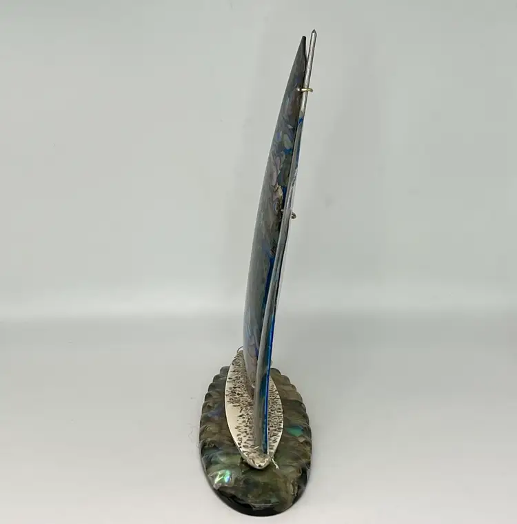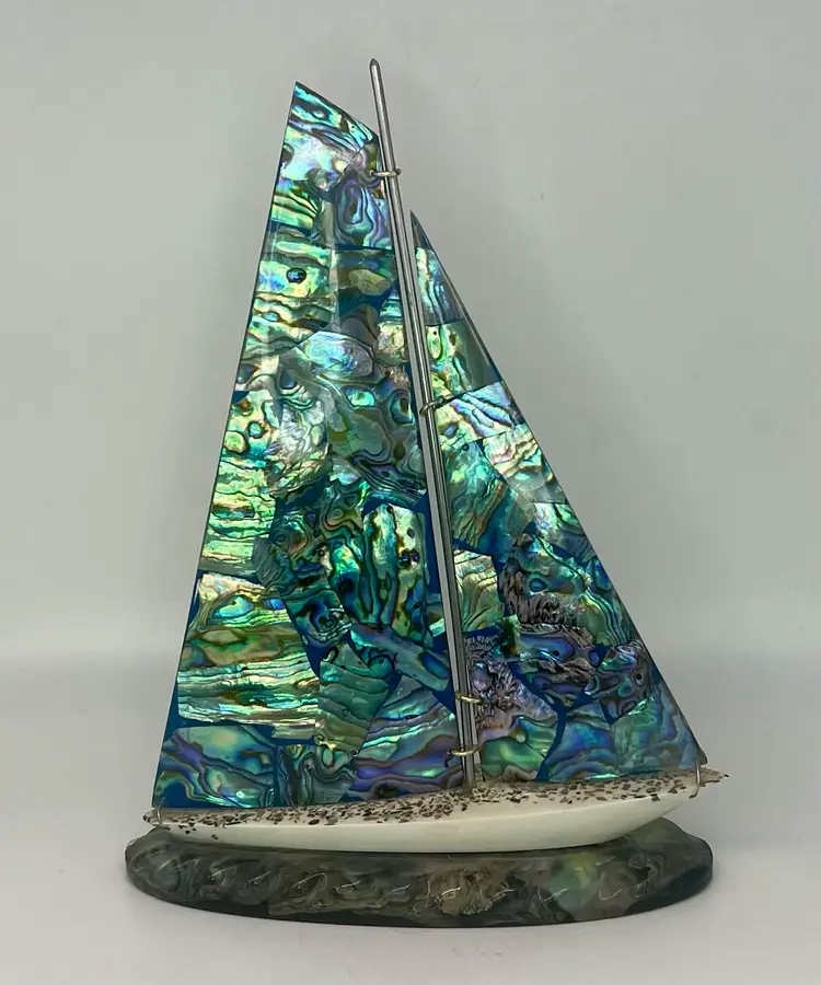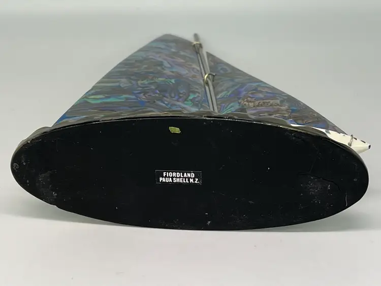 Genuine Paua Abalone shell sailboat sits on a resin base. Handcrafted by Fiordland in New Zealand. Approximately 8” tall and 6” wide.