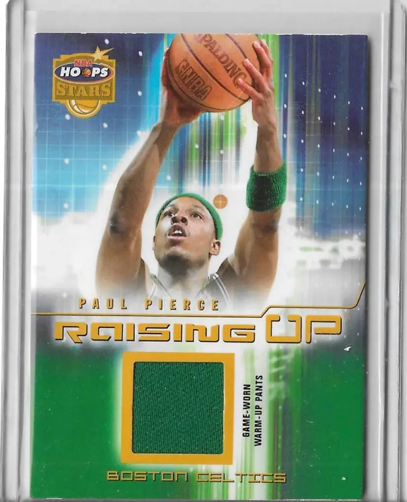 Check out this Paul Pierce Raising Up card featuring a piece of his game-worn warm-up pants. A great addition for any Boston Celtics fan or card collector.