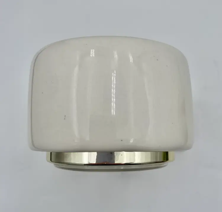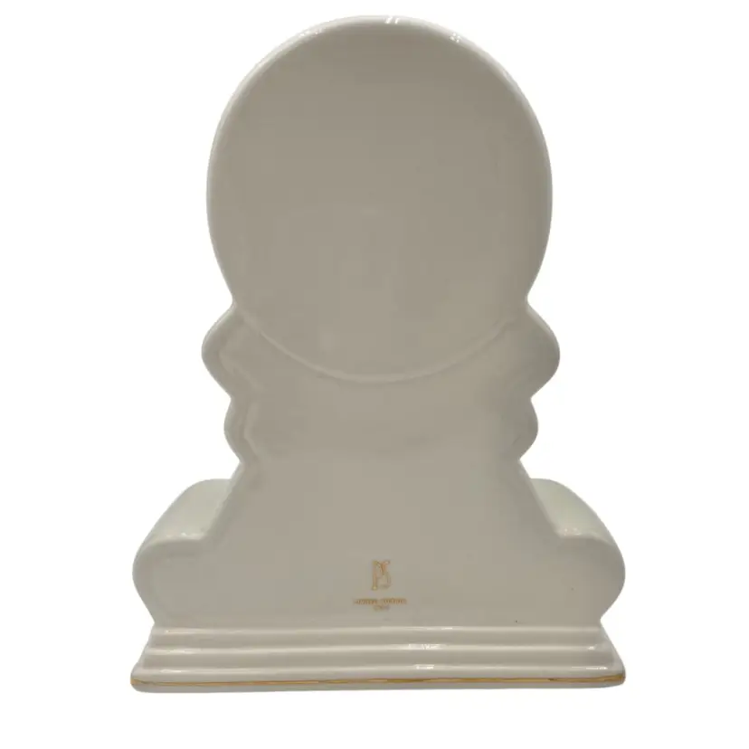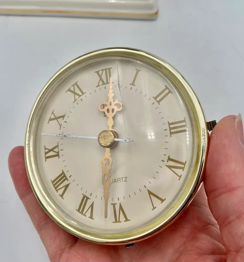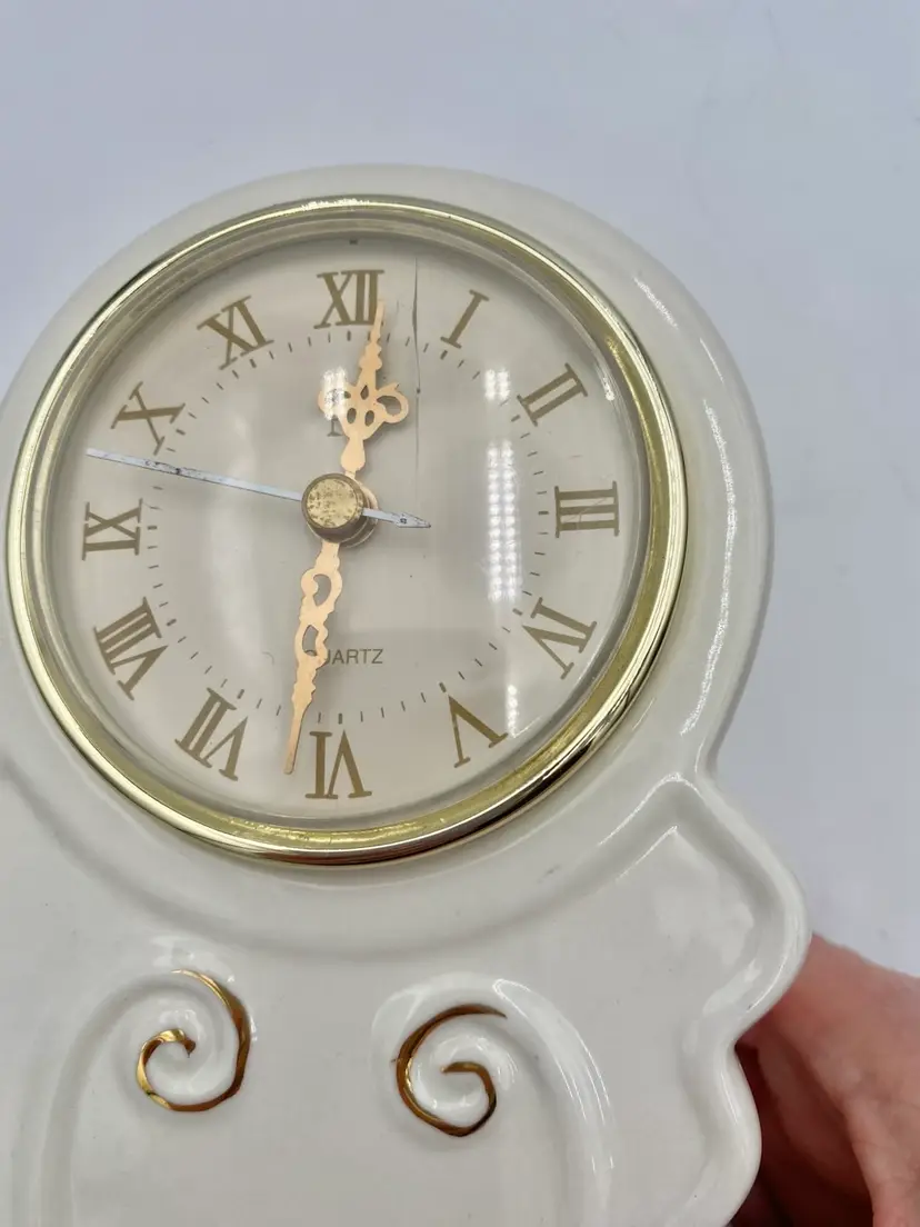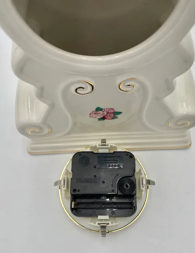 The piece is in very good condition. The only wear is a scratch on the plastic exterior of the clock portion (see pictures 8 & 12). The clock is removeable in order to replace the battery. If desired, a replacement clock portion is easy to find on Amazon. The porcelain body is pristine, with the gold trim in excellent condition.