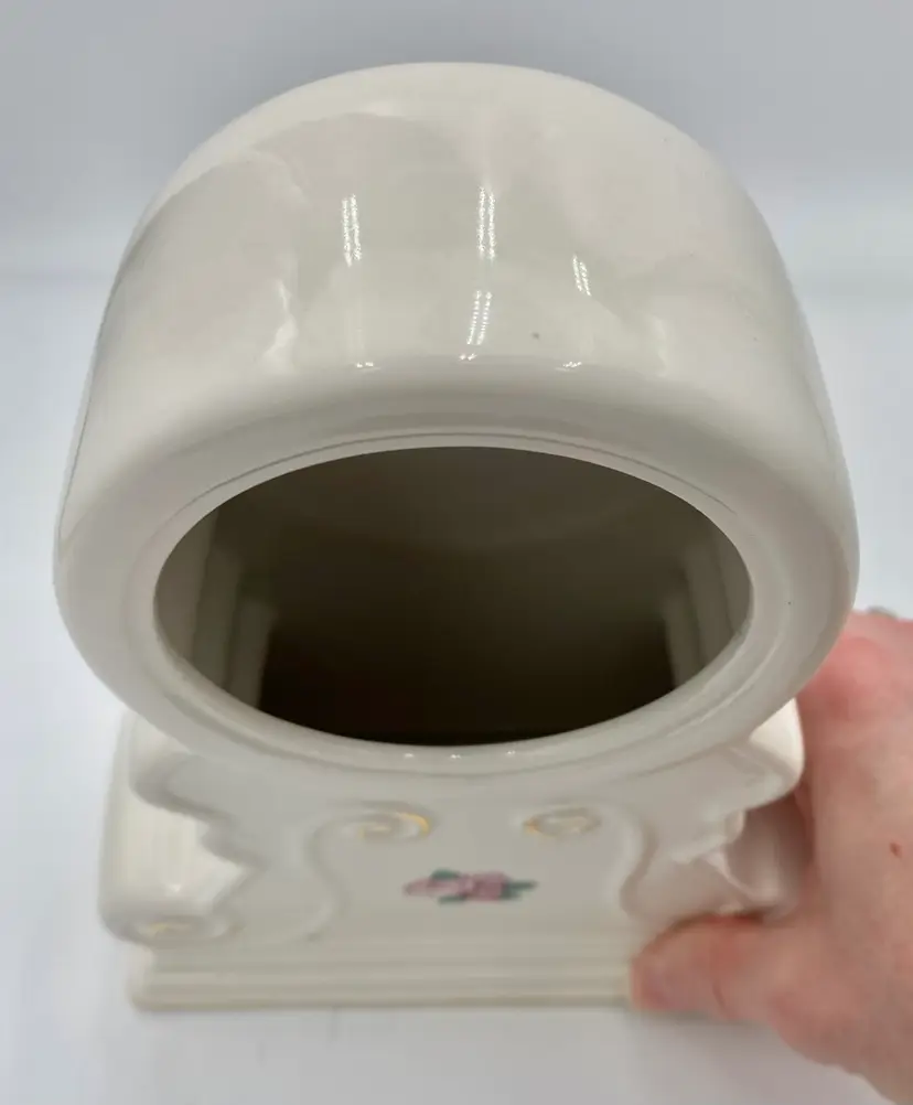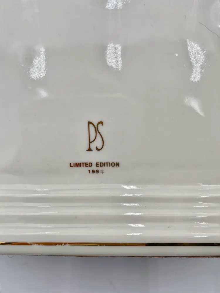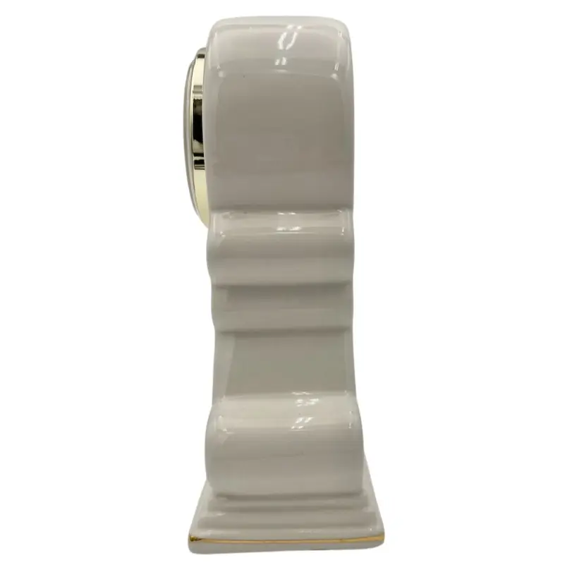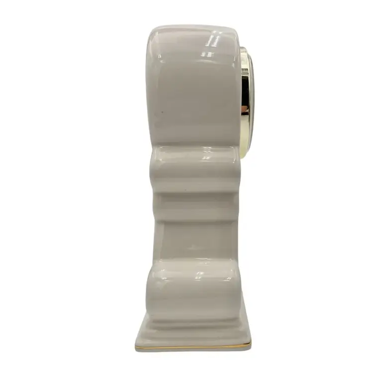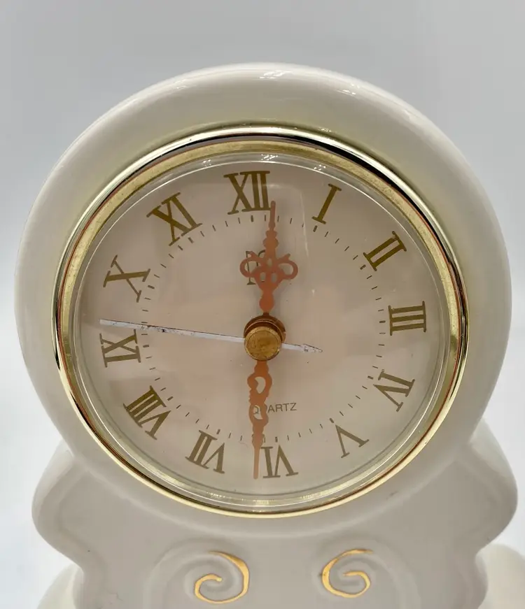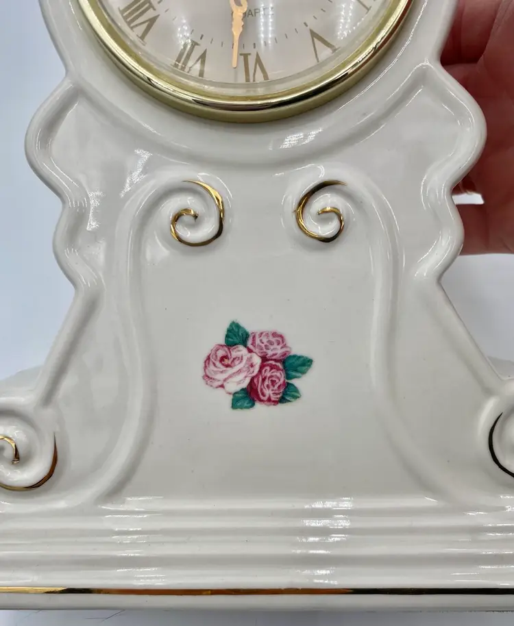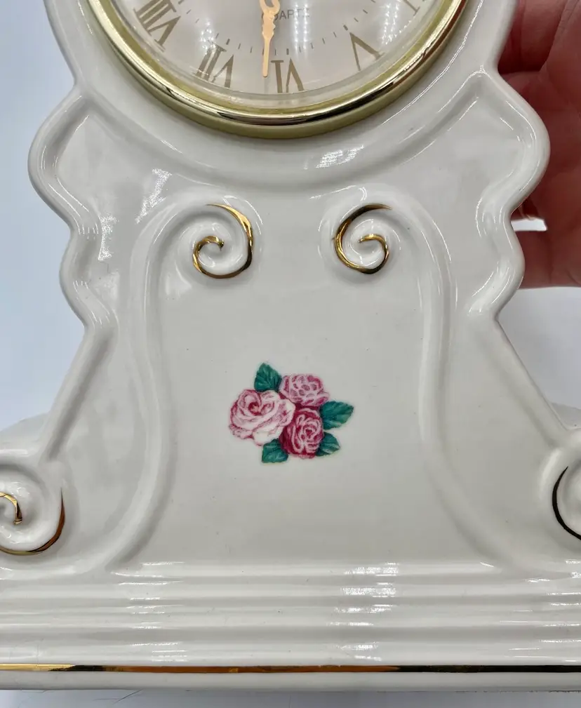 This Paul Sebastian Limited Edition 1997 Porcelain Table/Mantle Clock with Roses is a vintage piece with a Victorian style. The clock runs on a battery (not included) and has gold trim and glossy finish. The clock is adorned with roses and displays gold Roman numerals on an ivory face. Made of porcelain and measuring 6.5 inches in length, 8.3 inches in height, and 3 inches in width, this table clock is a beautiful and functional addition to any room. The clock weighs 1 pound, 10.8 ounces.