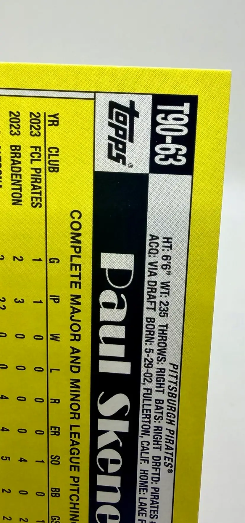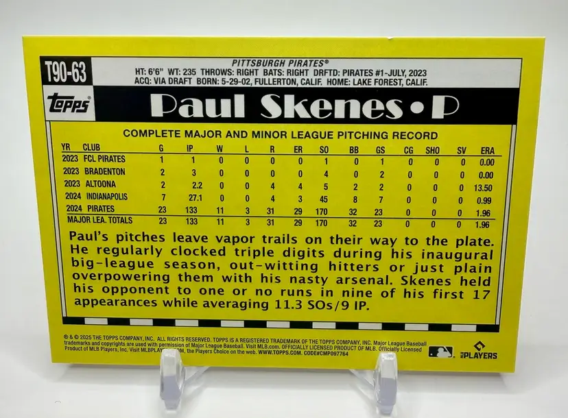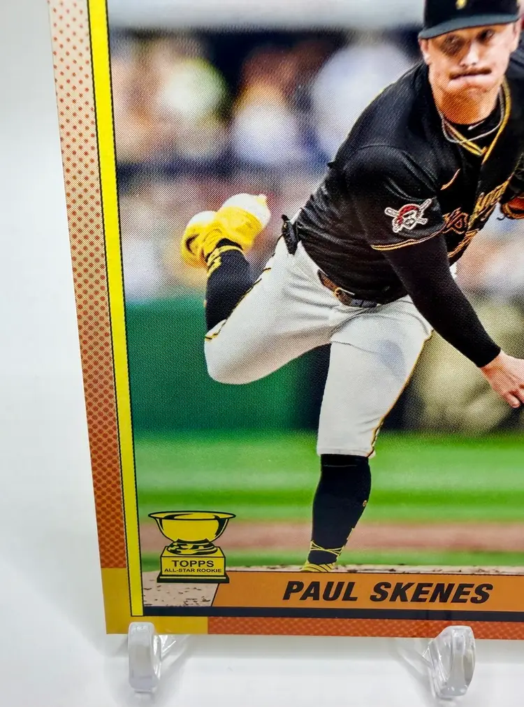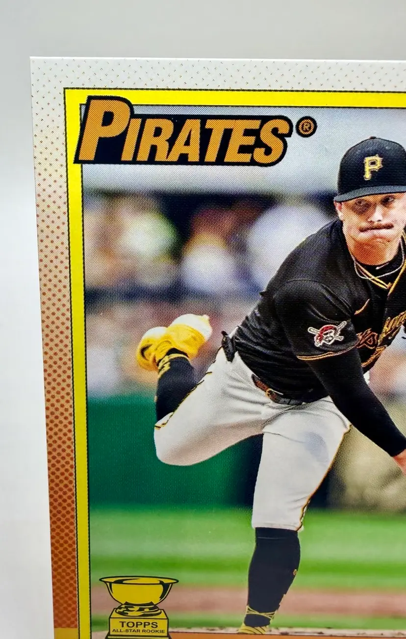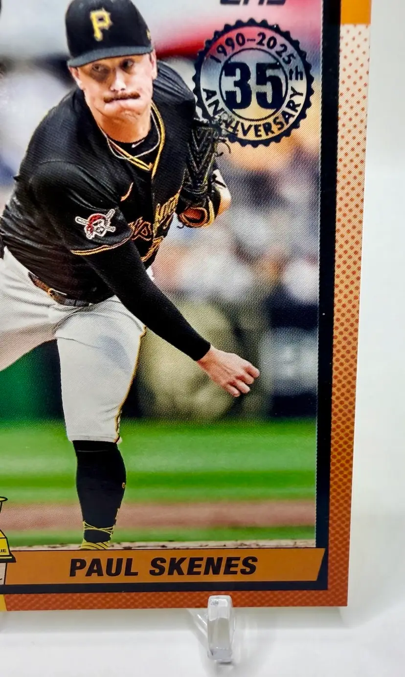 2025 Topps Series 1 trading card featuring Paul Skenes of the Pittsburgh Pirates, commemorating the 35th anniversary of the 1990 Topps Pirates set. The card is a standard size made of card stock and is an original insert in the 35th Anniversary set. Please review the photos carefully to assess the condition of the cards. We do our best to provide clear, detailed images, especially for cards with noticeable flaws. Please note that some raw cards may show light wear, so we encourage close inspection. Cards will be shipped securely. Thank you for checking out our store and for your support! I'm on Instagram as @915_rookie_rush_trading_cards.