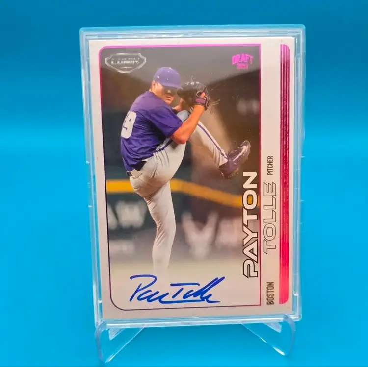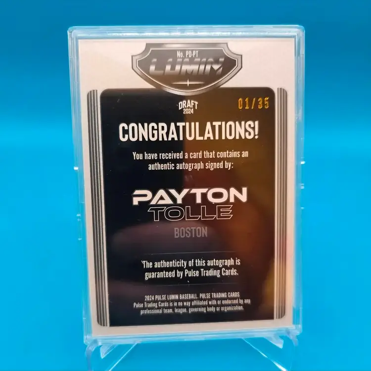 Payton Tolle on-card auto first off the line numbered 1/35. NM or better condition, fully encased. Stacked shipping applies.