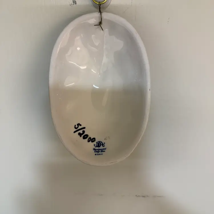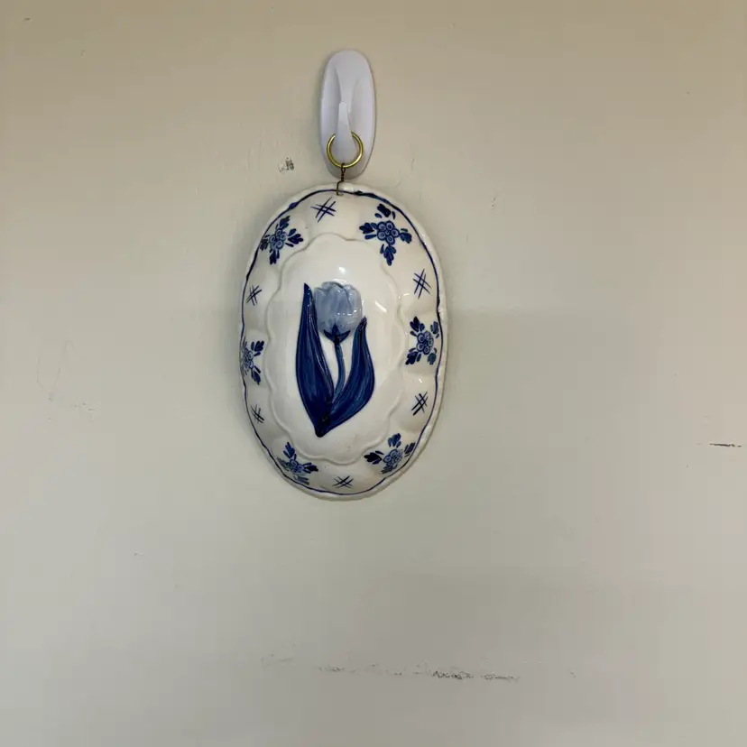 Vintage hand painted Delft blue ceramic hanging wall sconce featuring a blue tulip design.
