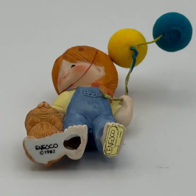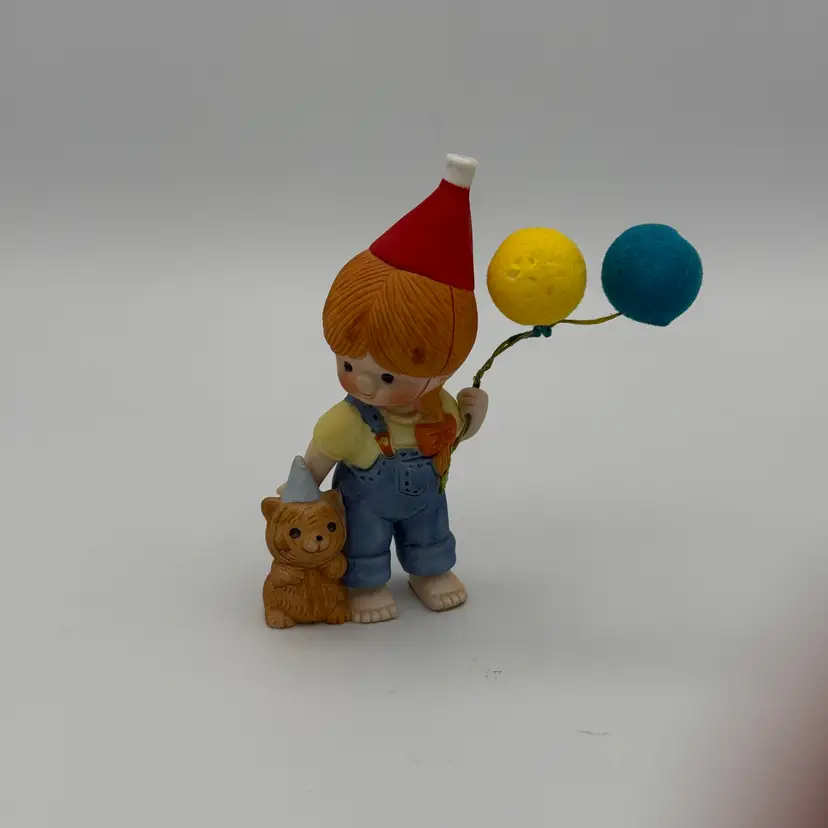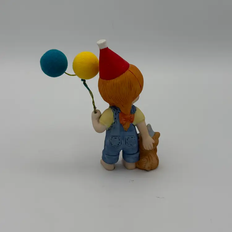 Enesco "1982" Country Cousins Birthday Party Hat and Balloons with Cat Wearing Party Hat. Stands 4" tall. No chips/Cracks.