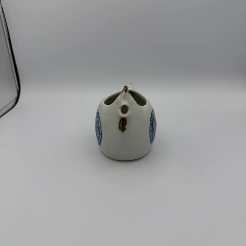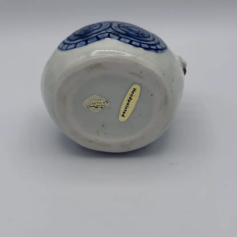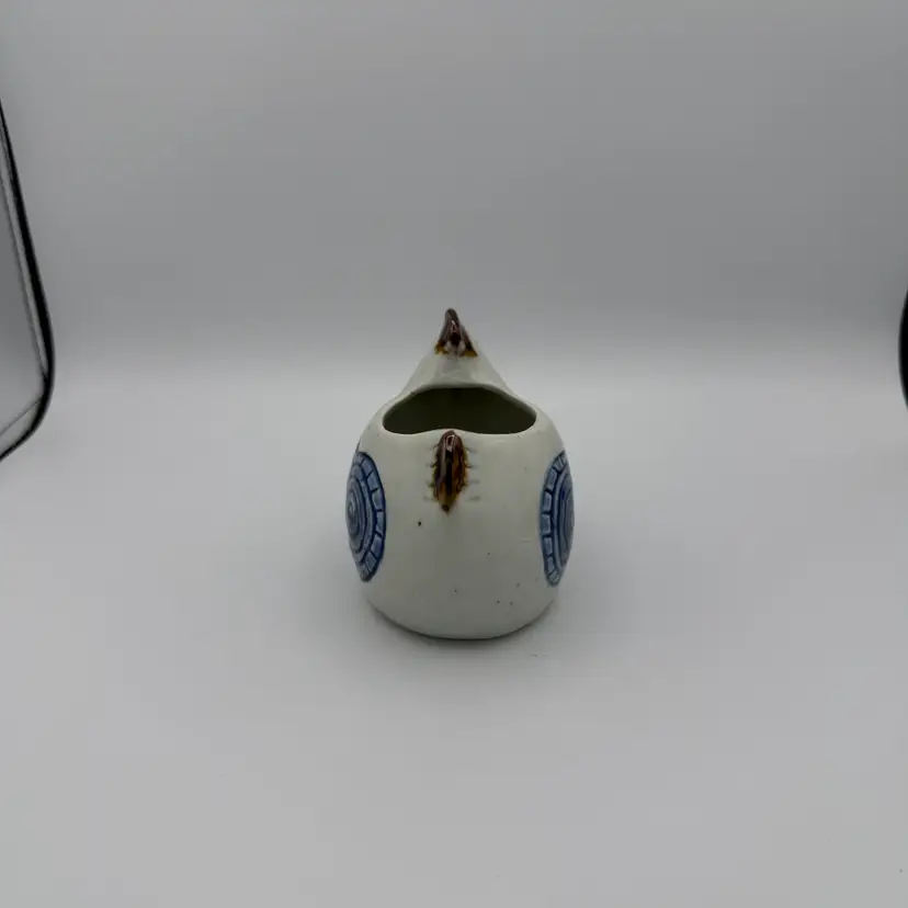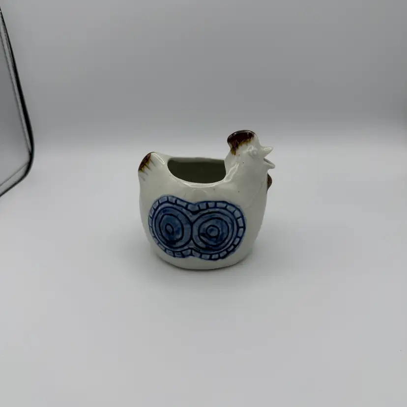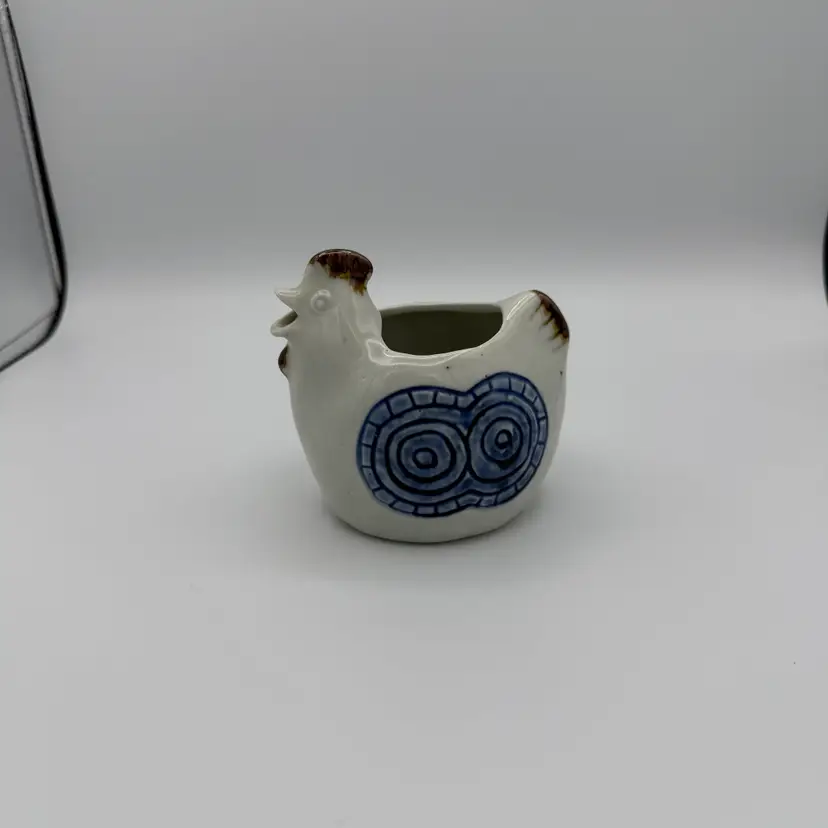 Vintage stoneware chicken creamer made by Otagiri in Happy pattern which features blue circular designs and brown accents. Hand painted. No chips/cracks. 4" tall x 4 1/2" w.
