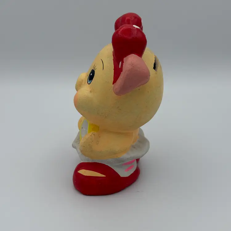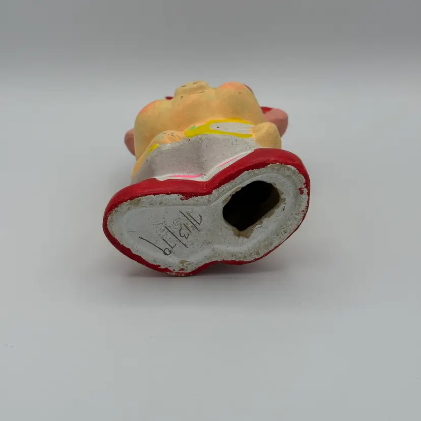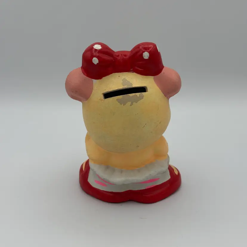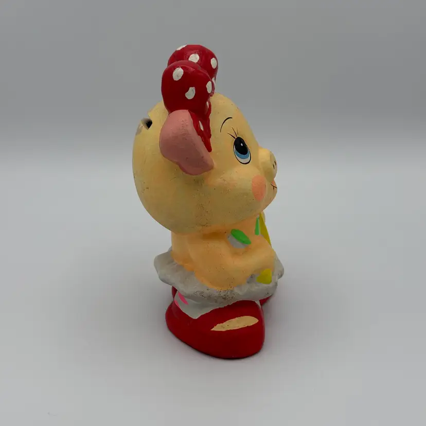 Vintage Ceramic Piggy Bank wearing a red polka dot bow and holding a tennis racket. Does not have stopper. Has some paint loss near coin slot opening (pictured). Some of her paint glows under black light. Super cute vintage piece. Stands 5 1/2" tall.