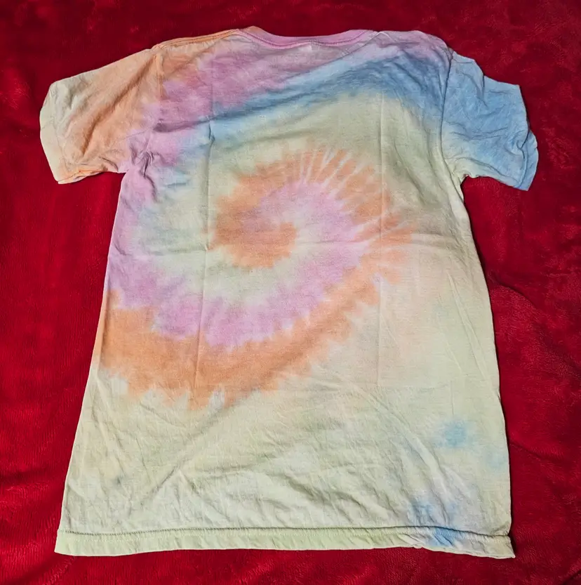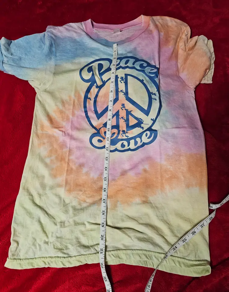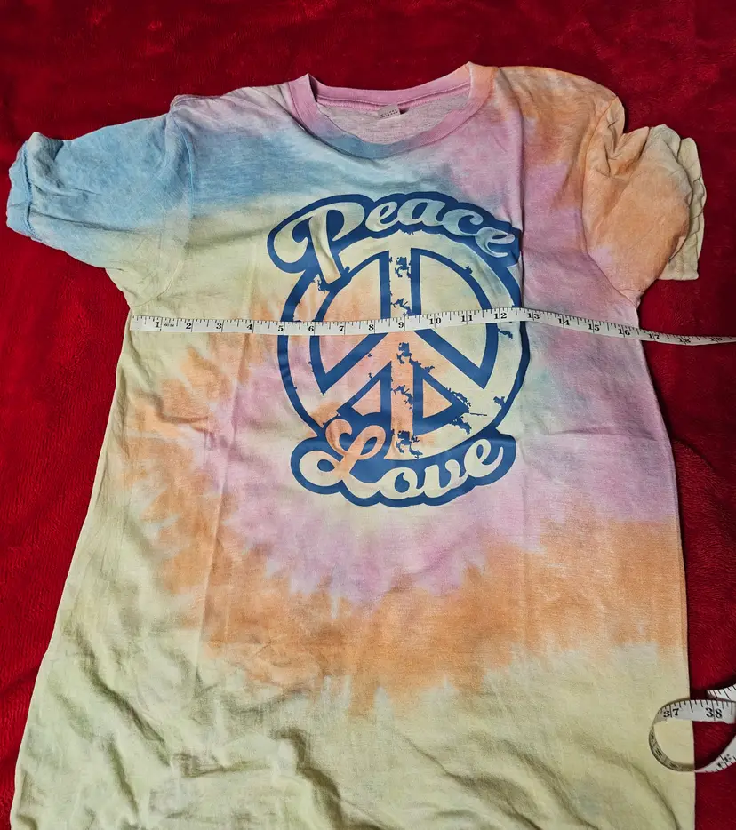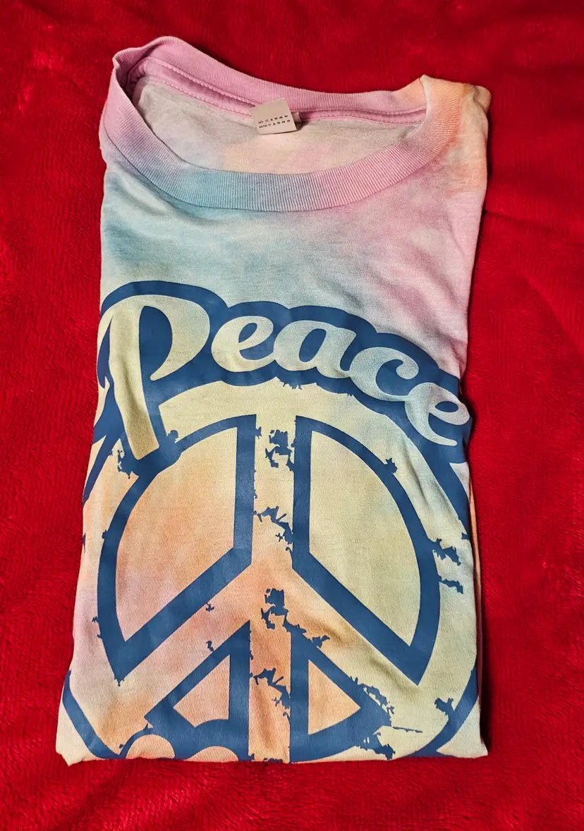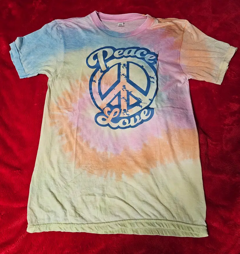 The Peace and Love Rainbow Tie Dye T Shirt in size small is a vibrant and colorful addition to any woman's wardrobe. Made by Colortone, this short sleeve T-shirt features a multicolor design that is sure to make a statement. Perfect for casual wear or as a fun pop of color for a more dressed-up look, this shirt is a versatile and stylish choice for any occasion.
