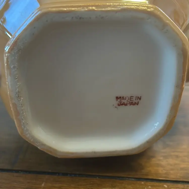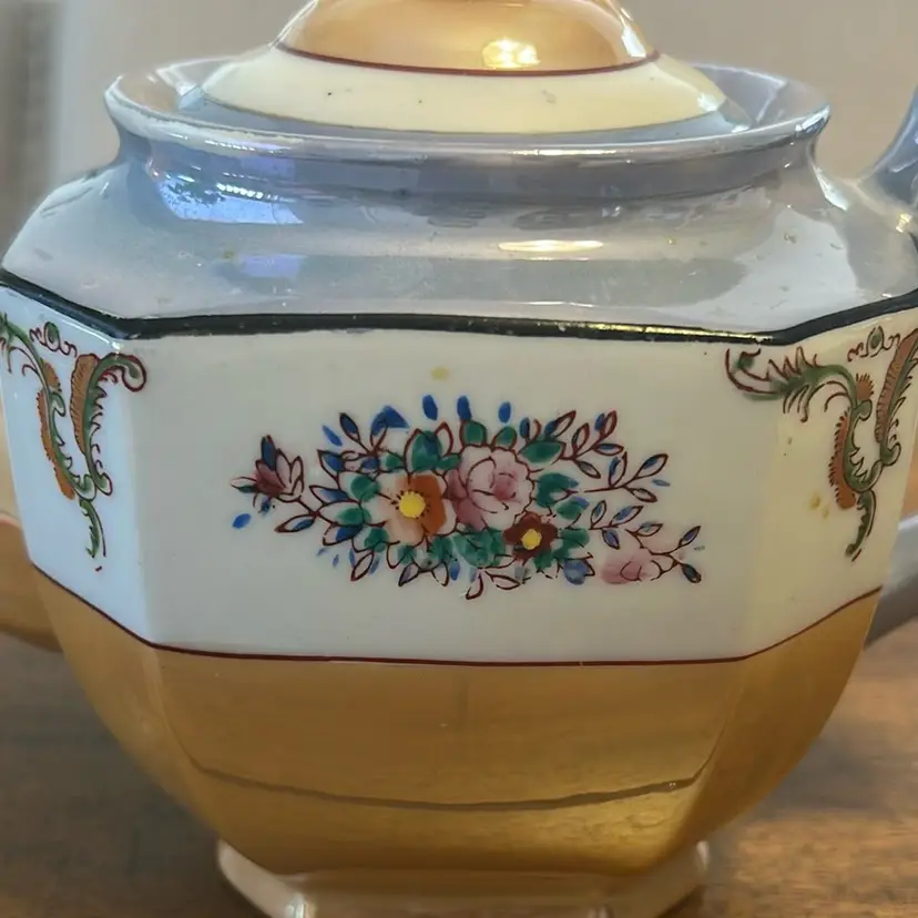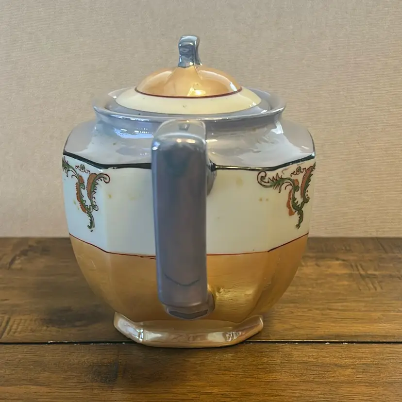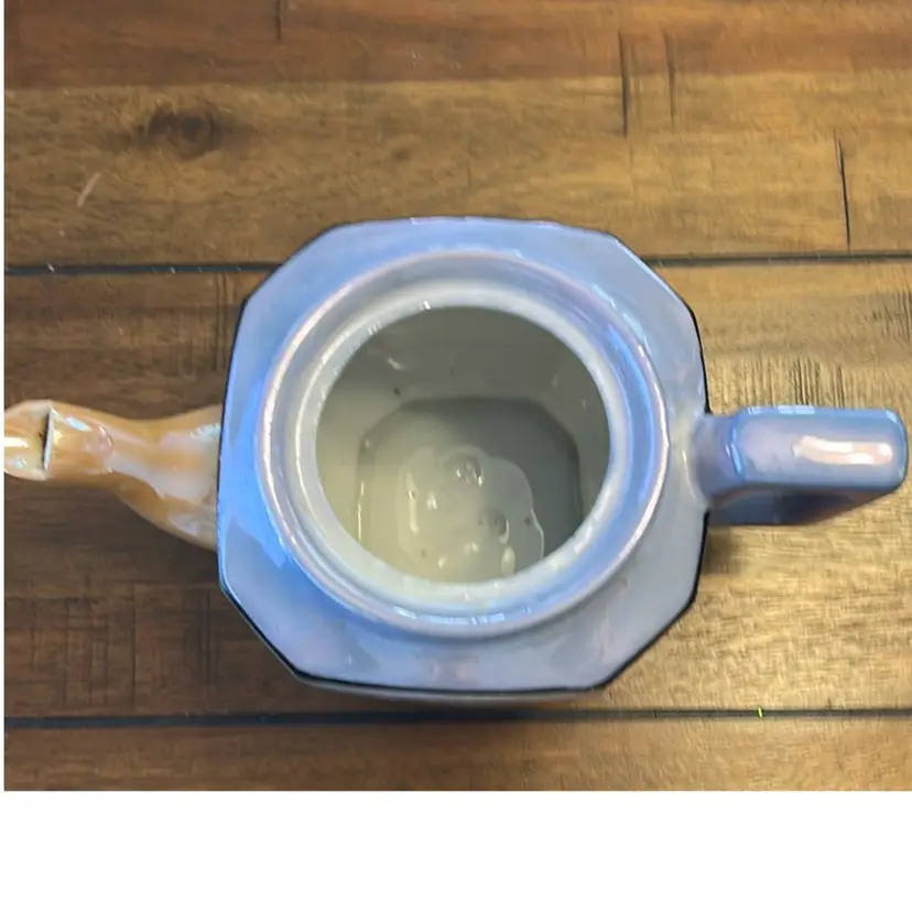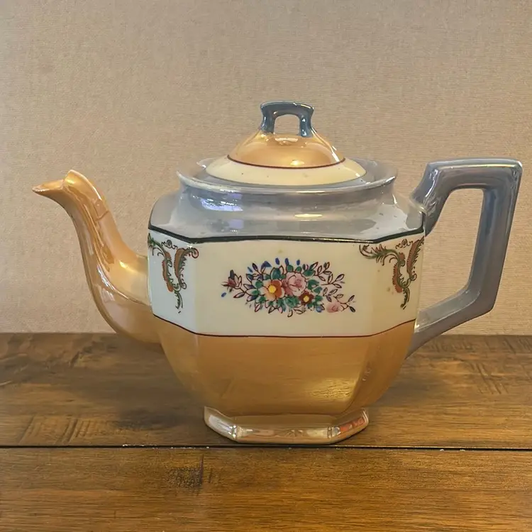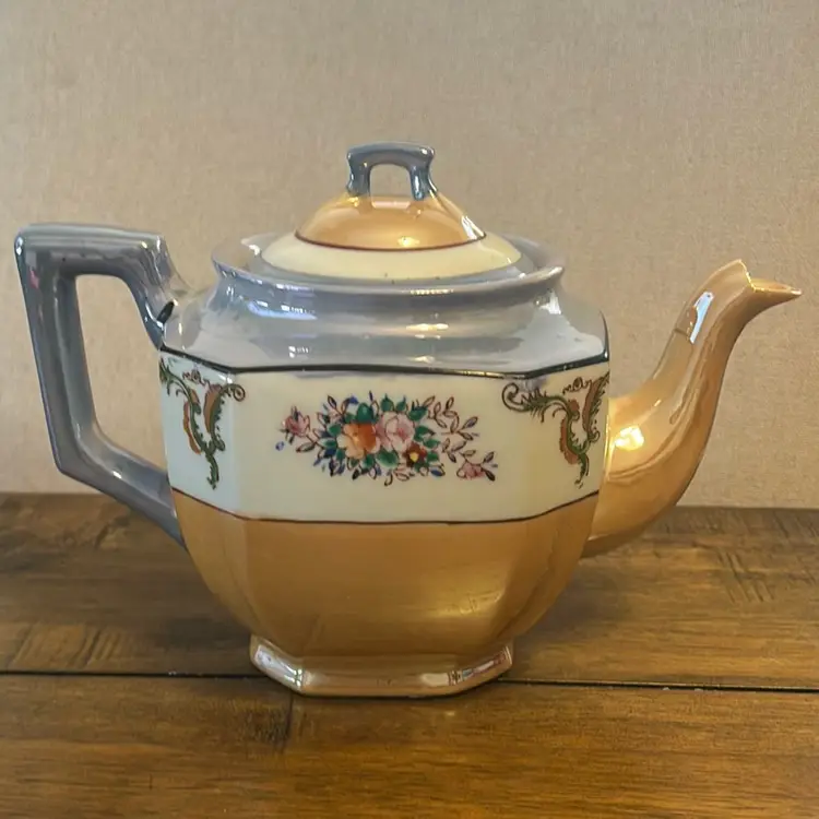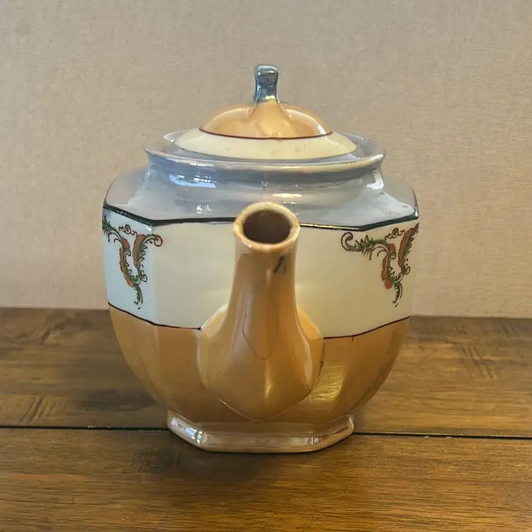 This beautiful Peach And Blue Lusterware Teapot was made in Japan. It is about 6” tall and 8.5” wide.