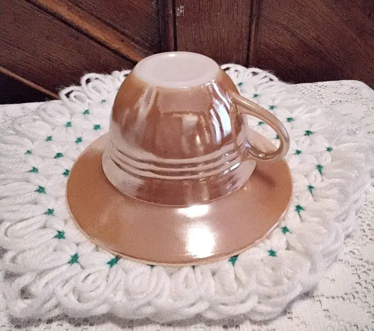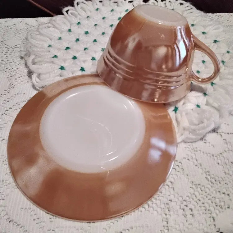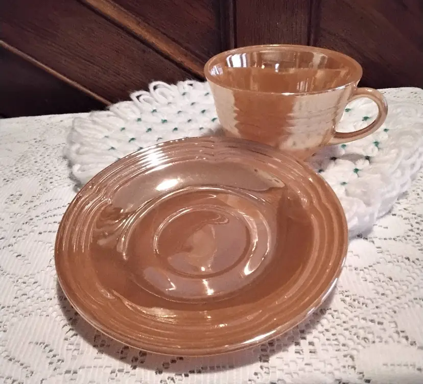 Peach Luster Fire King Coffee/Tea Cup & Saucer. Ribbed Lines Pattern. White Bottoms. Cup is 4.6 inches across opening to end of handle. 2 inches across base of cup. 3 inches tall. Both are in good vintage condition. Photos are part of the description.