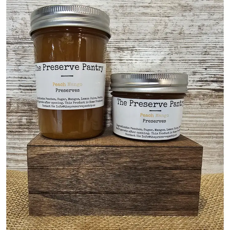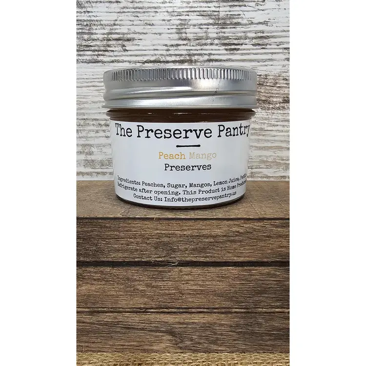 Our Peach Mango Preserves deliver a delectable blend of sweet peaches and tropical mangos. This mouthwatering spread is bursting with juicy flavor in every bite. Made with real peaches and mangos for authentic, fruity taste Sweetened just right to balance the natural tartness of the fruit Versatile - enjoy on toast, pancakes, yogurt, ice cream, and more This all-natural preserve is made simply from fruit, sugar, lemon juice and pectin. The peaches lend a sweet, floral aroma while the mangos provide a tropical twist. Each spoonful delivers a tangy yet mellow flavor with bright, summery notes. Perfect for those with a sweet tooth looking for a fruit-filled treat, Peach Mango Preserves will satisfy your cravings morning, noon or night. Spread on biscuits, swirl into oatmeal or enjoy straight from the jar - this sunshine-filled preserve brings a taste of the tropics to any meal or snack. Ingredients: Peaches, Sugar, Mangos, Lemon Juice, Pectin.