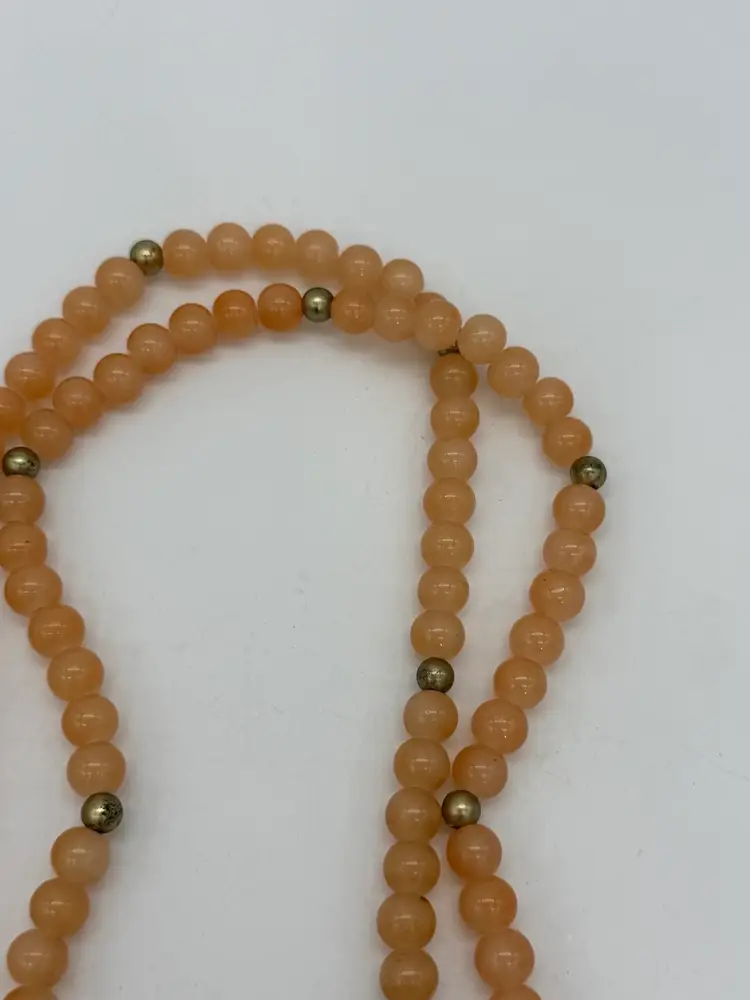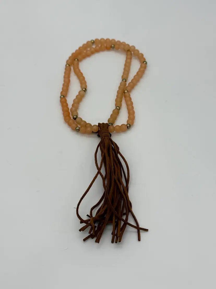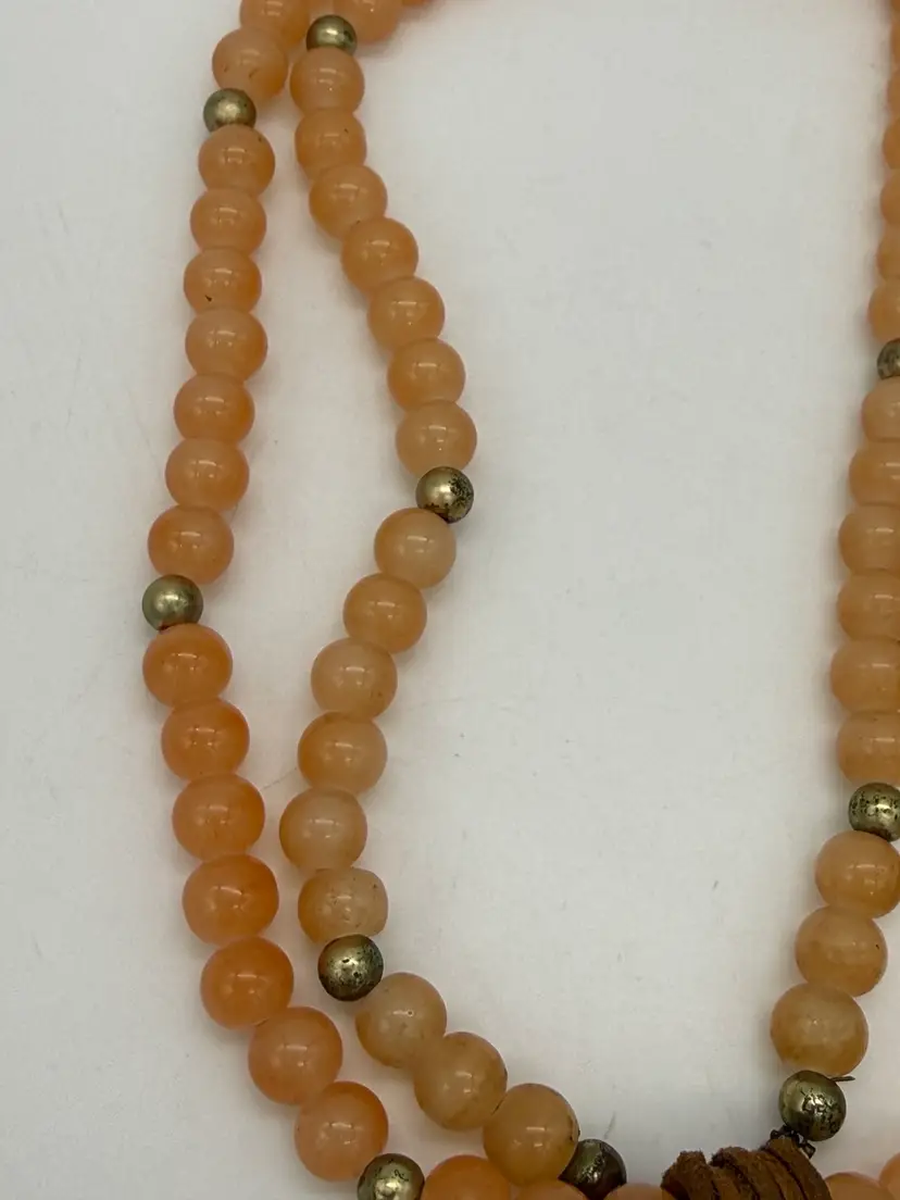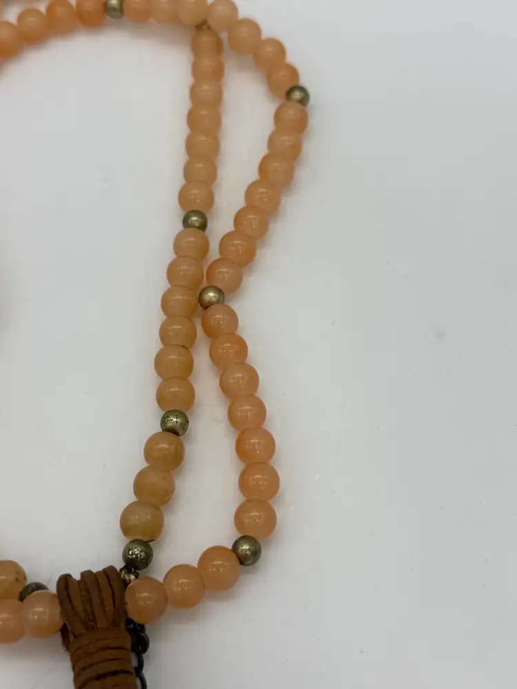 This Peach Polished Moonstone Mala Bead Necklace is 34” long with an adjustable length of 31” & a brass lobster closure. Featuring intricately polished 6mm, moonstone beads with brass accents, leather 6” tassels, and a vintage flair. Handmade with care and attention to detail, this prayer bead necklace embodies a sense of spirituality and uniqueness. Perfect for those seeking a meaningful and stylish accessory to add to their collection or for use in meditation or prayer practices. In very good vintage pre-owned condition, many need a little brass cleaning according to the buyers preferences.