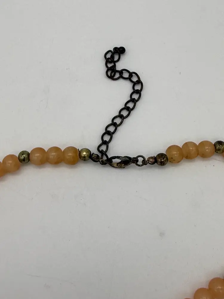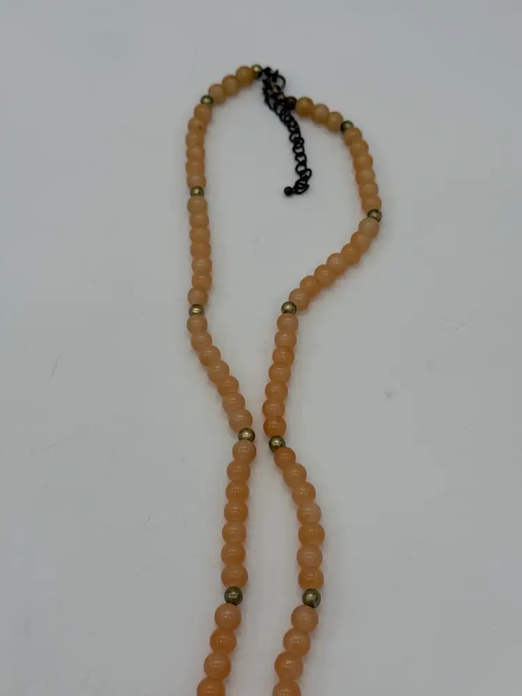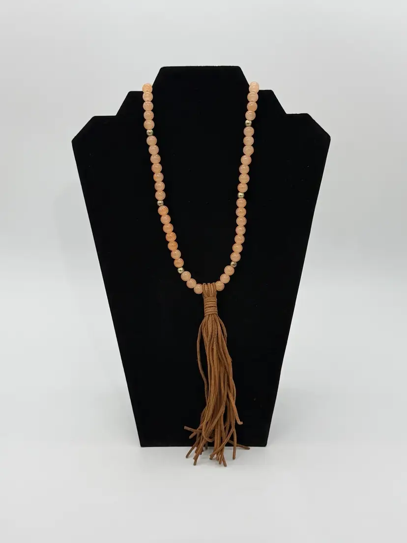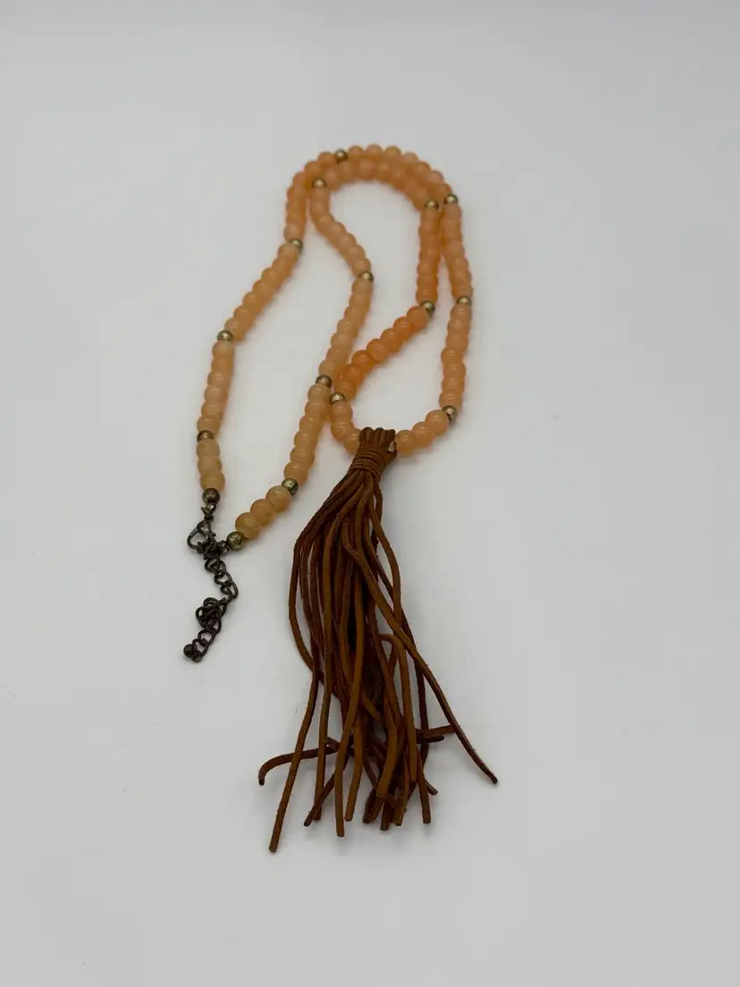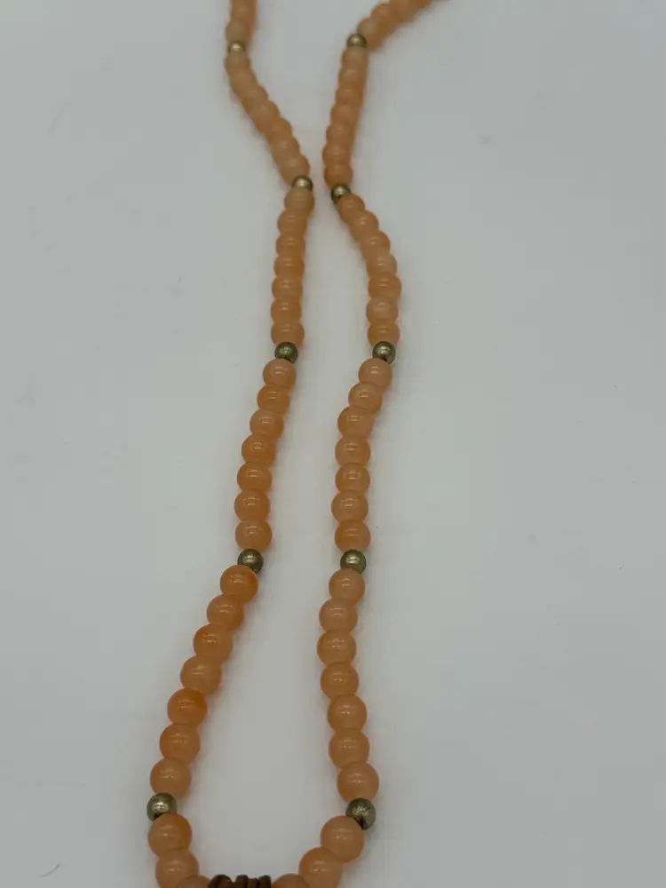 This Peach Polished Moonstone Mala Bead Necklace is 34” long with an adjustable length of 31” & a brass lobster closure. Featuring intricately polished 6mm, moonstone beads with brass accents, leather 6” tassels, and a vintage flair. Handmade with care and attention to detail, this prayer bead necklace embodies a sense of spirituality and uniqueness. Perfect for those seeking a meaningful and stylish accessory to add to their collection or for use in meditation or prayer practices. In very good vintage pre-owned condition, many need a little brass cleaning according to the buyers preferences.