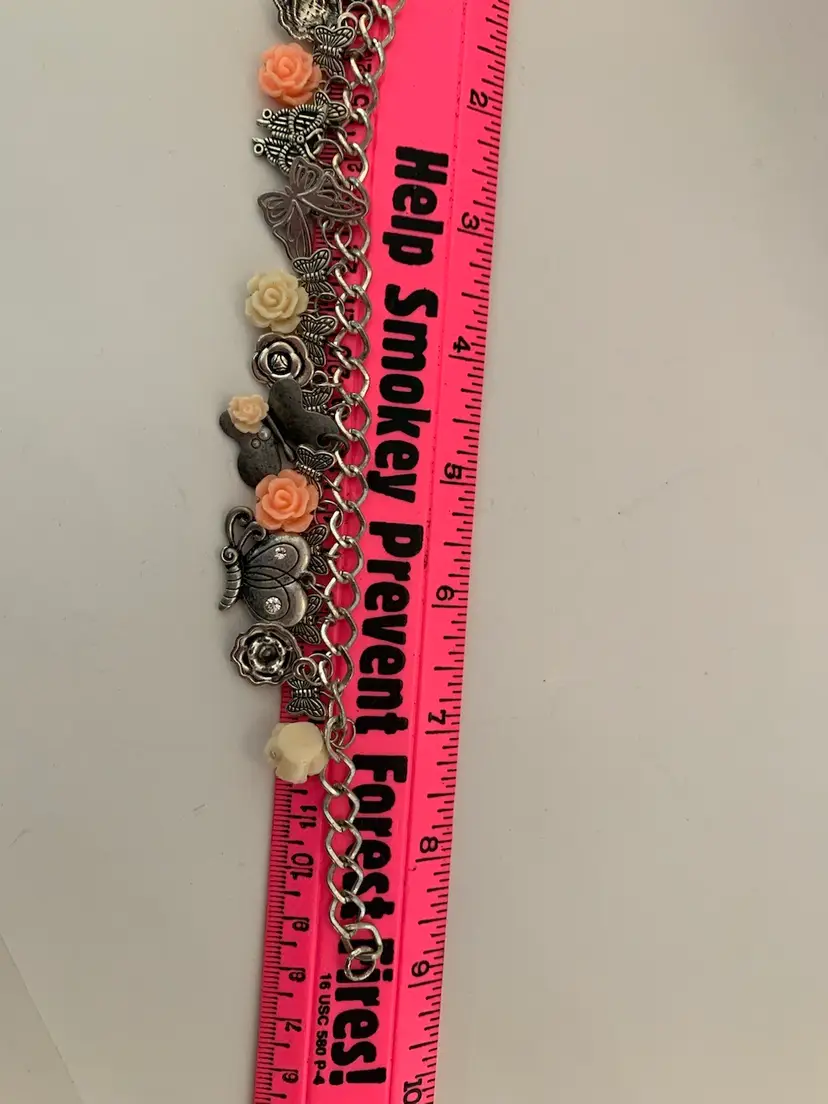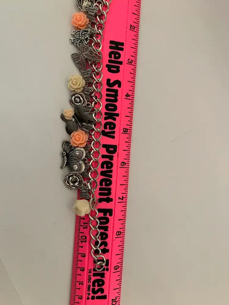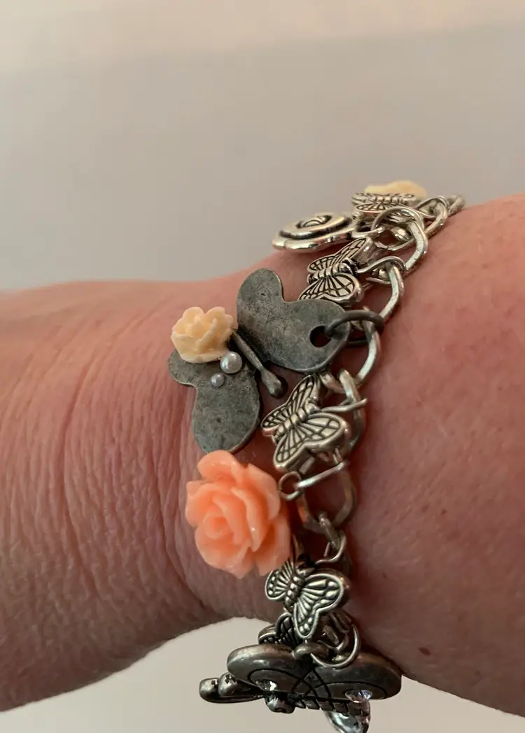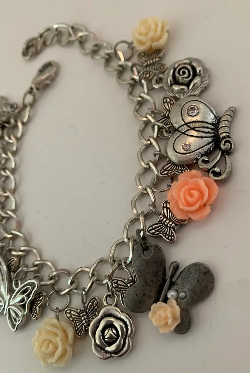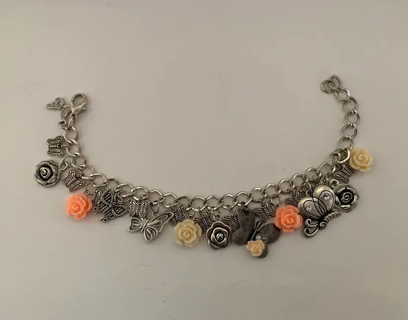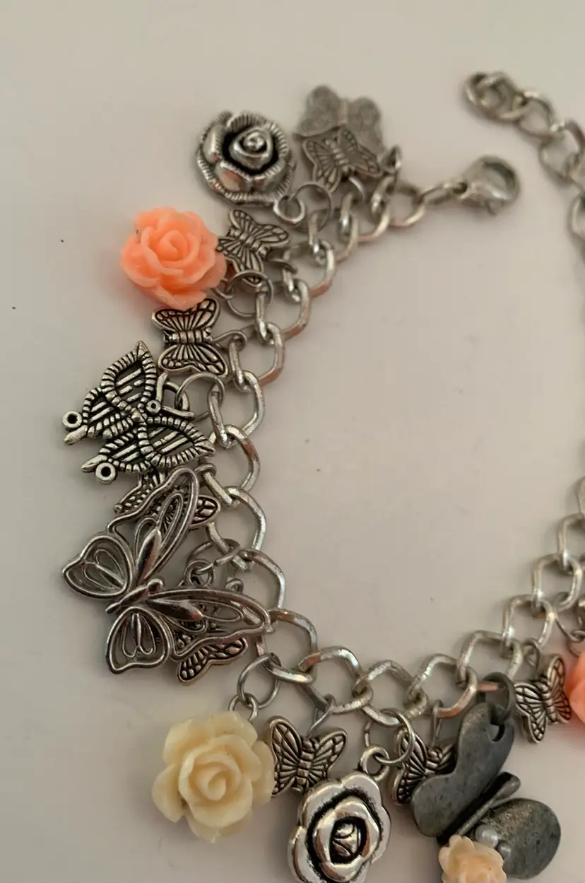 Peach and cream colored resin rose charms mingled with silver toned butterfly charms on a silver toned chain. Measures 9” in length.