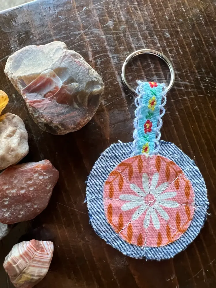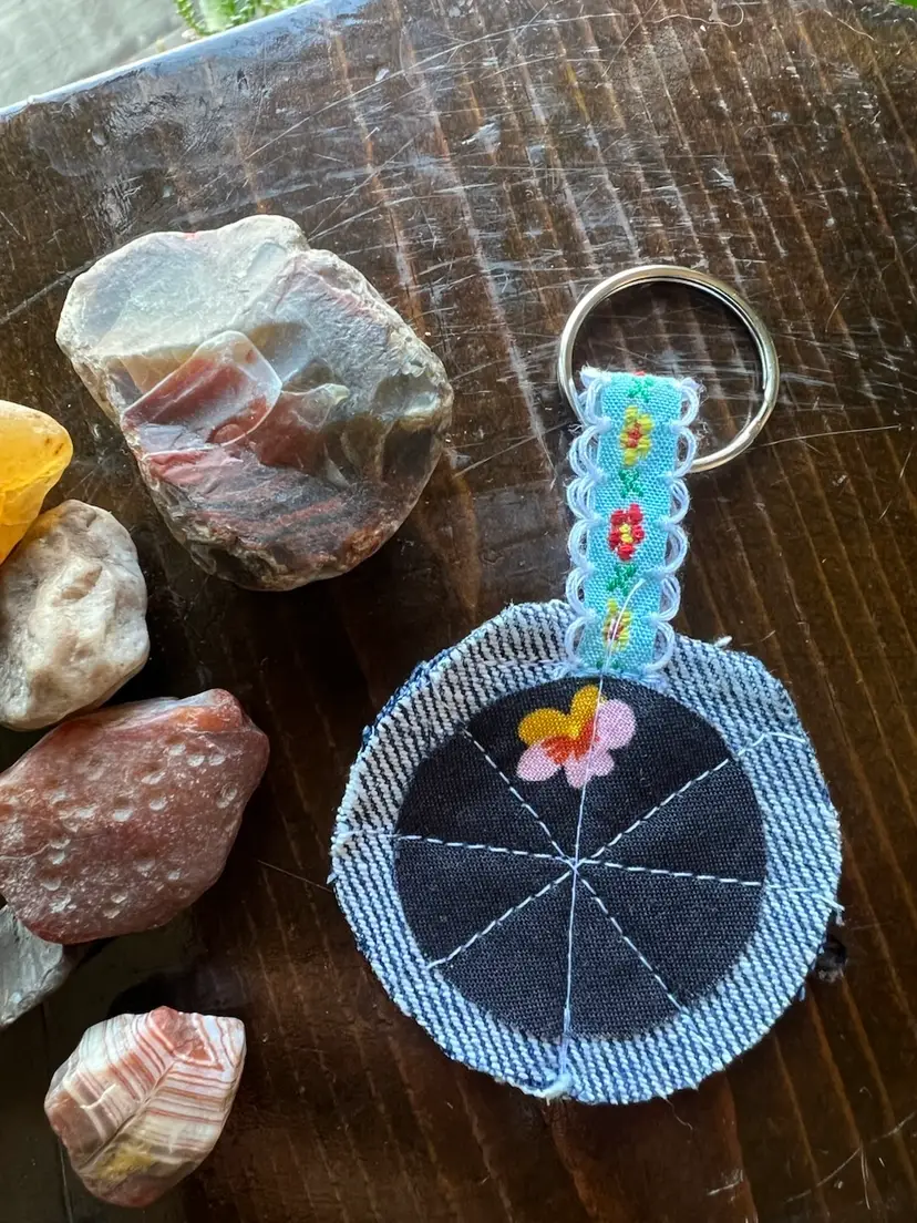 Upcycled denim and scrap fabric made into cute key chain. All profits will be donated to local mutual aid through prismmpls.org. Key chains have been donated by my dear friend Susie (@patchworksusannas IG). Rocks are not included with purchase 😉