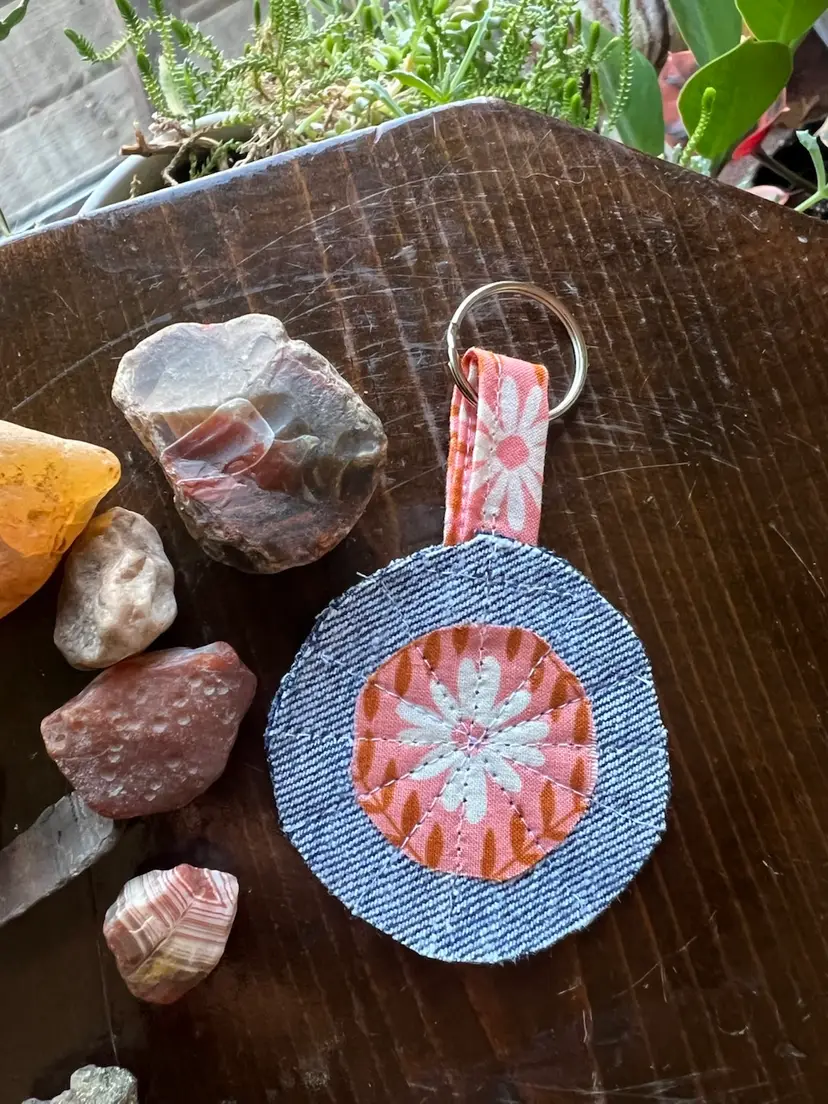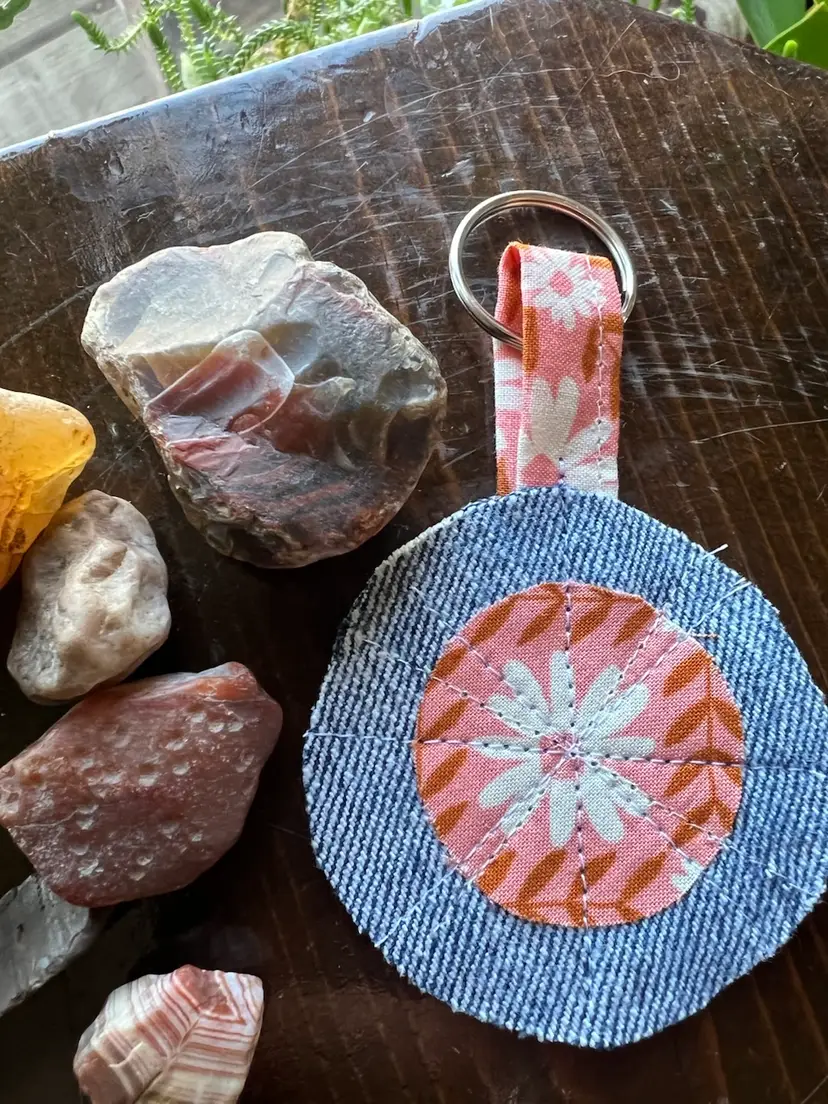Upcycled denim and scrap fabric made into cute key chain. All profits will be donated to local mutual aid through prismmpls.org. Key chains have been donated by my dear friend Susie (@patchworksusannas IG). Rocks are not included with purchase 😉